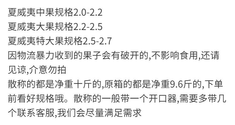 | Packaging specifications | Small fruit net weight 2.5kg ordinary box [shuangheng factory direct sales],Gift delivery in original box, net weight 4.8kg zhongguo [shuangheng factory direct sales],Gift delivery in original box, net weight 4.8kg large fruit [shuangheng factory direct sales],Small fruit net weight 5kg ordinary box [shuangheng factory direct sales],Large fruit net weight 5kg ordinary box [shuangheng factory direct sales],Net weight of extra large fruit 5kg ordinary boxes [shuangheng factory direct sales],Large fruit net weight 2.5kg ordinary box [shuangheng factory direct sales],Extra large fruit net weight 2.5kg ordinary box [shuangheng factory direct sales] |