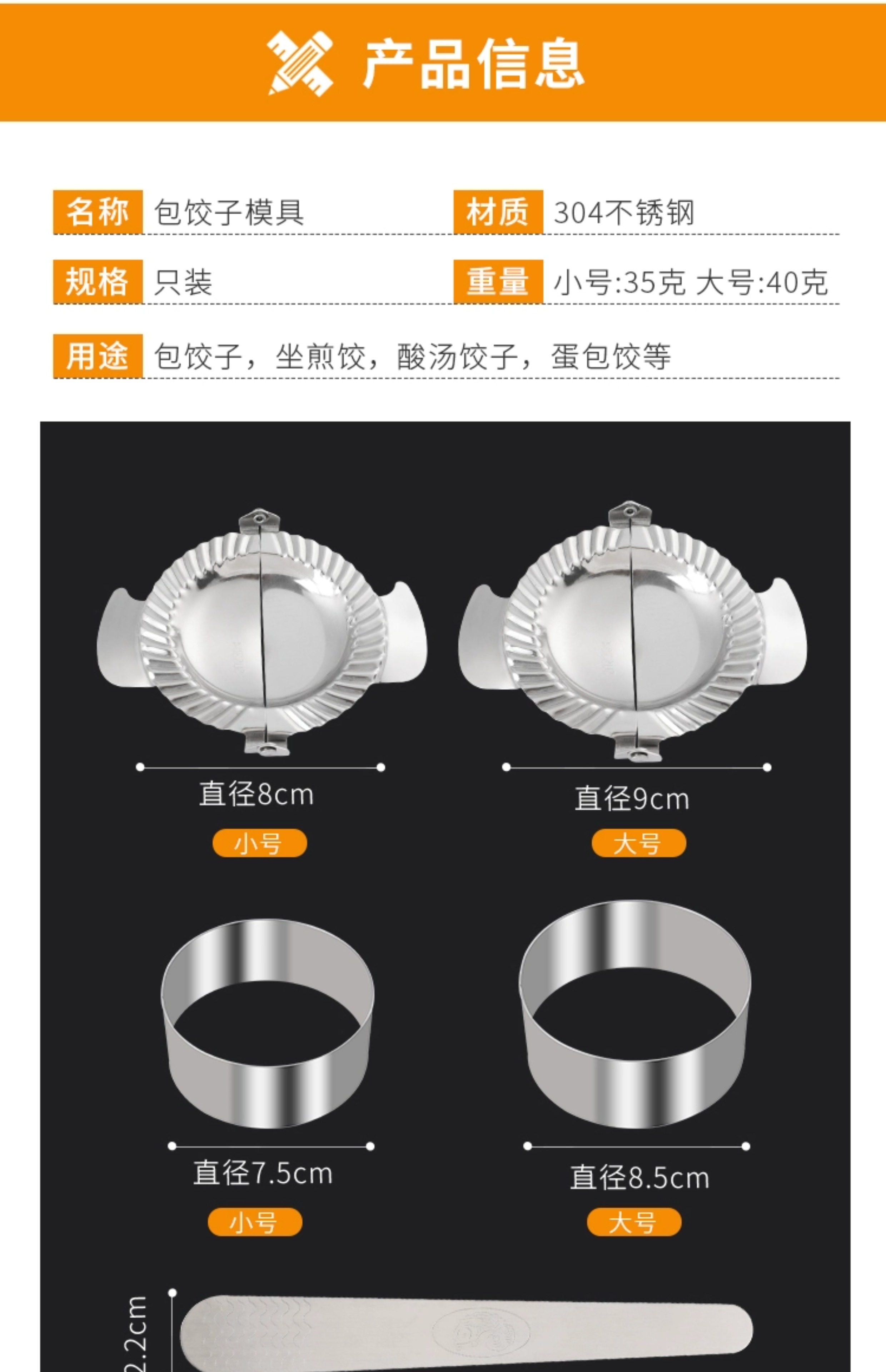 | Specification | ★ ☆ Small dumpling maker + skin cutter ★ ☆,★ ☆ Small dumpling maker + skin cutter + stuffing spoon ★ ☆,★ ☆ Small dumpling maker ★ ☆,★ ☆ Large dumpling maker + skin cutter ★ ☆,★ ☆ Large dumpling maker + skin cutter + stuffing spoon ★ ☆,★ ☆ Large dumpling maker ★ ☆ |