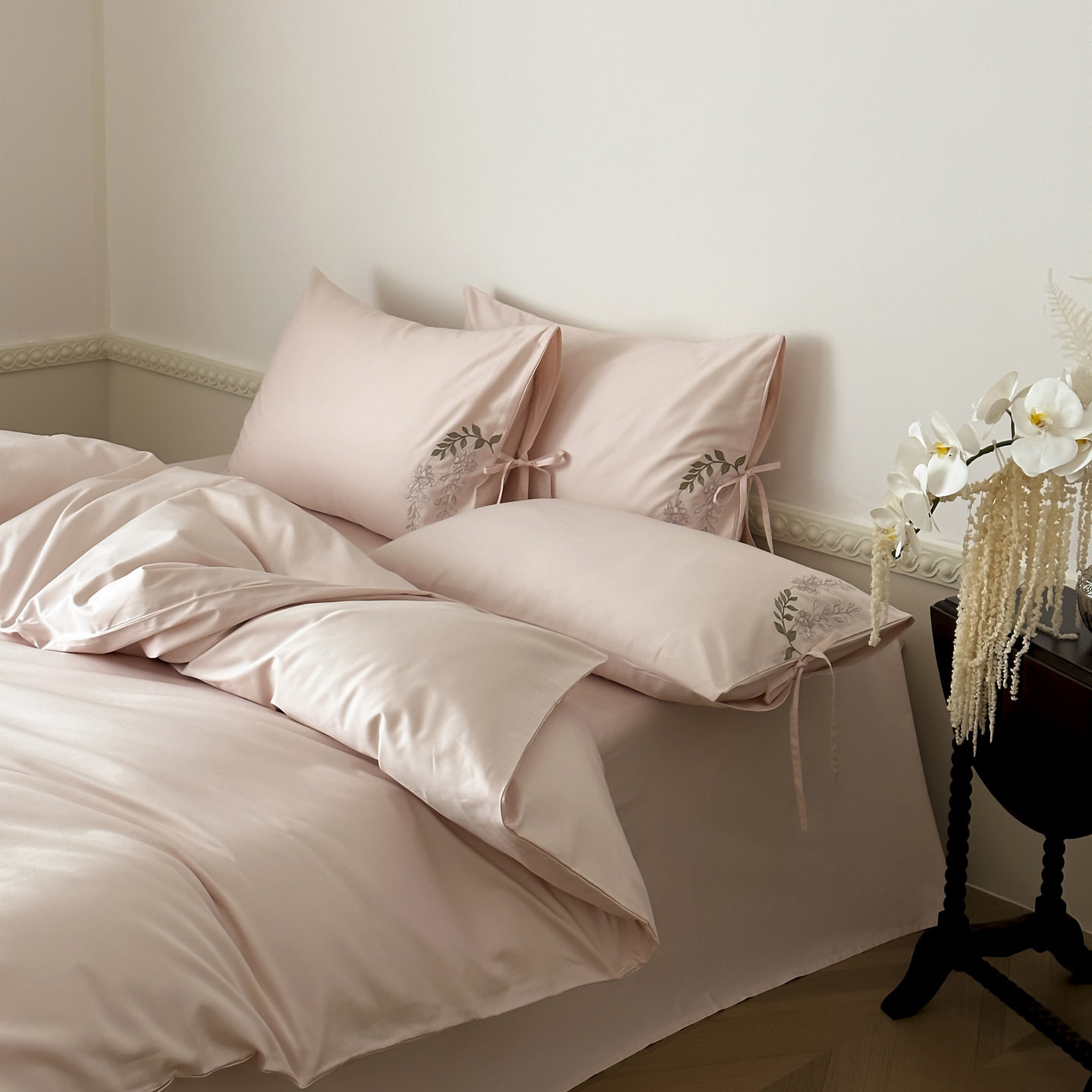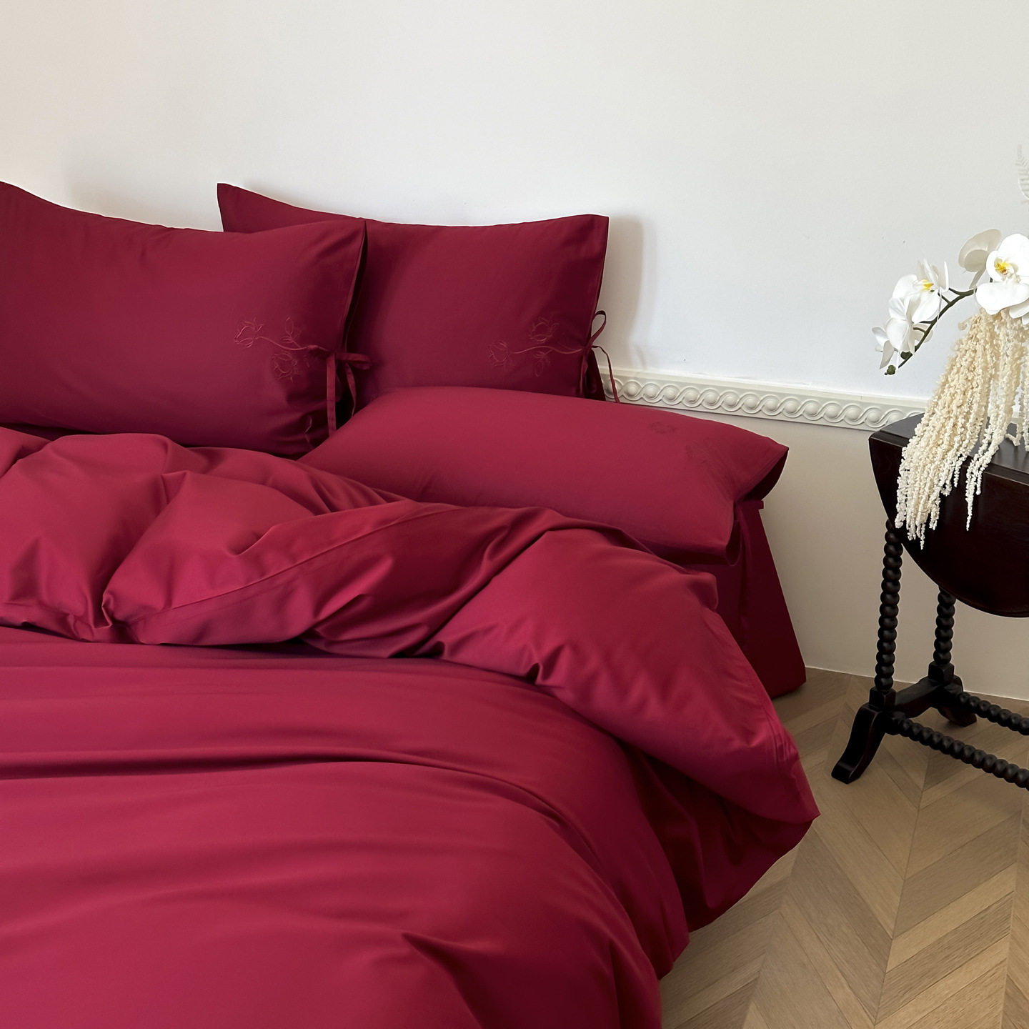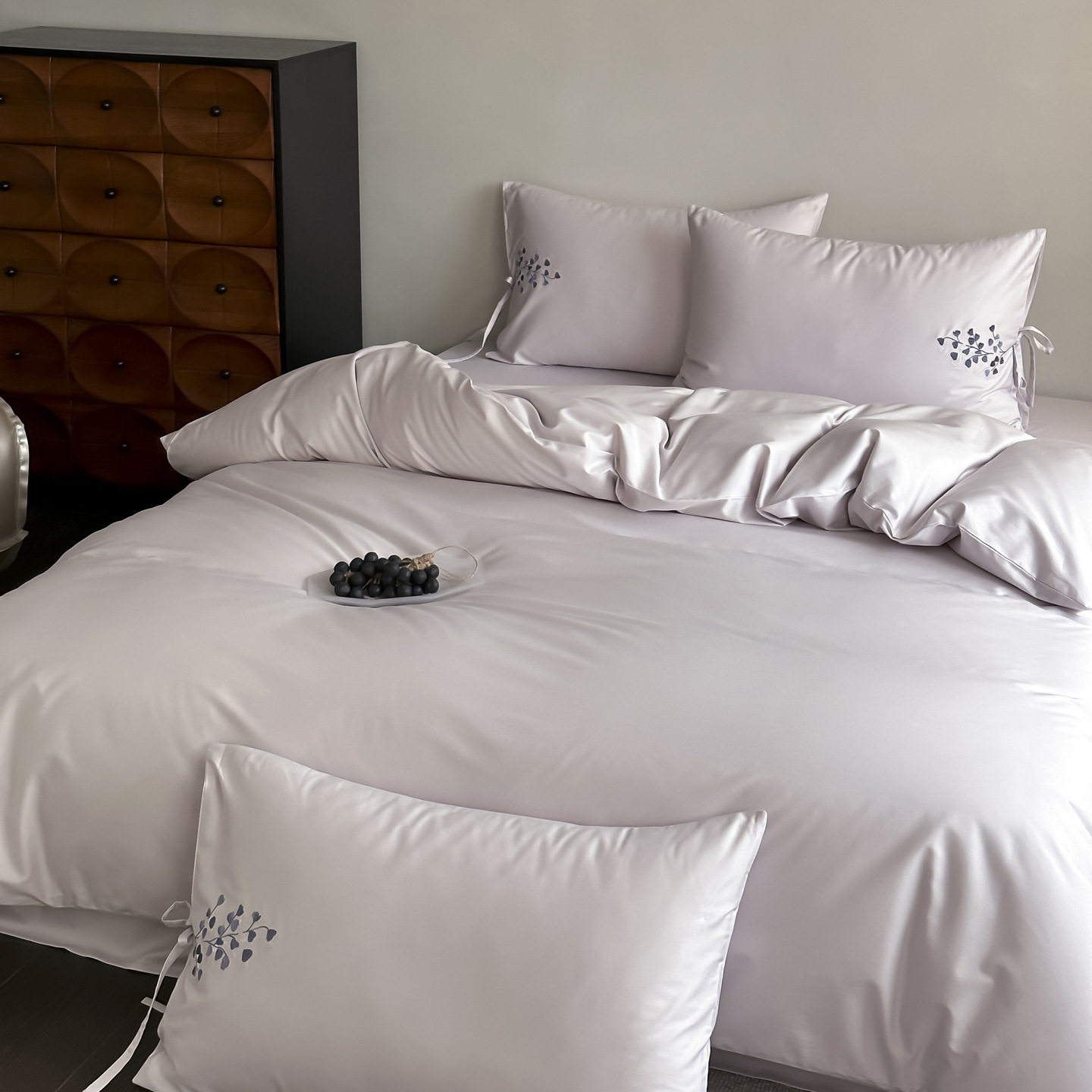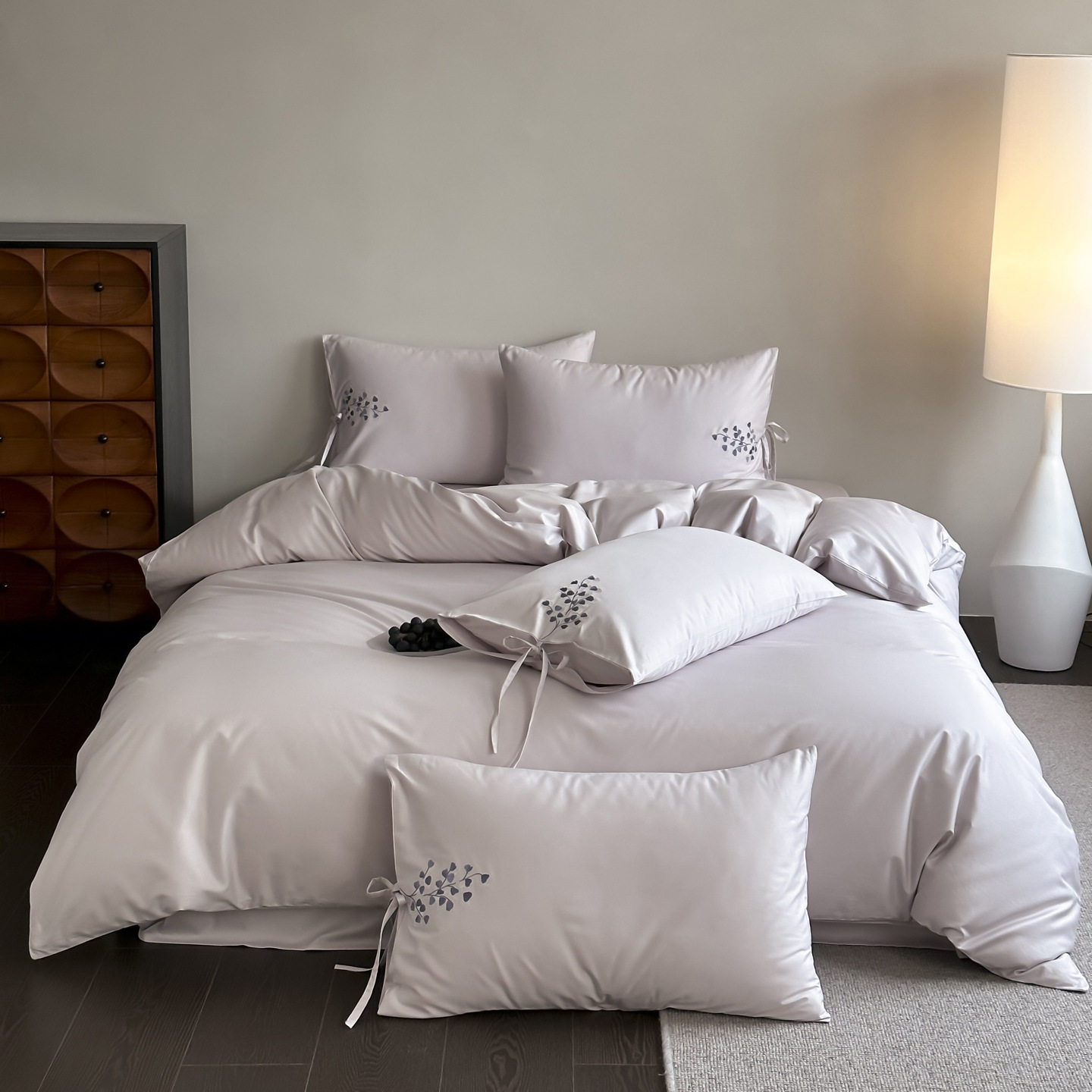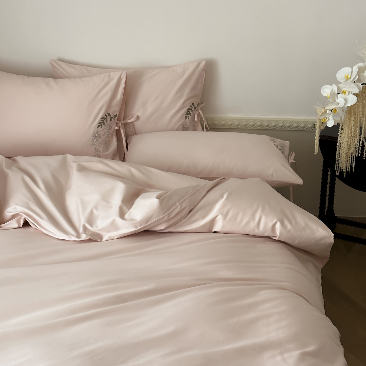 High-End Feel! Class a 100-Count Long-Staple Cotton Four-Piece Set, Solid Color Embroidered Bow Pillowcase, Pure Cotton Duvet Cover, Bed Sheet