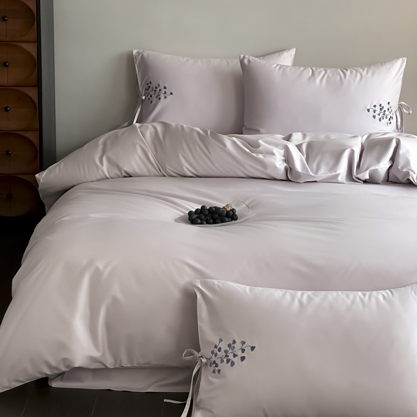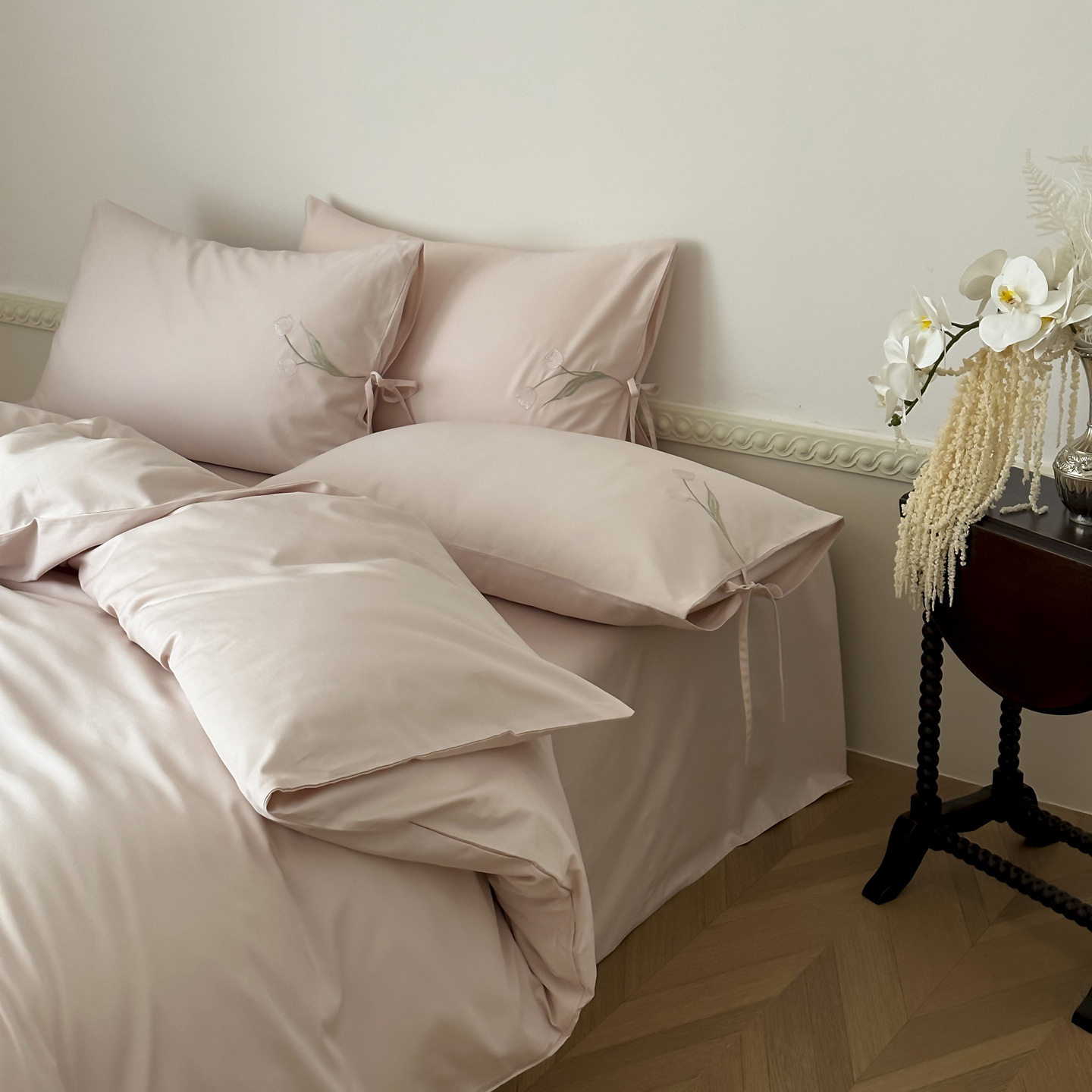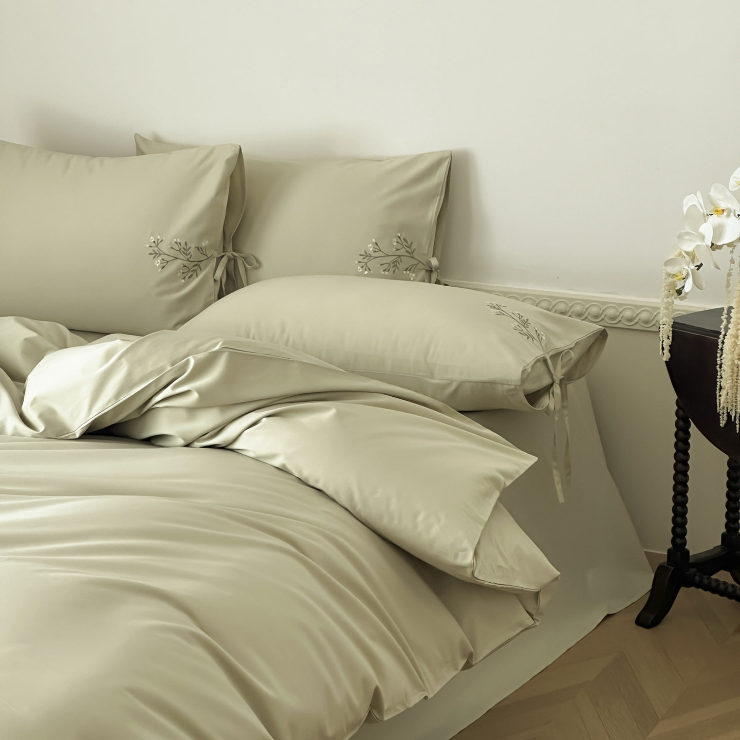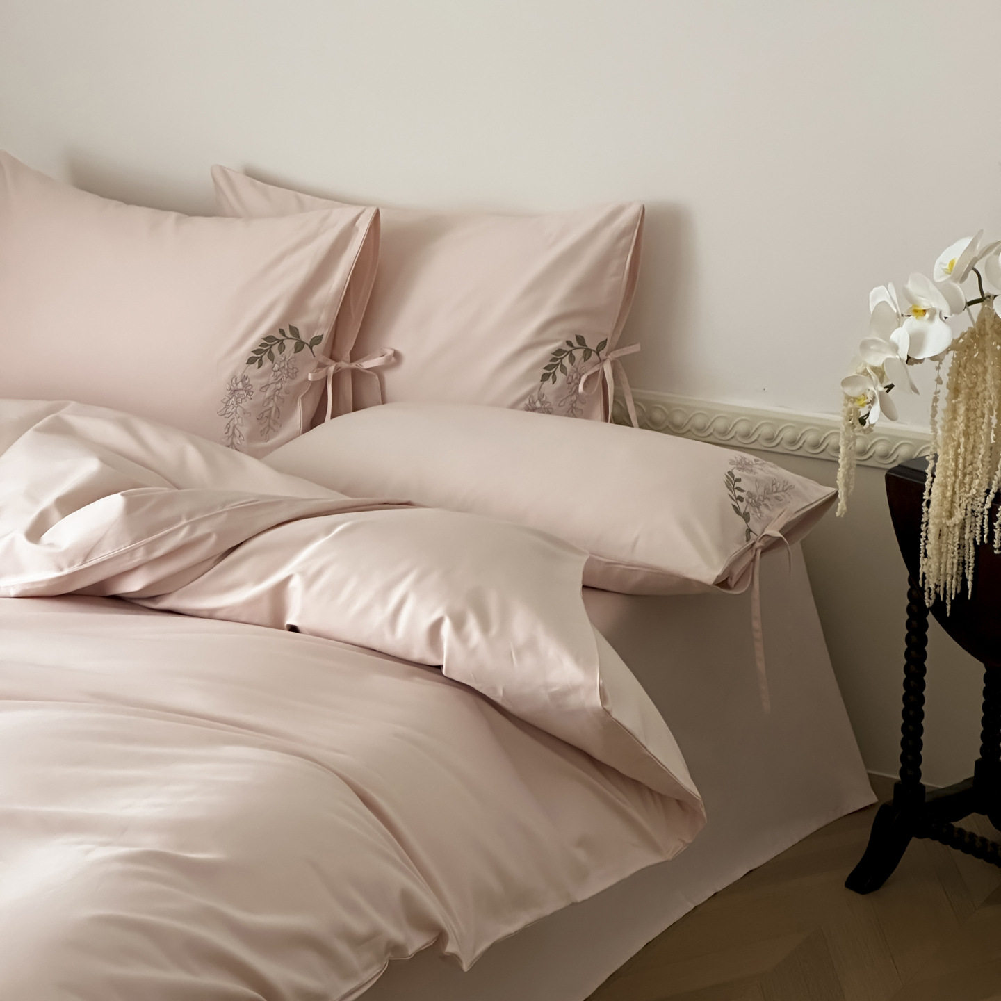 High-End Feel! Class a 100-Count Long-Staple Cotton Four-Piece Set, Solid Color Embroidered Bow Pillowcase, Pure Cotton Duvet Cover, Bed Sheet