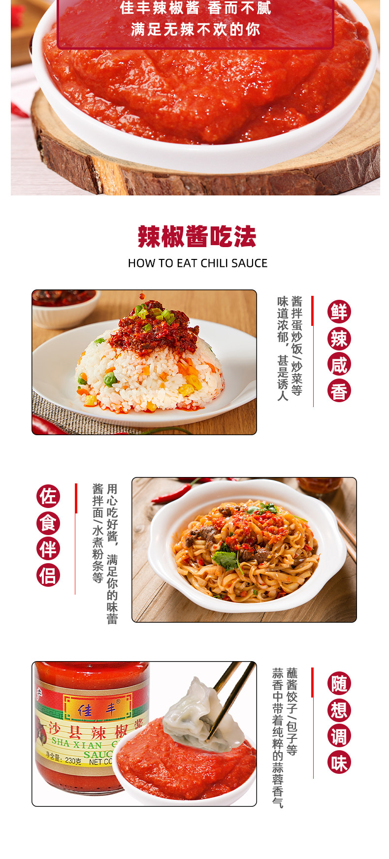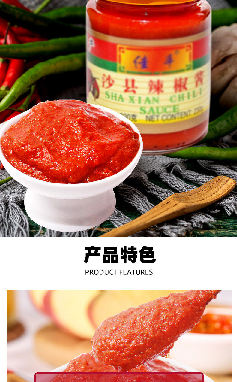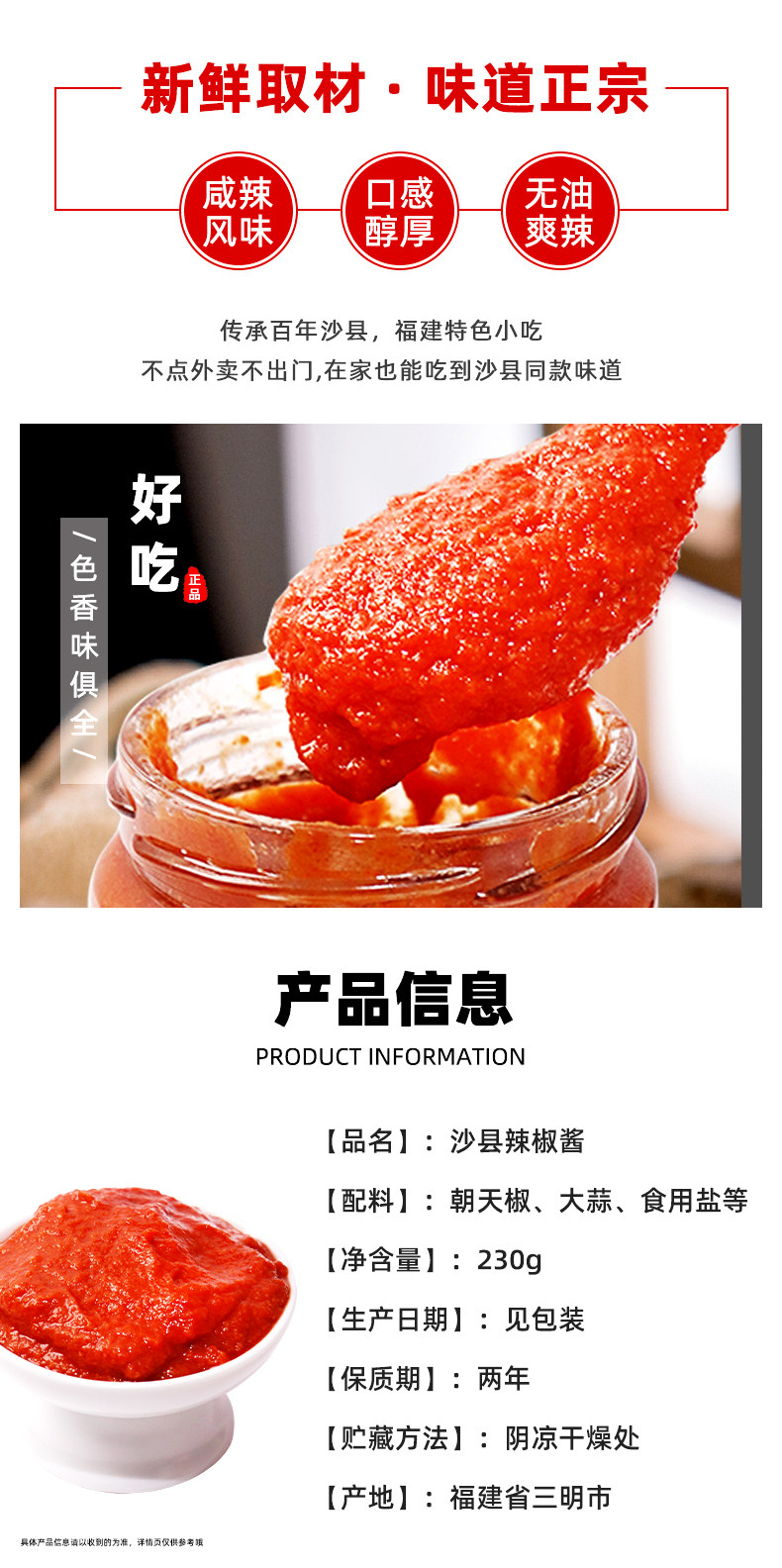 | Packaging specifications | Shaxian chili sauce 230g (1 bottle),Shaxian chili sauce 230g (2 bottles),Shaxian chili sauce 230g (4 bottles),Peanut noodle sauce 500g (1 bottle) |