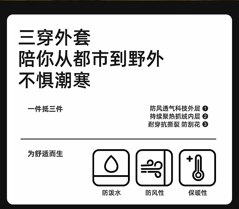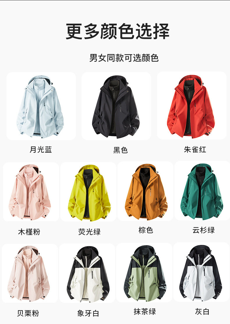 | Color | Moonlight blue-single jacket,Ivory-single coat,Suzaku red-single jacket,Fluorescent green-single jacket,Black-single jacket,Gray-single jacket,Matcha green-single jacket,Moonlight blue three-in-one,Ivory white three-in-one,Suzaku red three-in-one,Fluorescent green three-in-one,Black three-in-one,Gray and white three-in-one,Matcha green three-in-one,Spruce green three-in-one,Brown three-in-one,Mujin powder three-in-one,Beeli powder three-in-one |