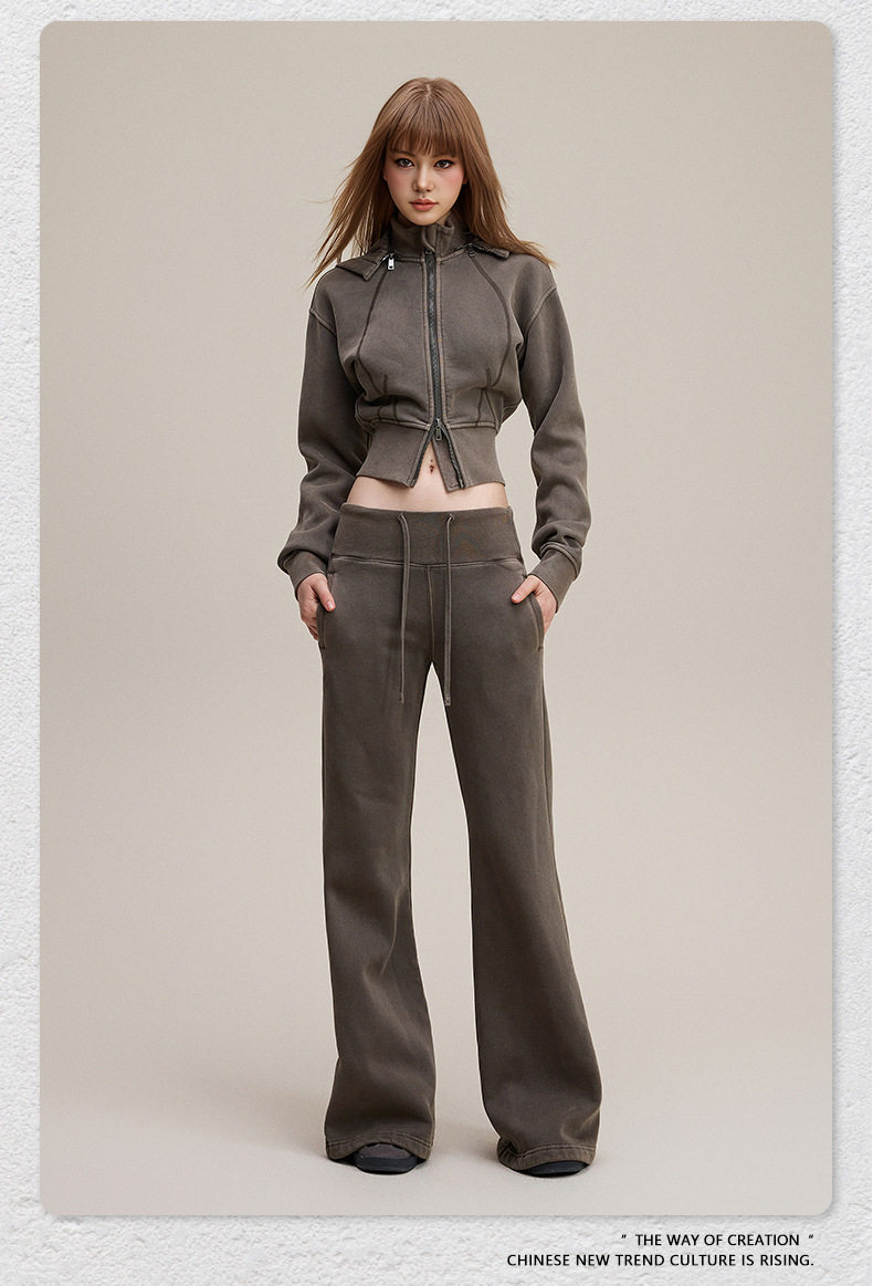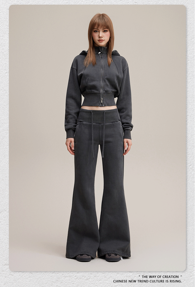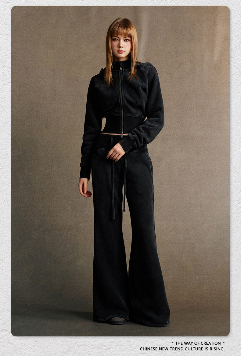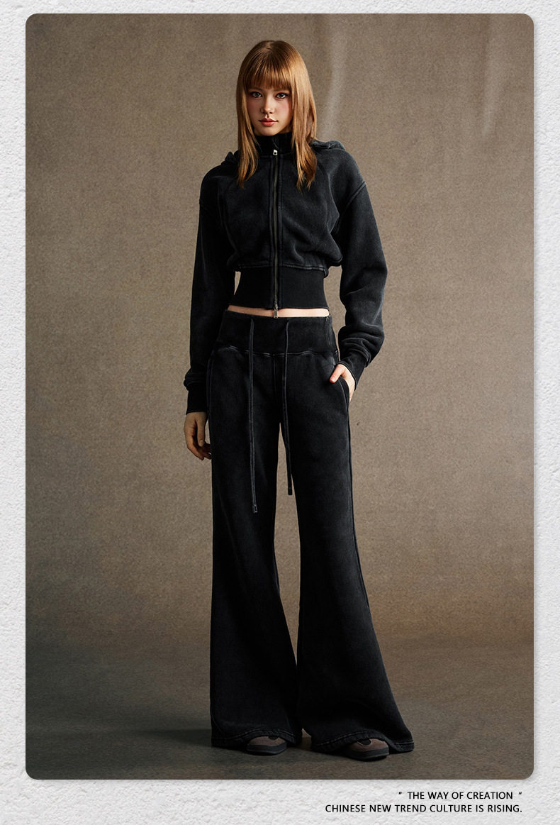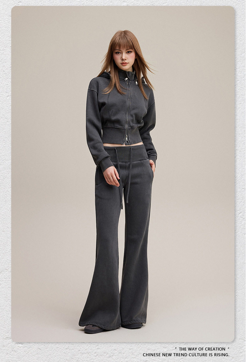 Street Style Retro Washed Sports Detachable Cardigan Hooded Sweatshirt Outdoor Micro-Flared Slim Trousers Suit for Women