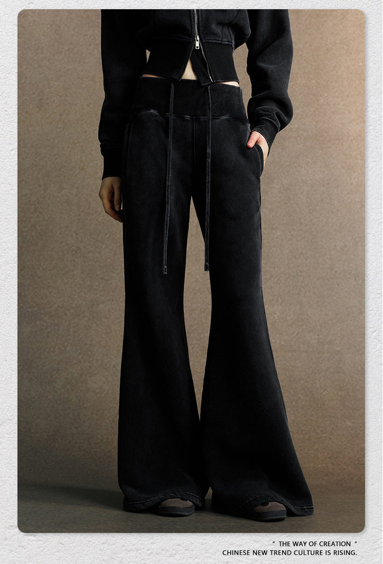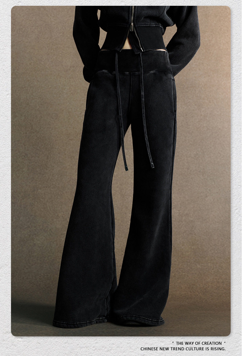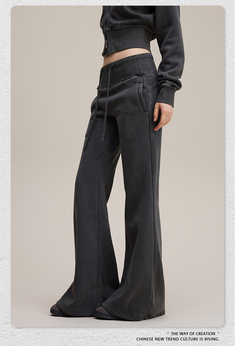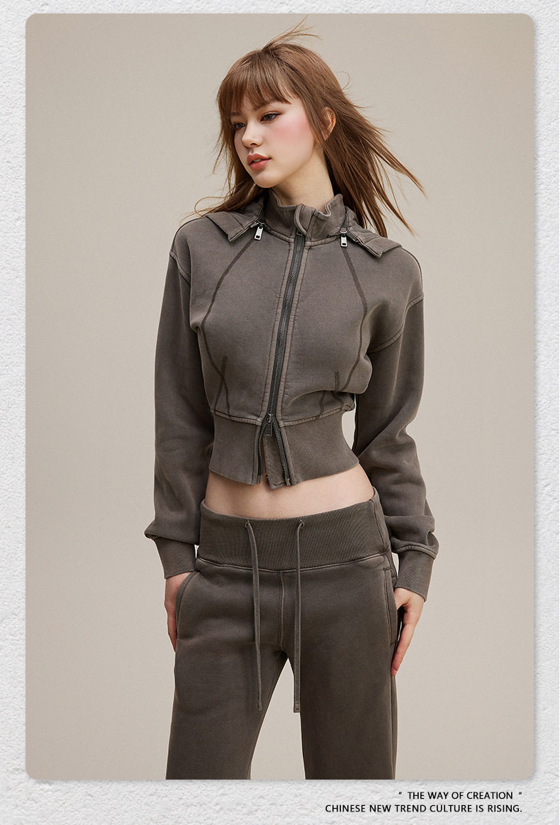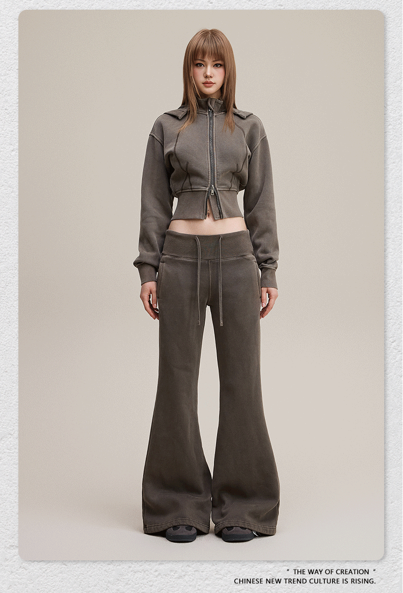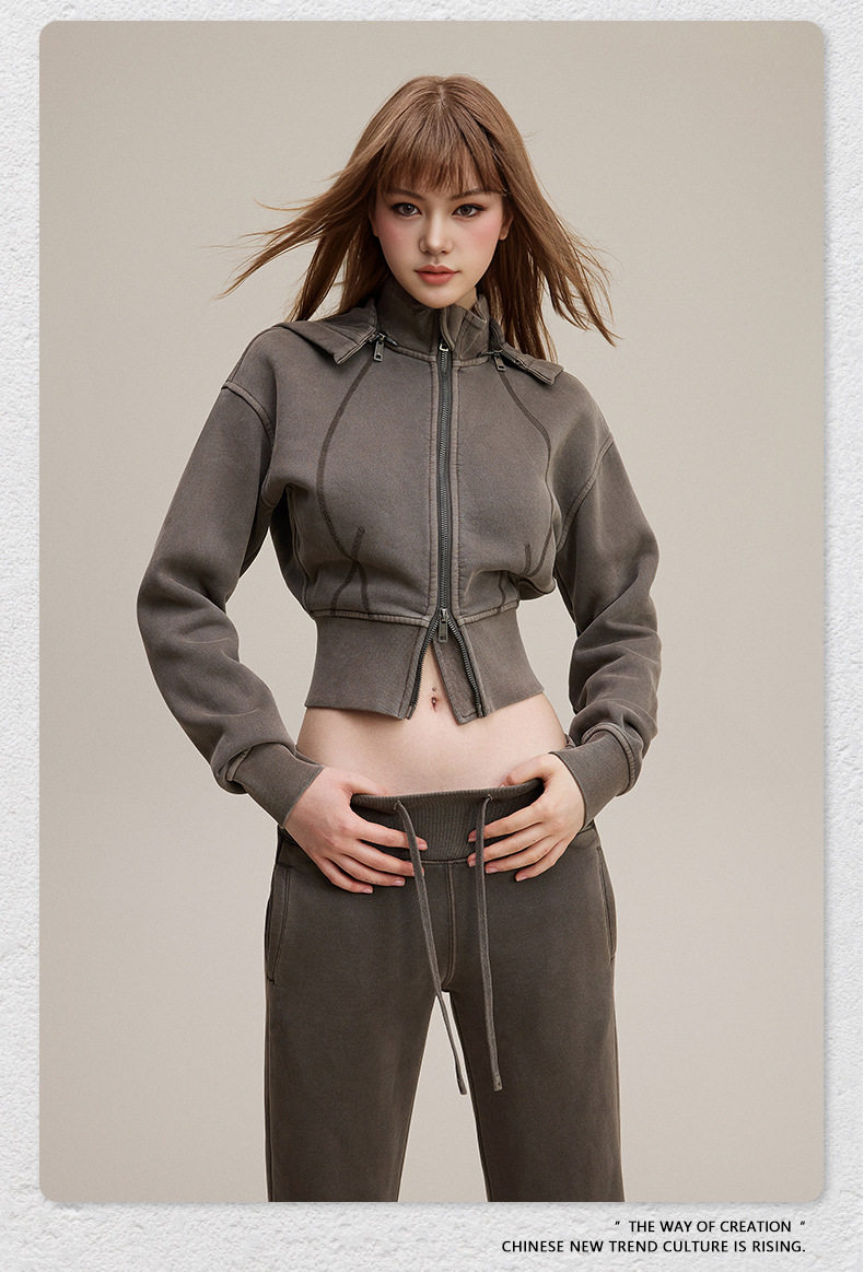 Street Style Retro Washed Sports Detachable Cardigan Hooded Sweatshirt Outdoor Micro-Flared Slim Trousers Suit for Women