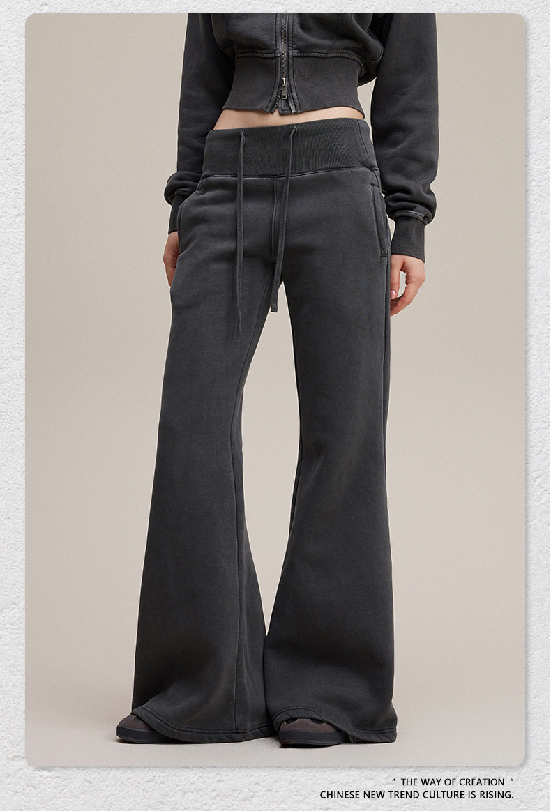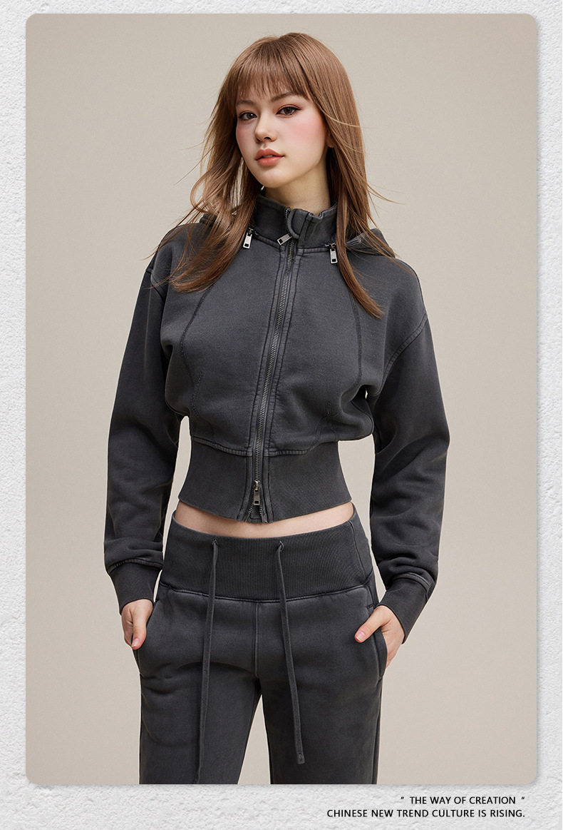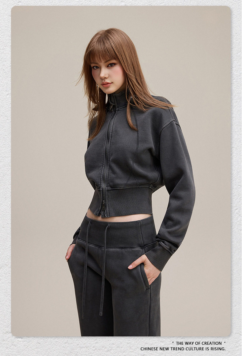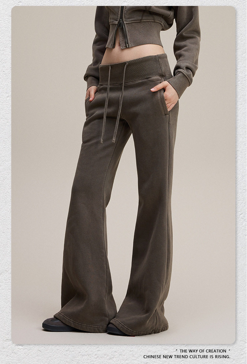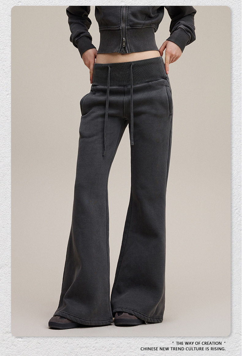 Street Style Retro Washed Sports Detachable Cardigan Hooded Sweatshirt Outdoor Micro-Flared Slim Trousers Suit for Women