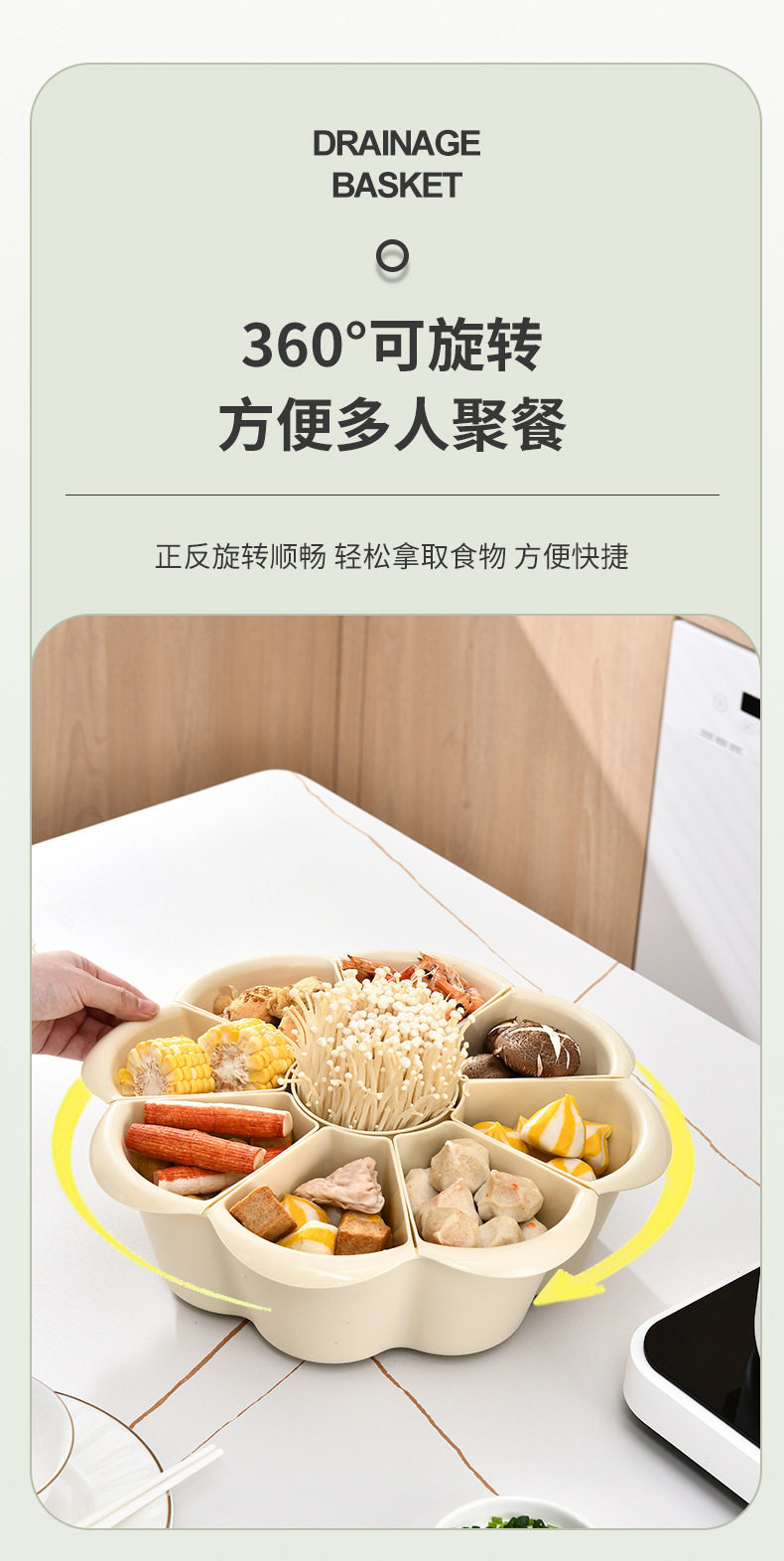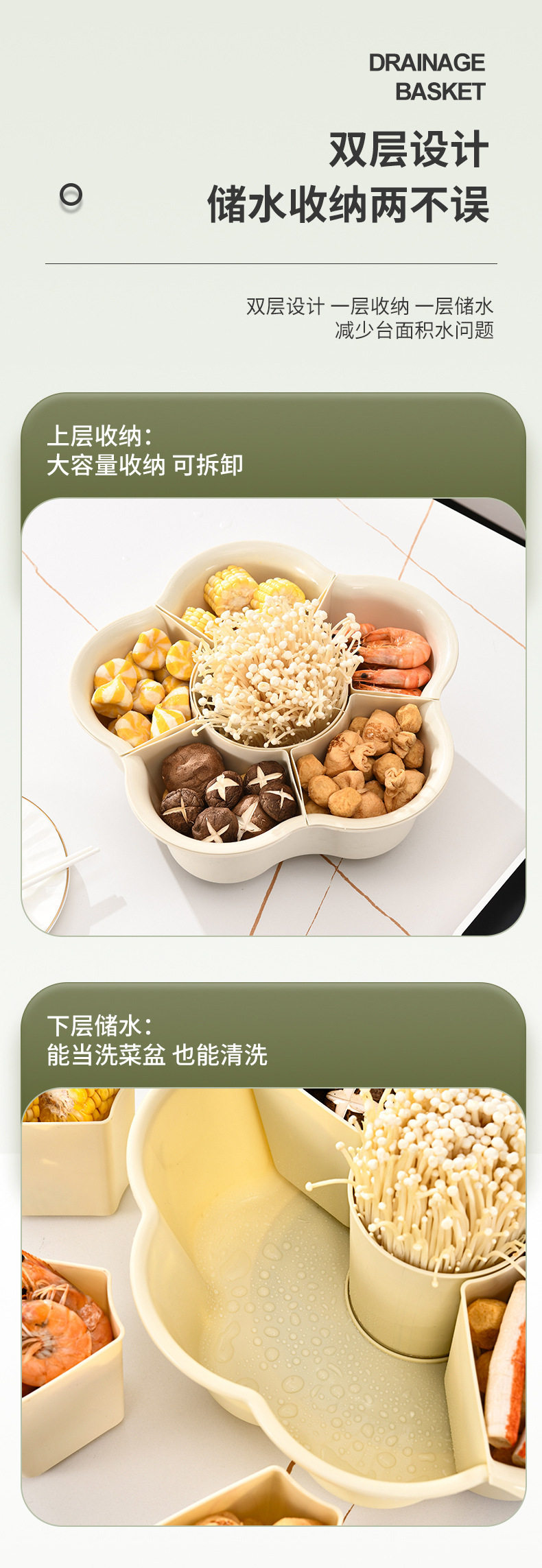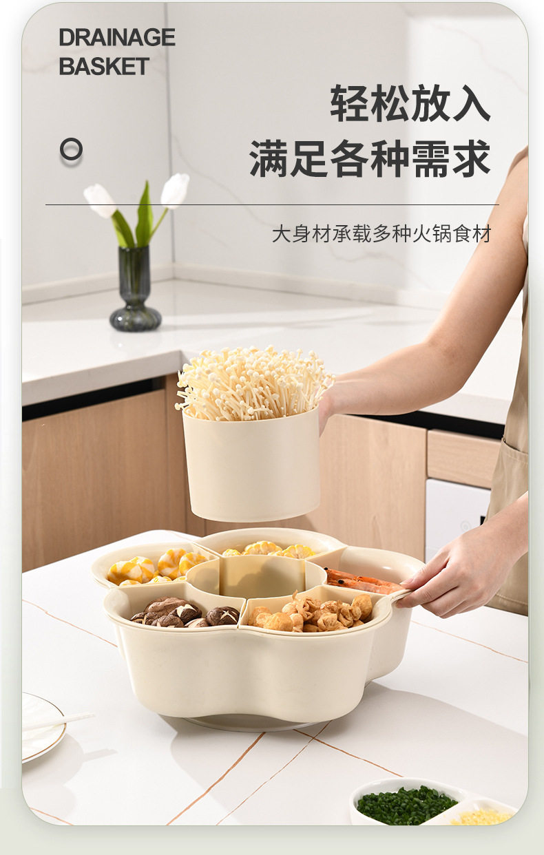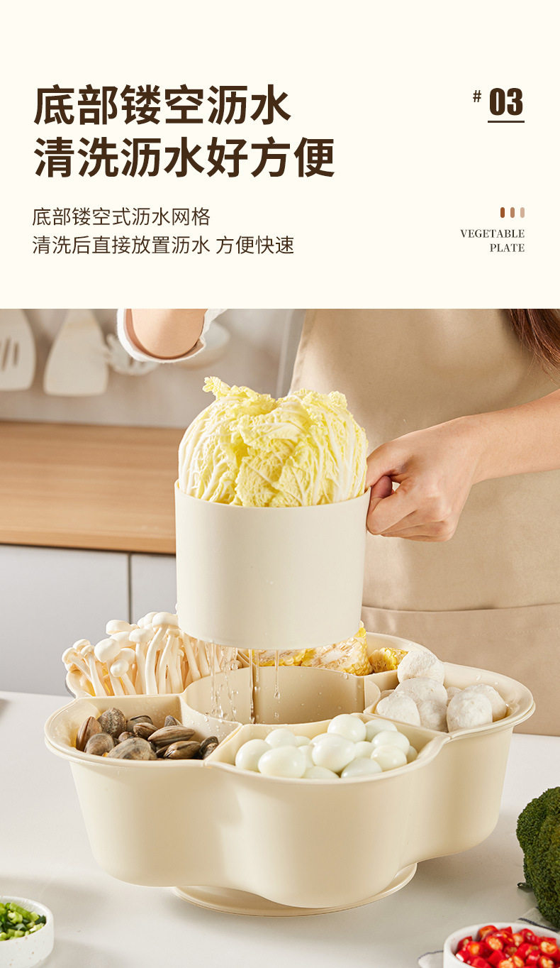 Rotating Hot Pot Vegetable Double-Layer Platter with Vegetable Washing Basin and Draining Basket, Creative Multifunctional Food Preparation and Side Dish Tray for Home Use