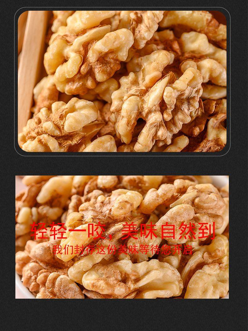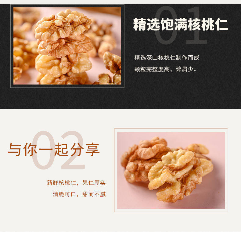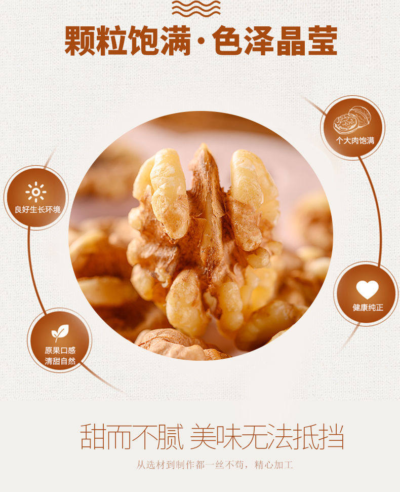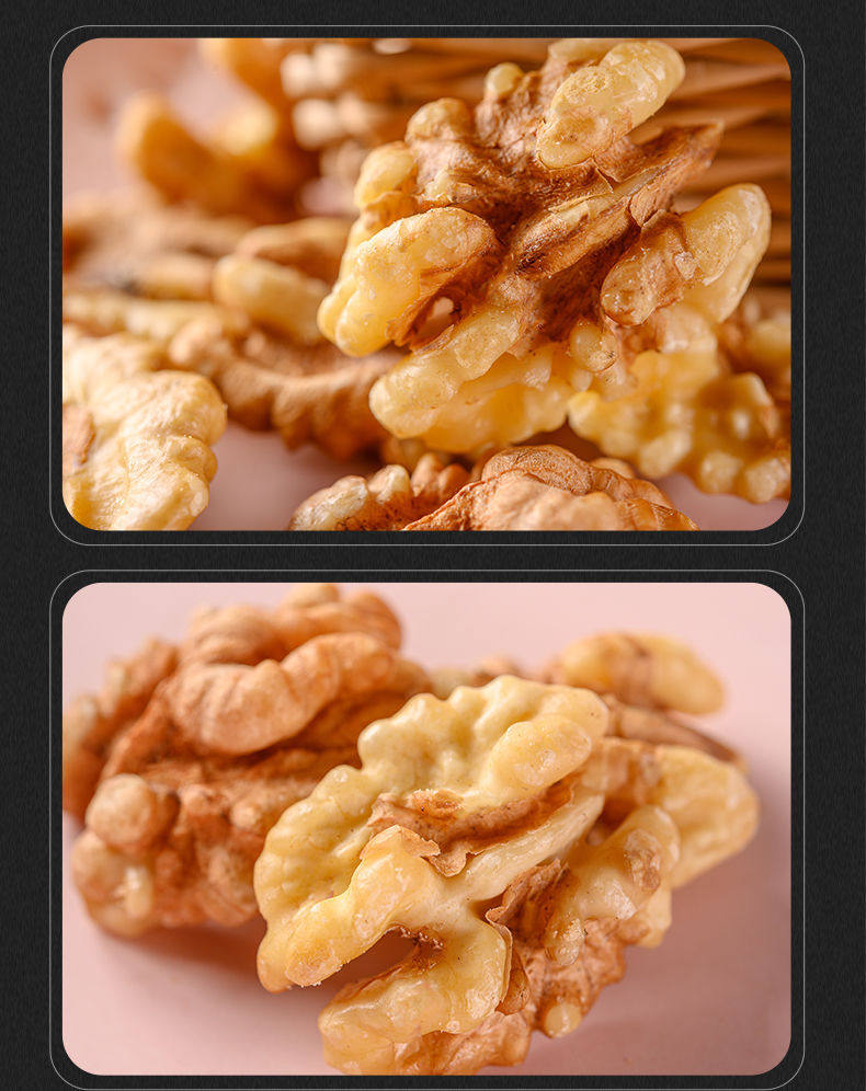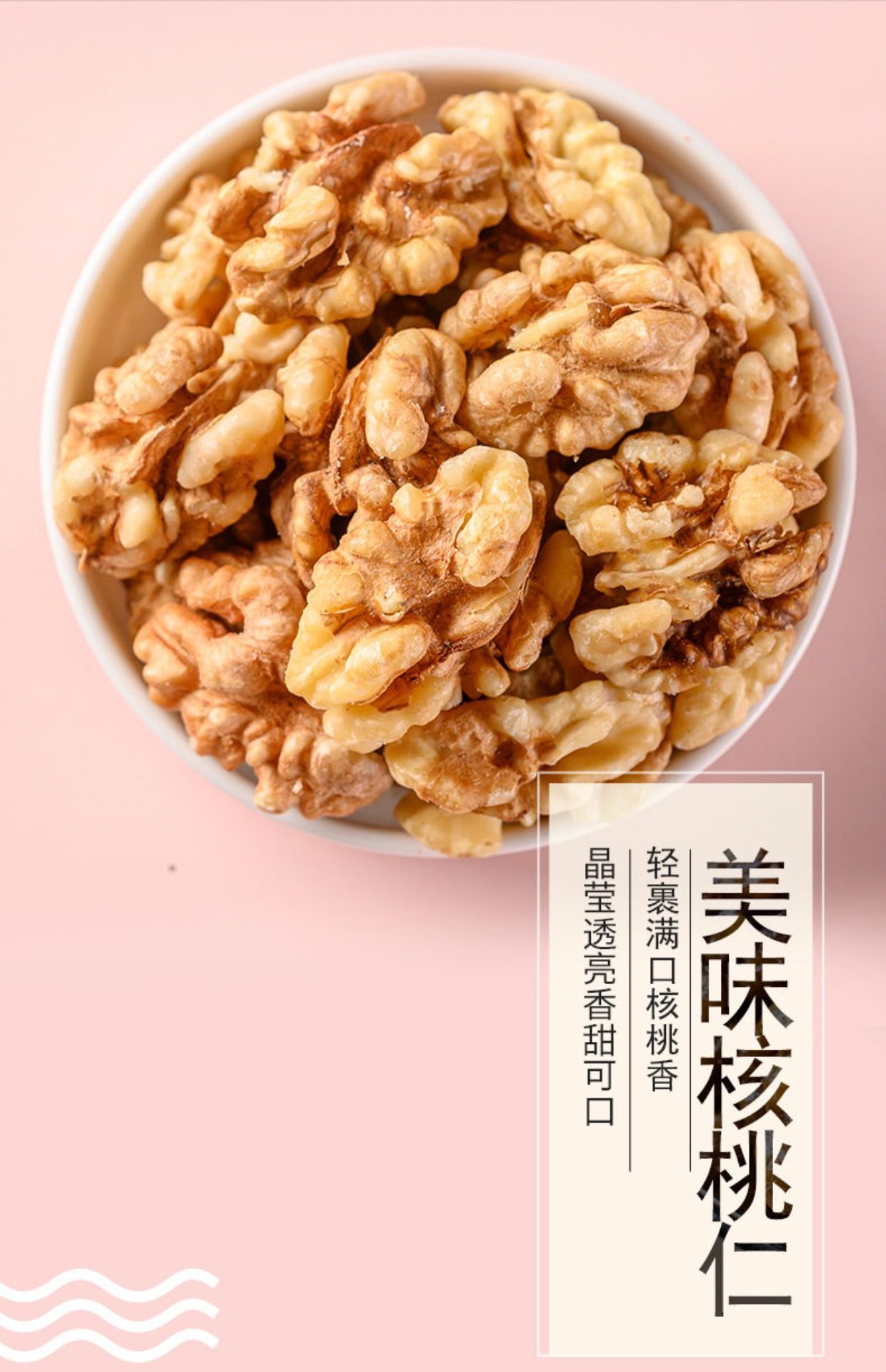 | Packaging specifications | Original walnut kernels 250g (new arrivals now available),Original walnut kernels 500g (new arrivals now available),Original walnut kernels 1000g (new arrivals now available),Amber walnut kernels 250g (new arrivals now available),Amber walnut kernels 500g (new arrivals now available),Amber walnut kernels 1000g (new arrivals now available) |