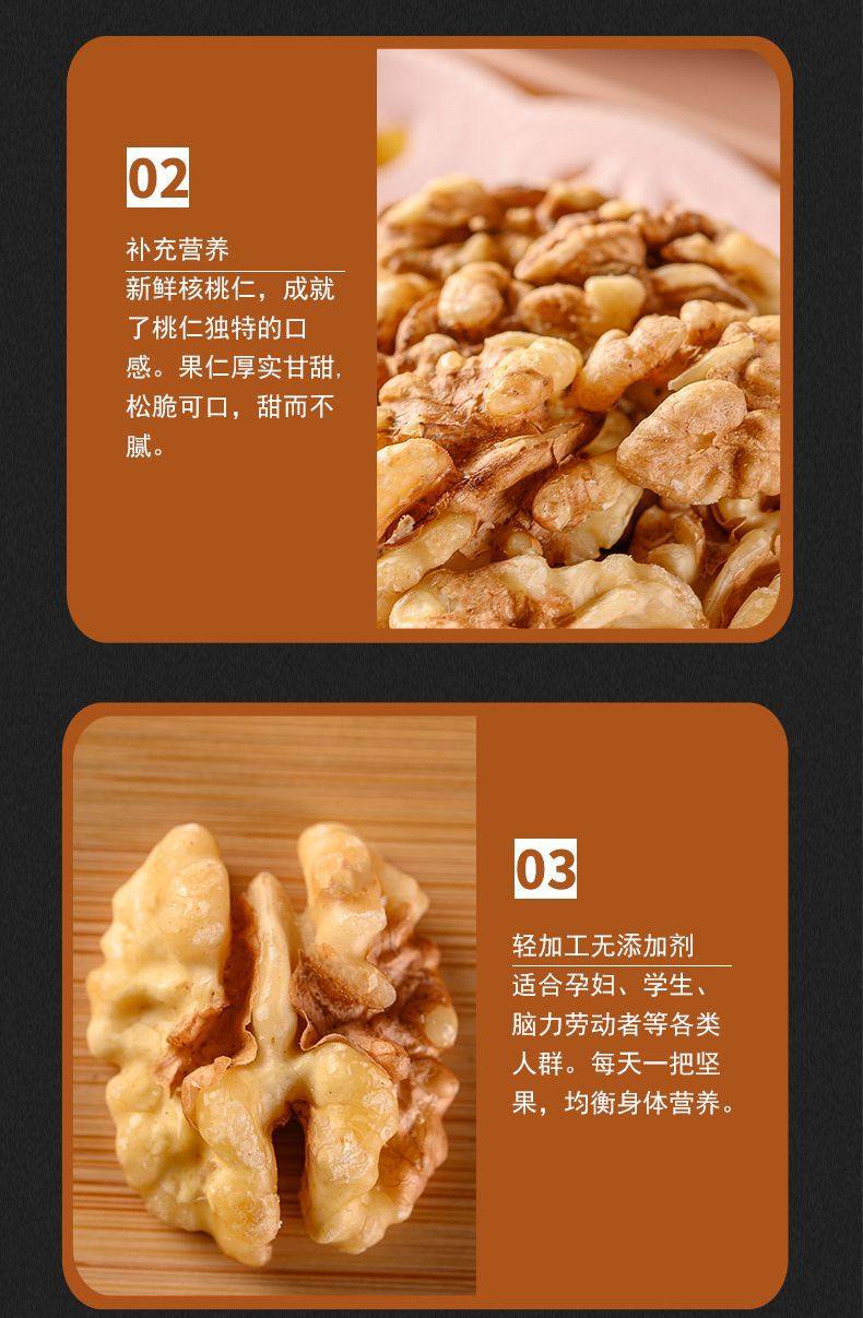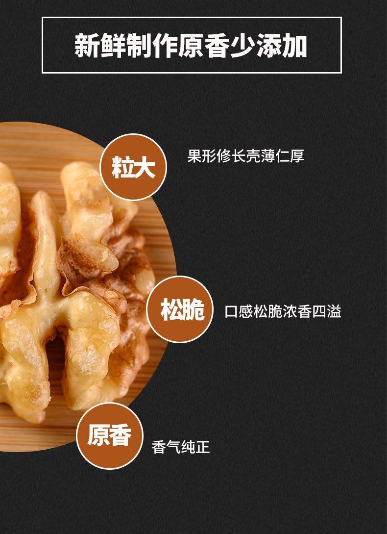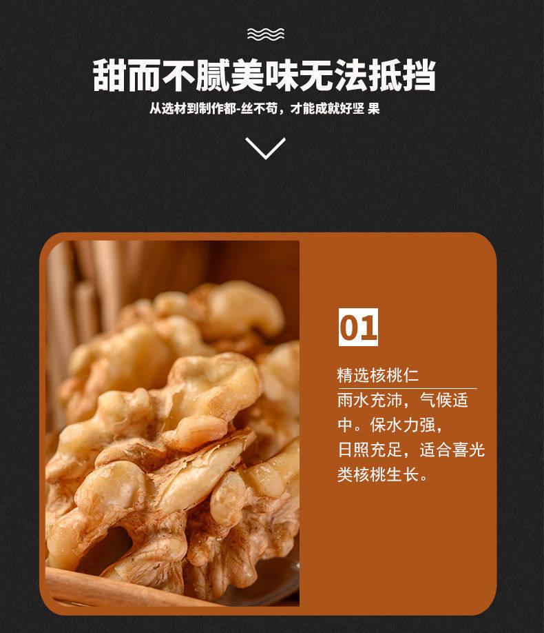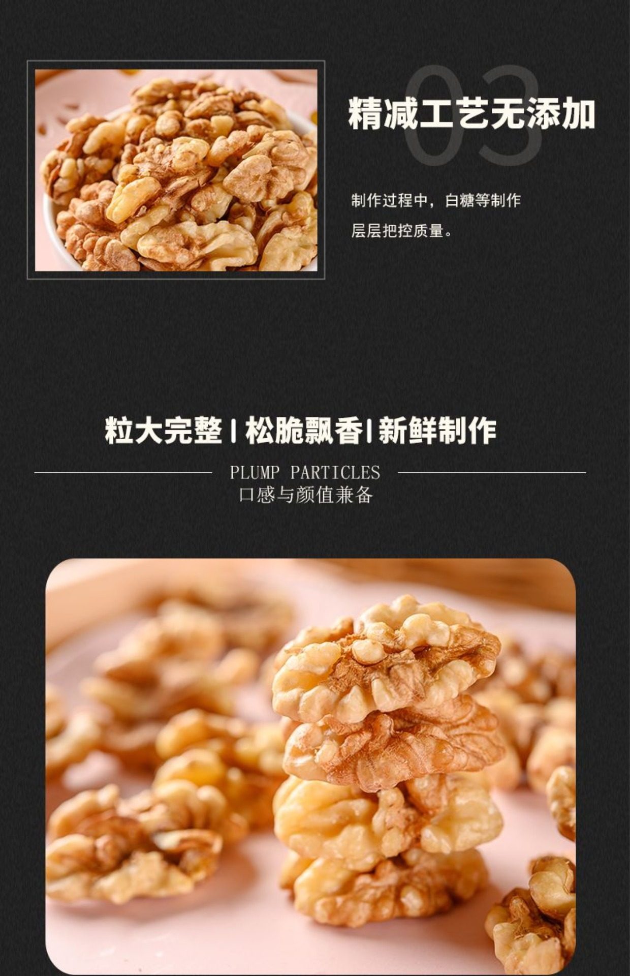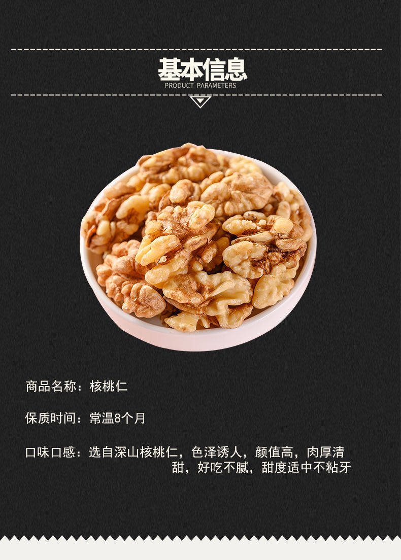 | Packaging specifications | Original walnut kernels 250g (new arrivals now available),Original walnut kernels 500g (new arrivals now available),Original walnut kernels 1000g (new arrivals now available),Amber walnut kernels 250g (new arrivals now available),Amber walnut kernels 500g (new arrivals now available),Amber walnut kernels 1000g (new arrivals now available) |
