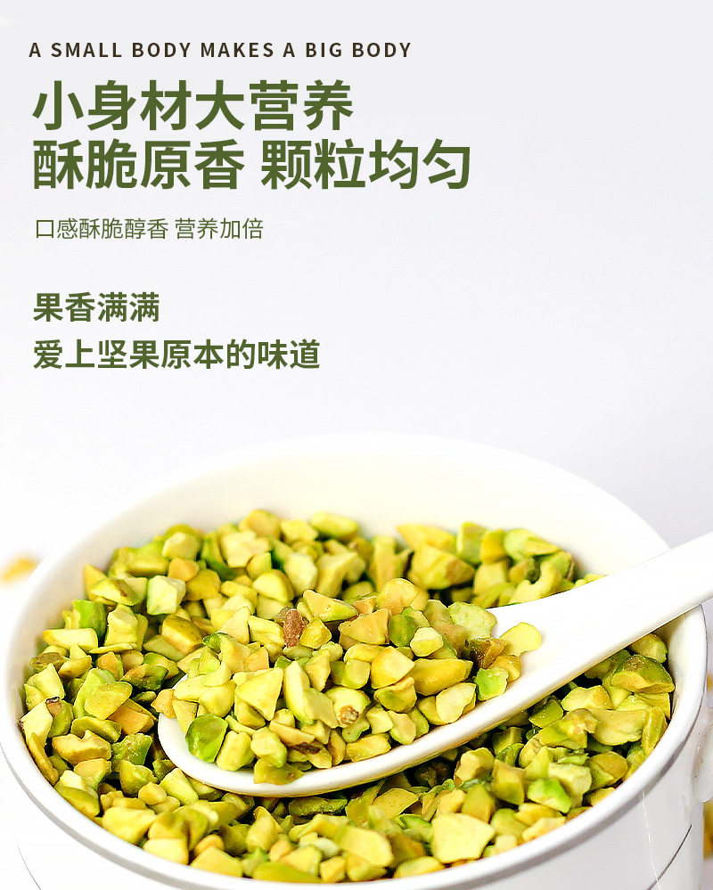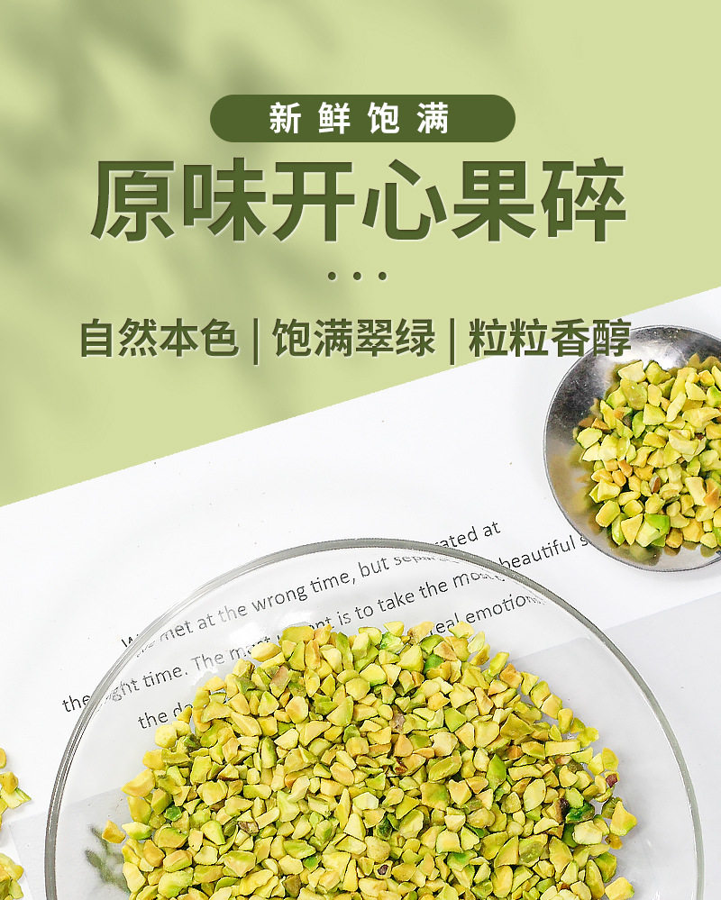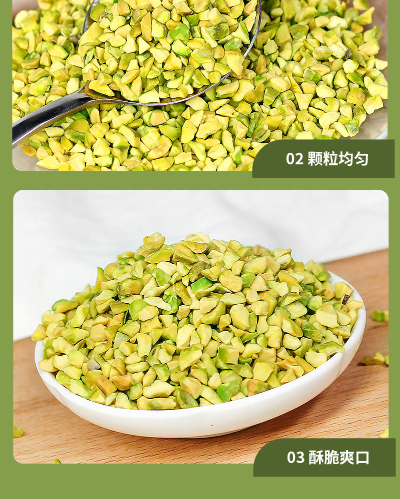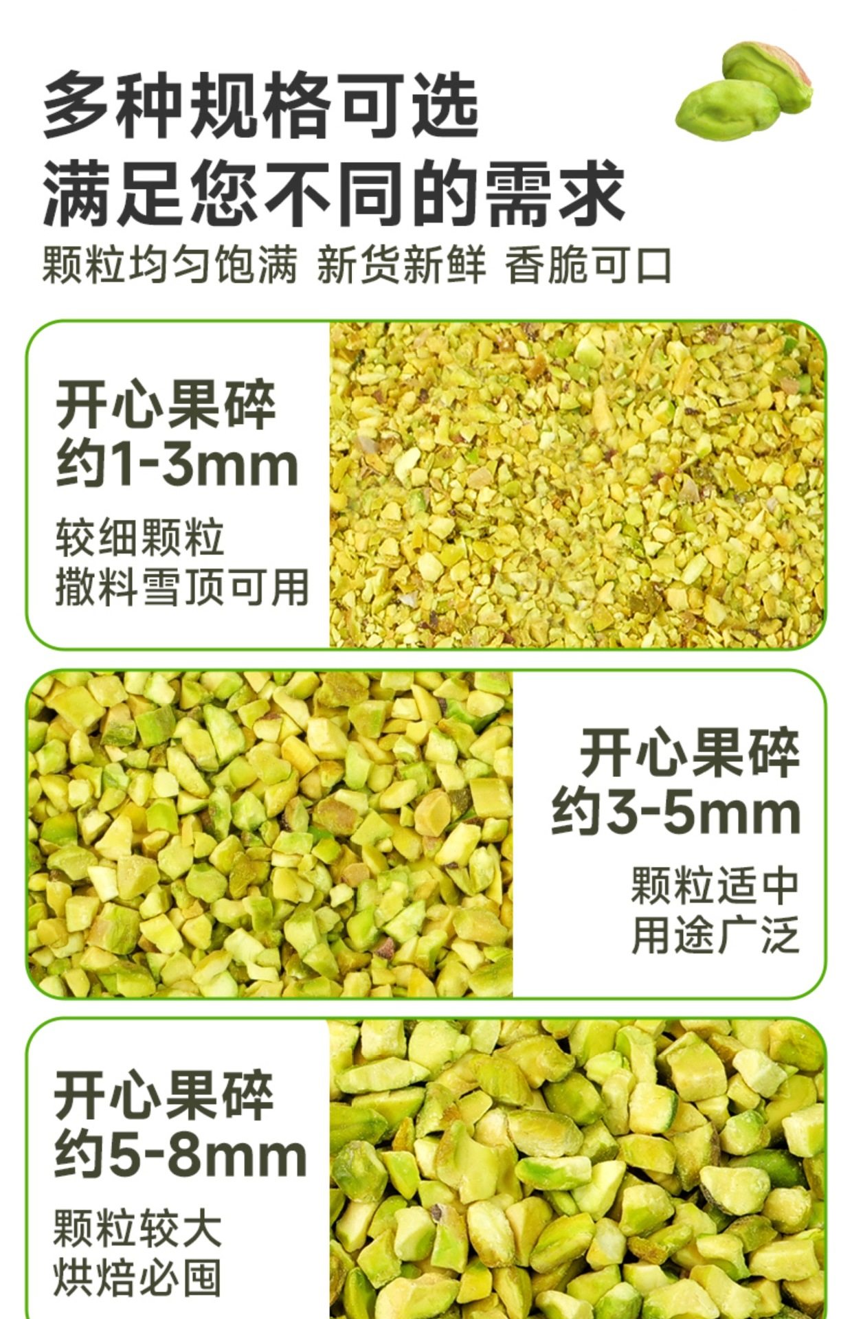 Packaging specifications Pistachio chopped 3-5mm (cooked original flavor) 250g*1 bag,Pistachio chopped 3-5mm (cooked original flavor) 250g*2 bags,Pistachio chopped 3-5mm (cooked original flavor) 250g*5 bags,Pistachio chopped 3-5mm (cooked original flavor) 250g*10 bags,Pistachio chopped 3-5mm (cooked original flavor) 10kg [full box],Pistachio chopped 1-3mm (cooked original flavor) 250g*1 bag,Pistachio chopped 1-3mm (cooked original flavor) 250g*2 bags,Pistachio chopped 1-3mm (cooked original flavor) 250g*5 bags,Pistachio chopped 1-3mm (cooked original flavor) 10kg [full box],Pistachio chopped 5-8mm (cooked original flavor) 250g*1 bag,Pistachio chopped 5-8mm (cooked original flavor) 250g*2 bags,Pistachio chopped 5-8mm (cooked original flavor) 250g*5 bags,Pistachio chopped 5-8mm (cooked original flavor) 10kg [full box],Whole pistachio nuts (cooked original flavor) 250g*1 bag,Whole pistachio nuts (cooked original flavor) 250g*2 bags,Whole pistachio nuts (cooked original flavor) 250g*5 bags,Pistachio powder (cooked original flavor) 100g*1 bag,Pistachio powder (cooked original flavor) 250g*1 bag,Pecan crushed 3-5mm (milk flavor) 250g*1 bag,Pecan crushed 3-5mm (milk flavor) 250g*2 bags,Pecan fruit crushed 3-5mm (milk flavor) 10kg [full box],Hazelnut crushed 3-5mm (cooked original flavor) 500g*1 bag,Cashew nuts chopped 3-5mm (cooked original flavor) 250g*1 bag,Cashew nuts chopped 3-5mm (cooked original flavor) 250g*2 bags