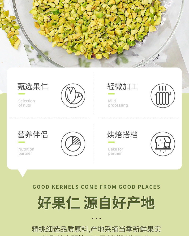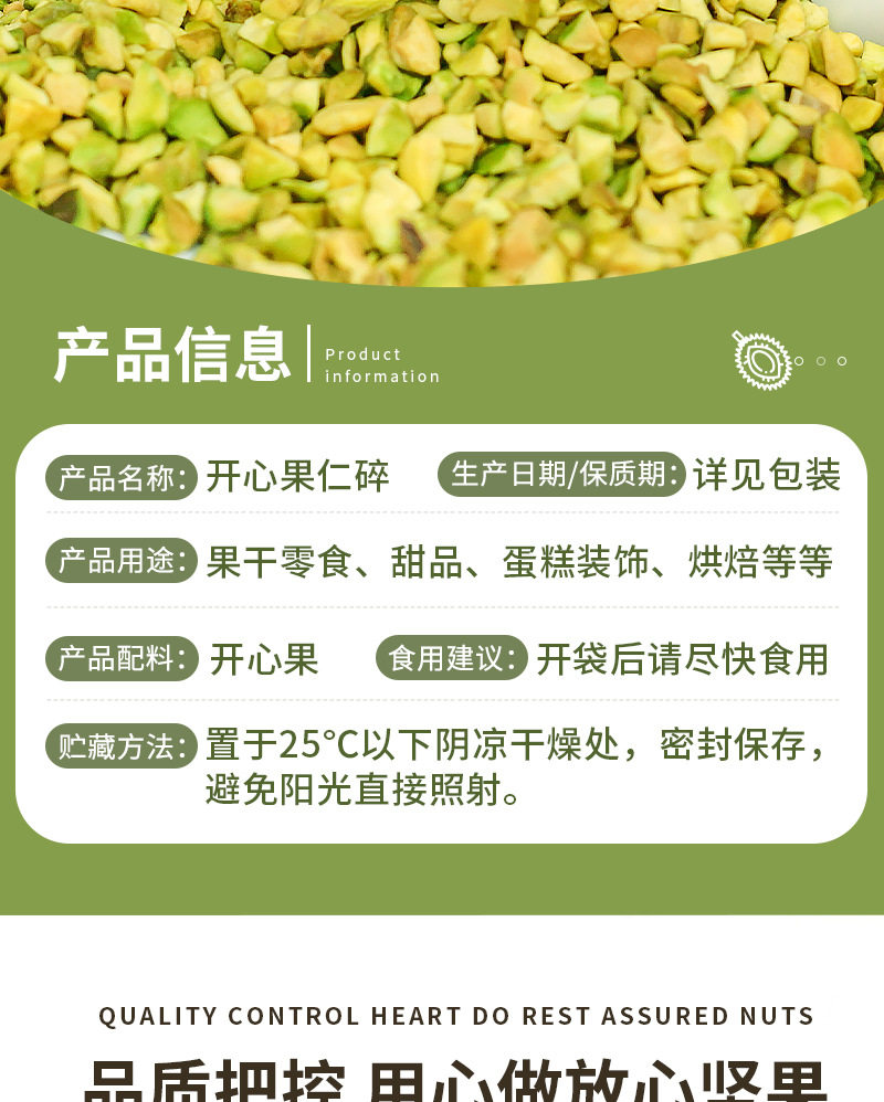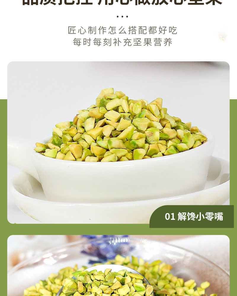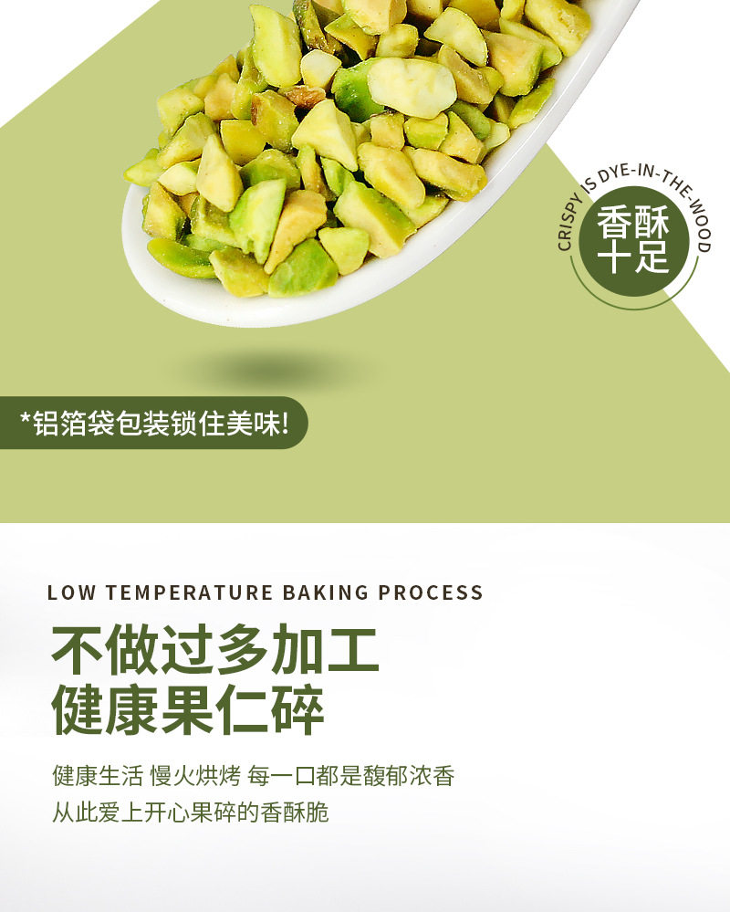 Packaging specifications Pistachio chopped 3-5mm (cooked original flavor) 250g*1 bag,Pistachio chopped 3-5mm (cooked original flavor) 250g*2 bags,Pistachio chopped 3-5mm (cooked original flavor) 250g*5 bags,Pistachio chopped 3-5mm (cooked original flavor) 250g*10 bags,Pistachio chopped 3-5mm (cooked original flavor) 10kg [full box],Pistachio chopped 1-3mm (cooked original flavor) 250g*1 bag,Pistachio chopped 1-3mm (cooked original flavor) 250g*2 bags,Pistachio chopped 1-3mm (cooked original flavor) 250g*5 bags,Pistachio chopped 1-3mm (cooked original flavor) 10kg [full box],Pistachio chopped 5-8mm (cooked original flavor) 250g*1 bag,Pistachio chopped 5-8mm (cooked original flavor) 250g*2 bags,Pistachio chopped 5-8mm (cooked original flavor) 250g*5 bags,Pistachio chopped 5-8mm (cooked original flavor) 10kg [full box],Whole pistachio nuts (cooked original flavor) 250g*1 bag,Whole pistachio nuts (cooked original flavor) 250g*2 bags,Whole pistachio nuts (cooked original flavor) 250g*5 bags,Pistachio powder (cooked original flavor) 100g*1 bag,Pistachio powder (cooked original flavor) 250g*1 bag,Pecan crushed 3-5mm (milk flavor) 250g*1 bag,Pecan crushed 3-5mm (milk flavor) 250g*2 bags,Pecan fruit crushed 3-5mm (milk flavor) 10kg [full box],Hazelnut crushed 3-5mm (cooked original flavor) 500g*1 bag,Cashew nuts chopped 3-5mm (cooked original flavor) 250g*1 bag,Cashew nuts chopped 3-5mm (cooked original flavor) 250g*2 bags