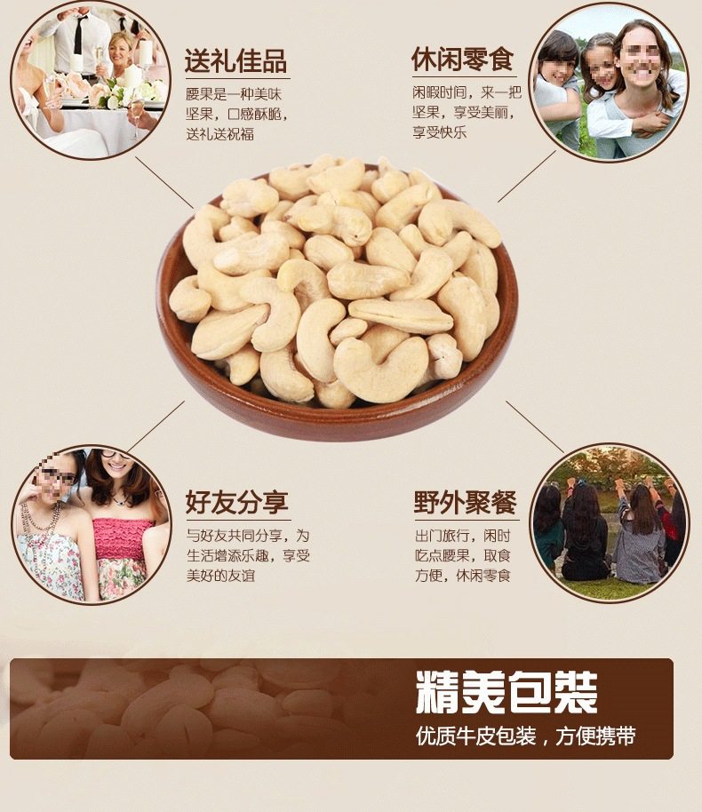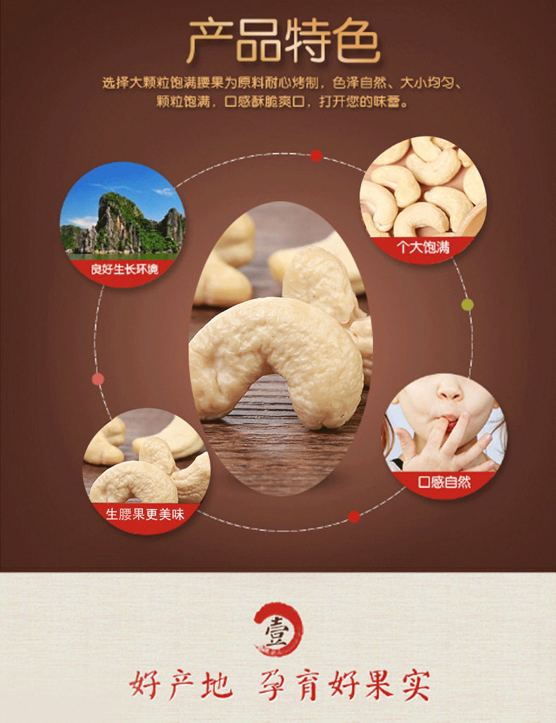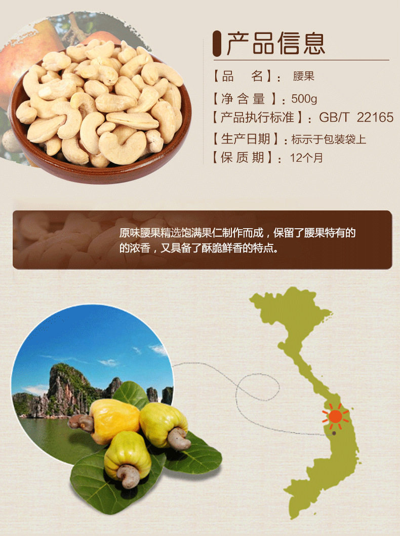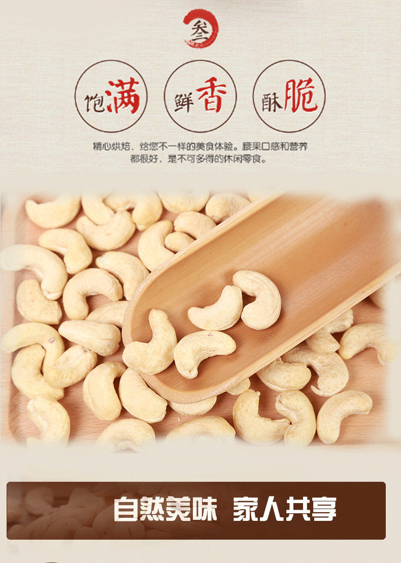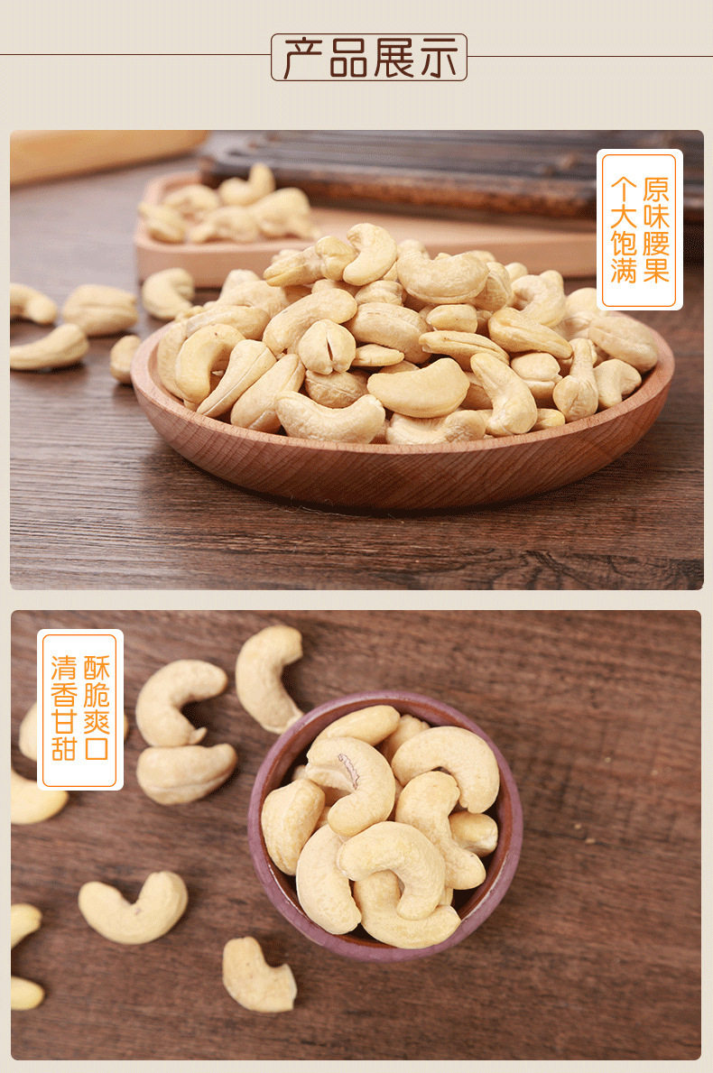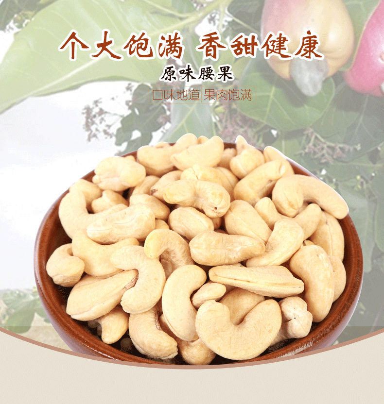 | Packaging specifications | Medium grain original flavor 250g bottle,Medium grain original flavor 500g bottle,Medium grain purple skin 250g bottle,Medium grain purple skin 500g bottle,Large capsules original flavor 250g bottle,Large capsules original flavor 500g bottle,Large purple skin) 250g bottle,Large purple skin) 500g bottle,4-6mm crushed cashew nuts 250g bag |