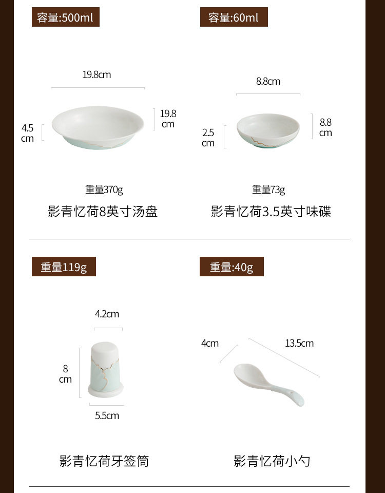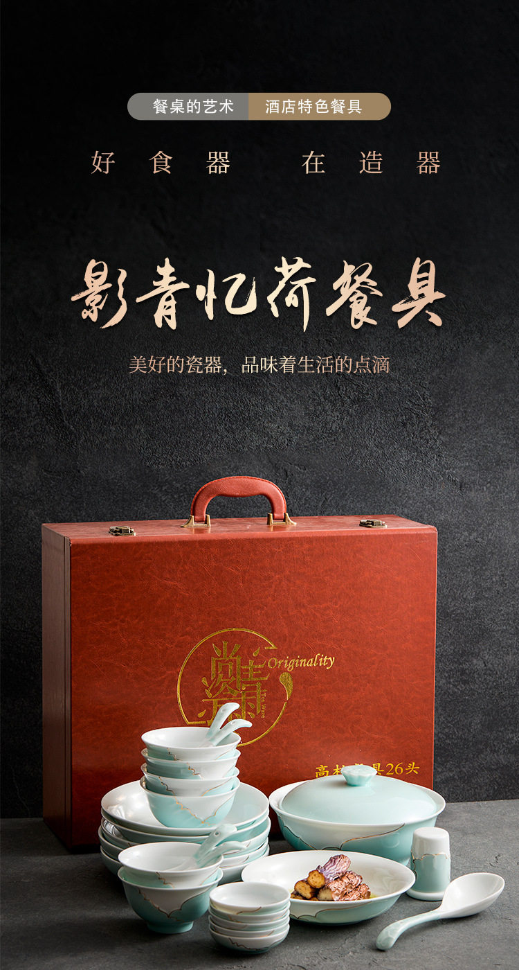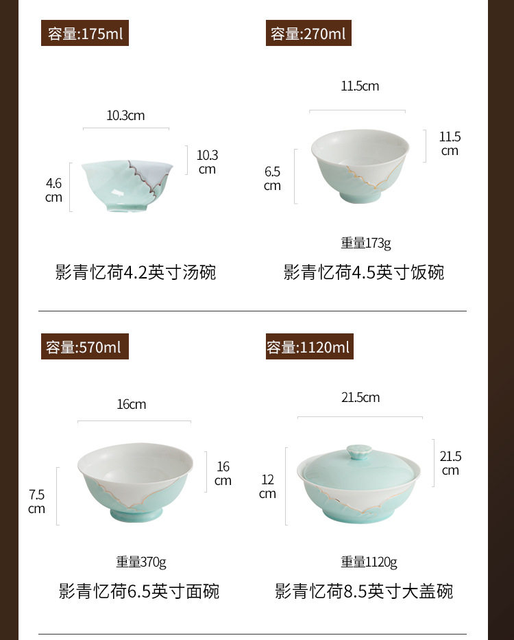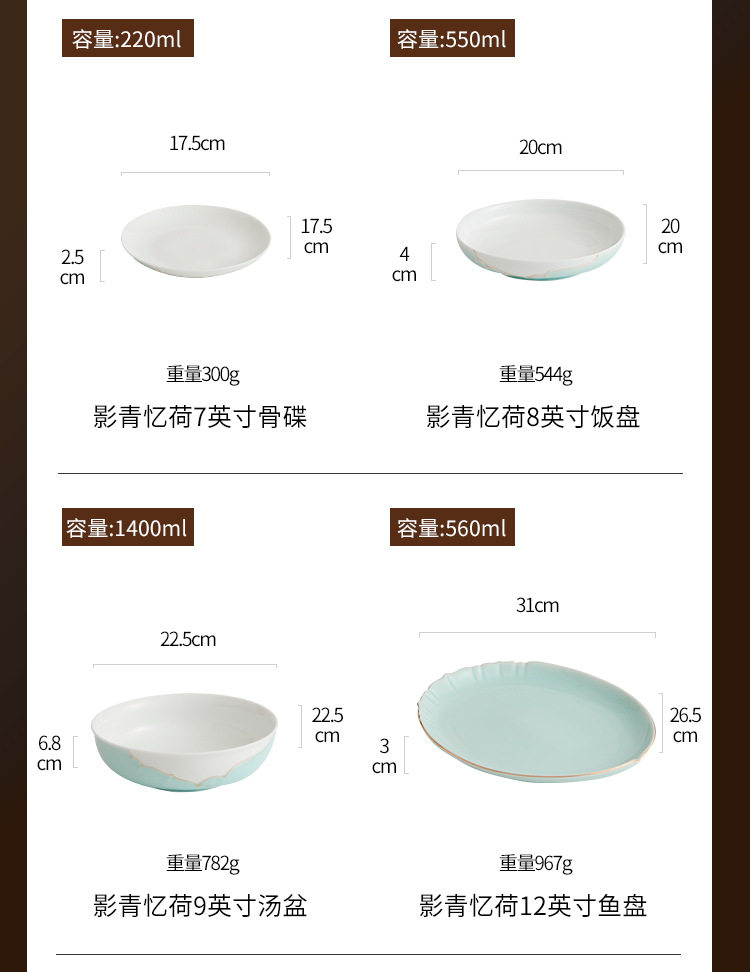 | Color | 26 head shadow qing yihe,36 head shadow qing yihe,42 head shadow qing yihe,Ying qing yi he 4.2inch soup bowl,Ying qing yi he 4.5inch rice bowl,Yingqing yihhe 6.5inch noodle bowl,Yingqing yihhe 8.5inch large bowl,Yingqing yihhe 9inch soup basin,Yingqing yihhe 3.5inch flavor plate,Ying qing yi he 7inch bone disc,Ying qing yi he 8inch rice plate,Yingqing yihhe 8inch soup plate,Ying qing yi he 12inch fish plate,Yingqing yihhe small spoon,Ying qing yi he large spoon,Yingqing yihhe toothpick holder |