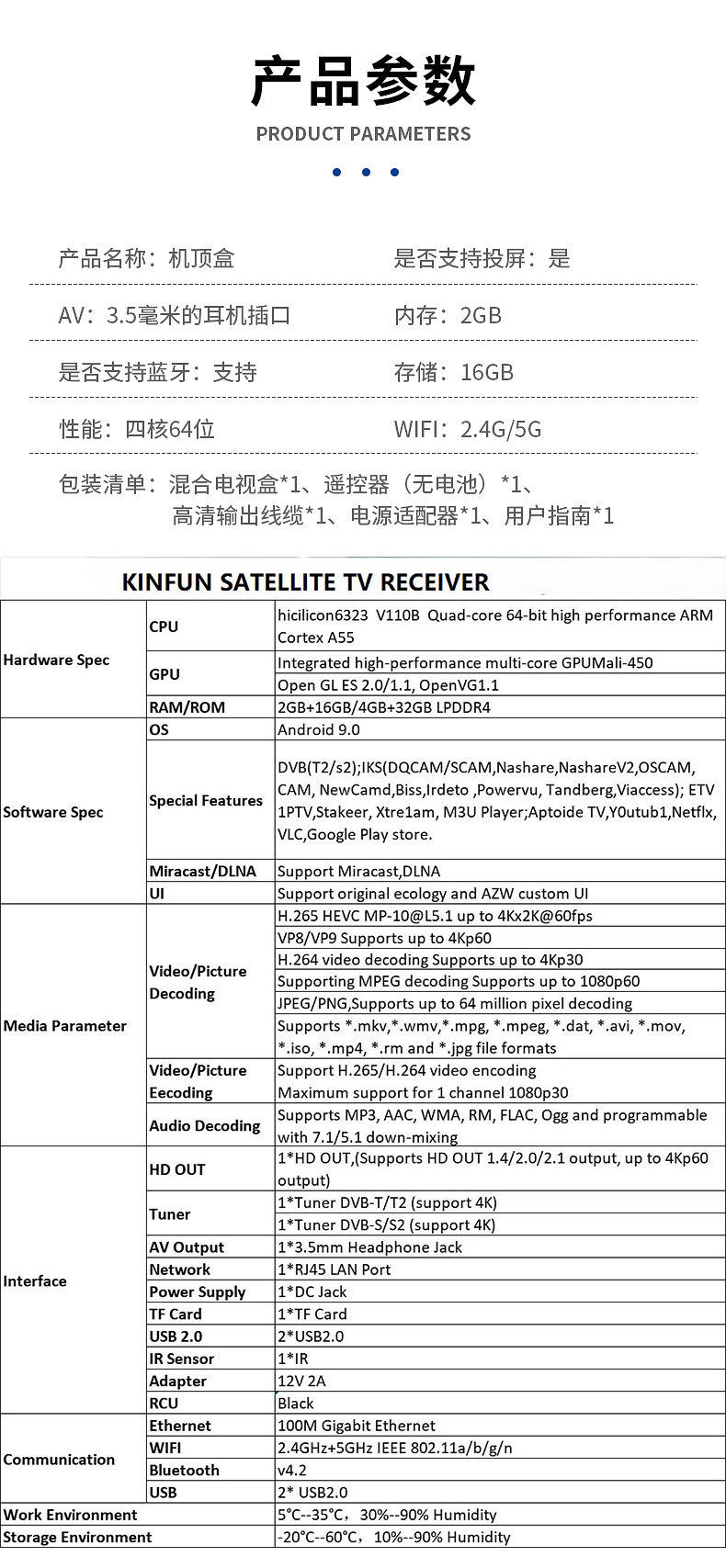 | Packing list | Hybrid tv box*1, remote control (without battery)*1, hd output cable*1, power adapter*1, user guide*1 |