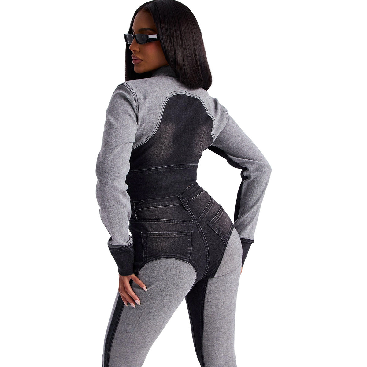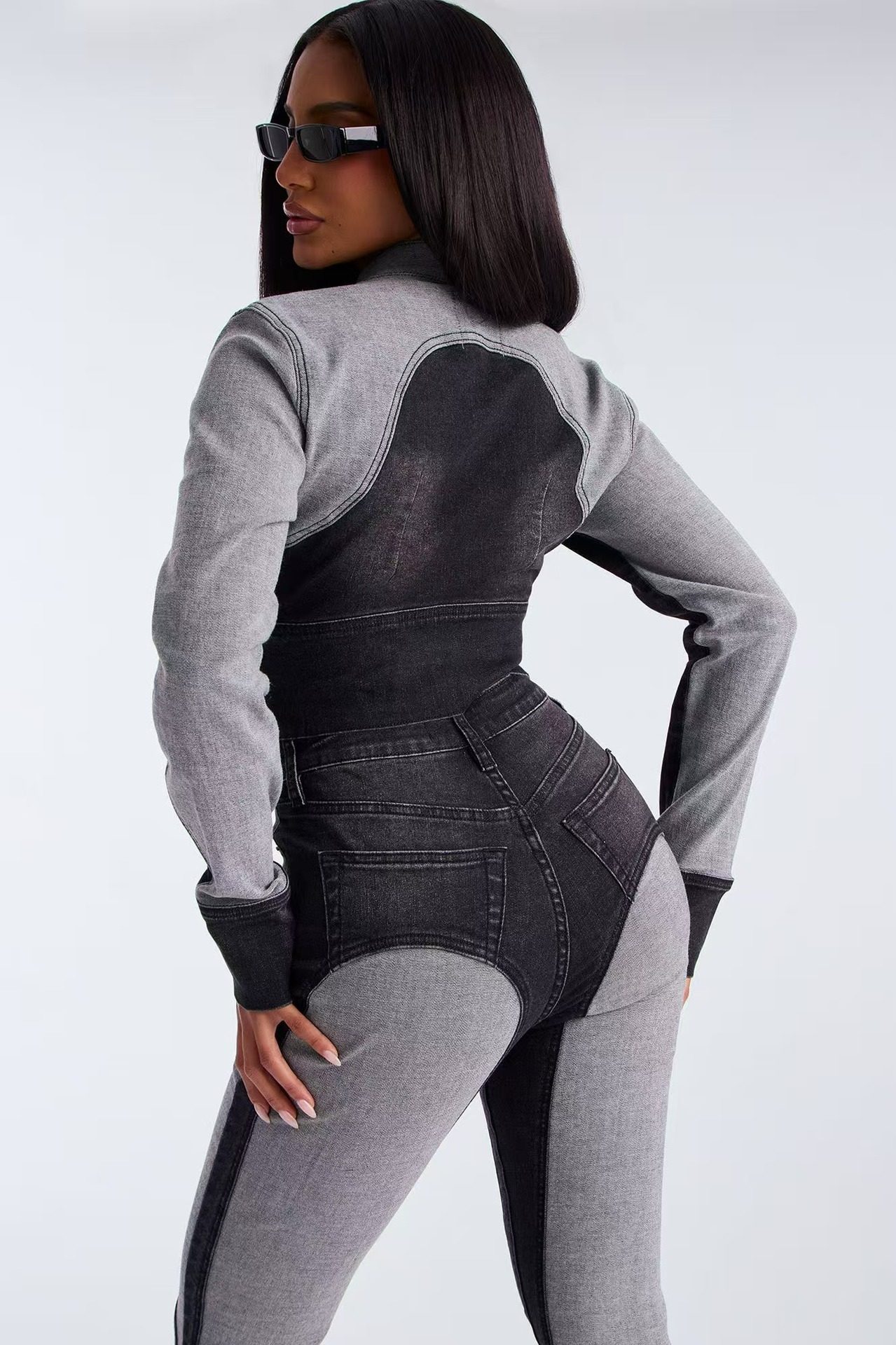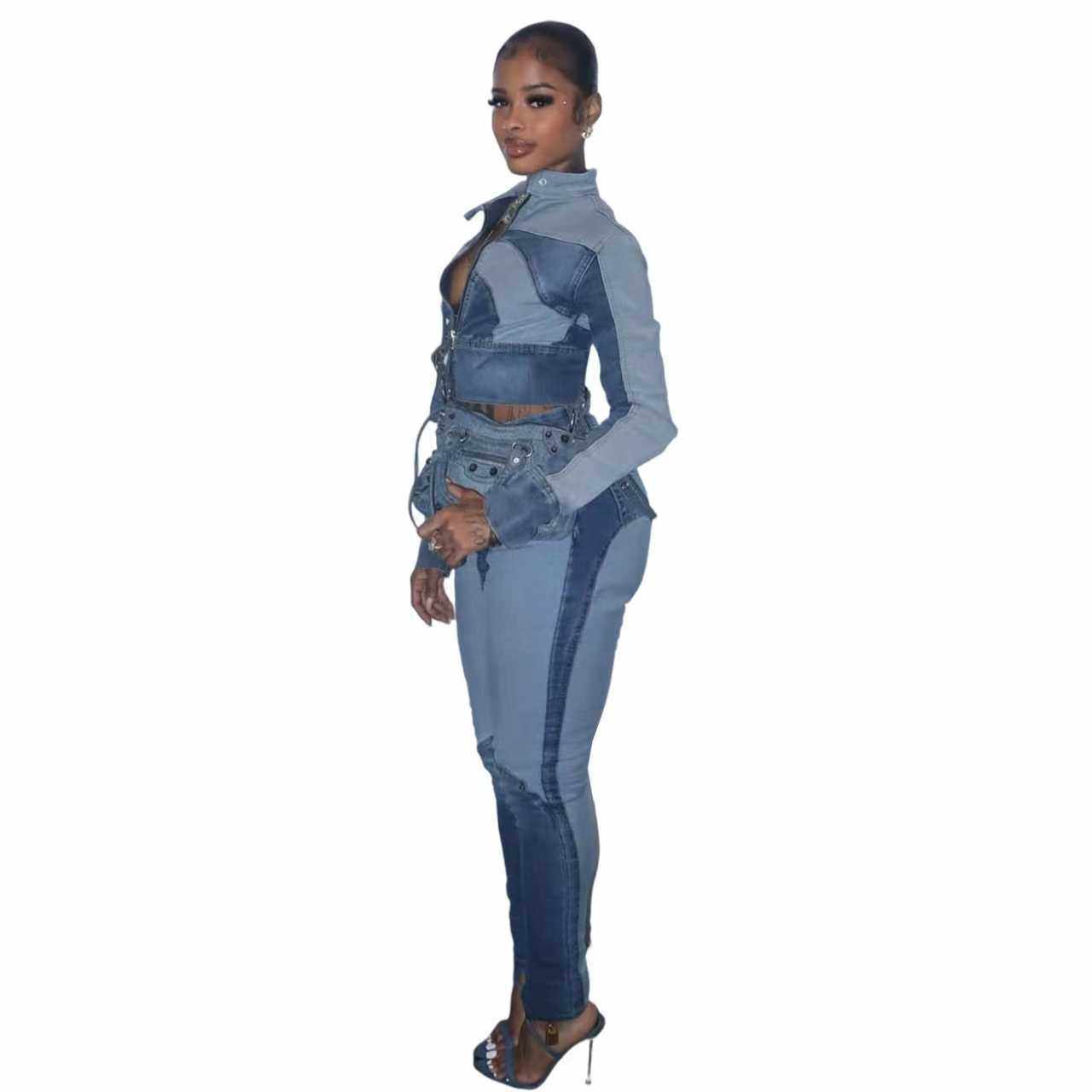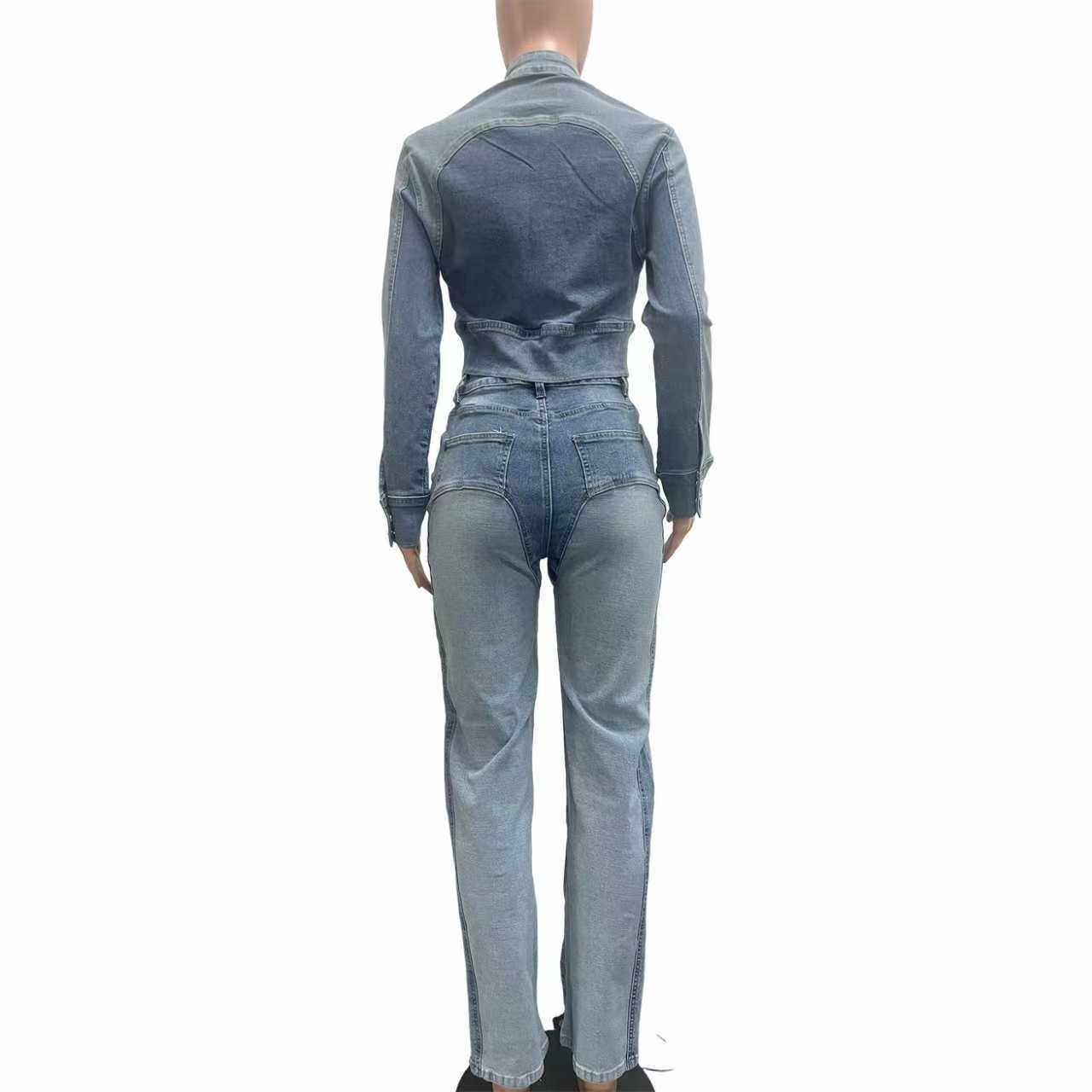 Ny8196 Amazon European and American Fashion Sexy High-Elastic Stitching Contrasting Washed Denim Casual Suit Two-Piece Set