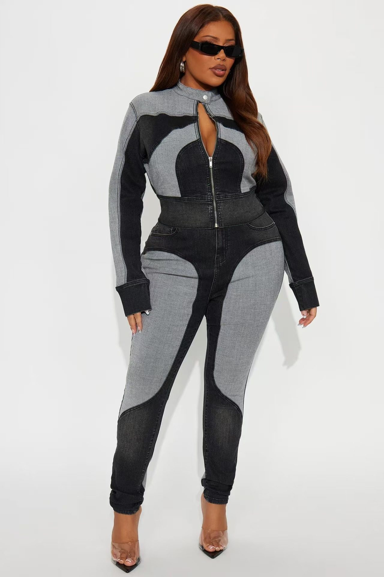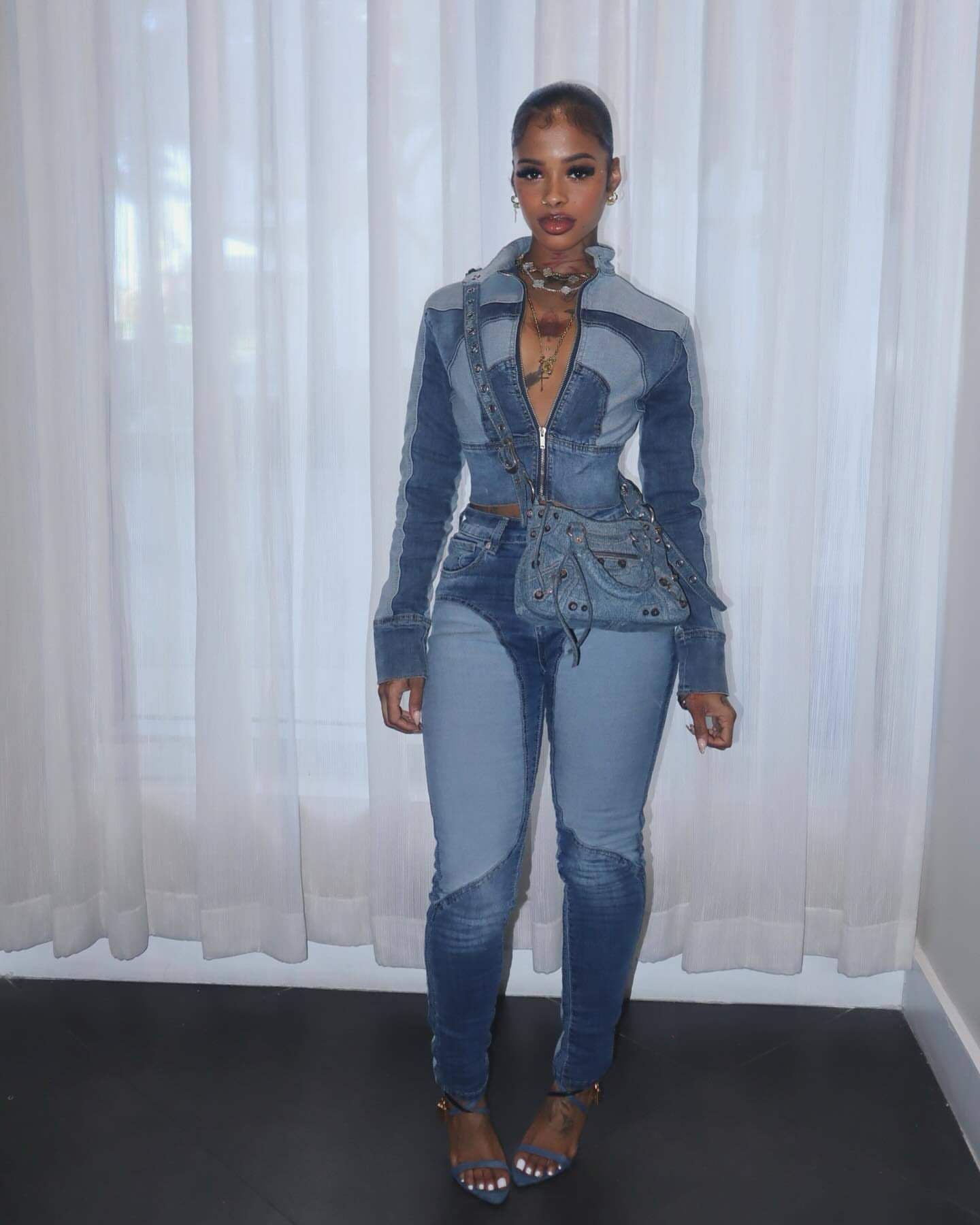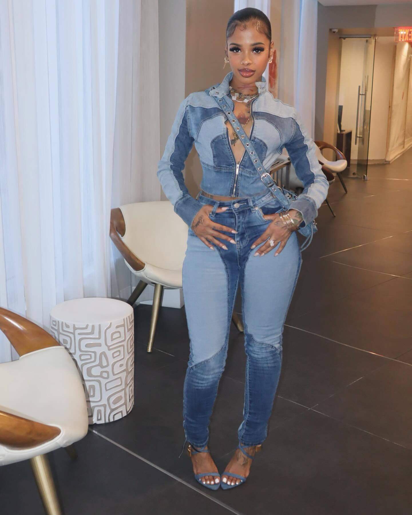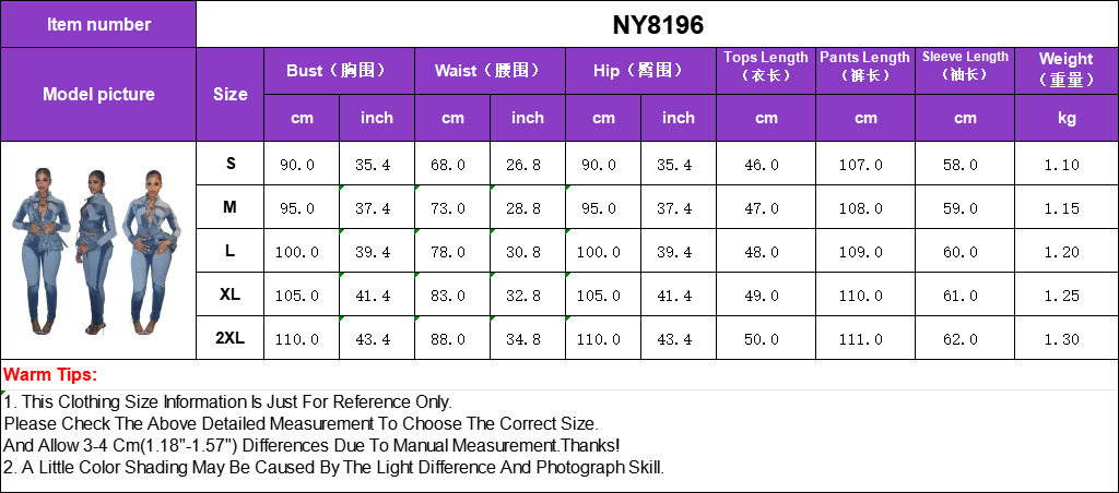 Ny8196 Amazon European and American Fashion Sexy High-Elastic Stitching Contrasting Washed Denim Casual Suit Two-Piece Set