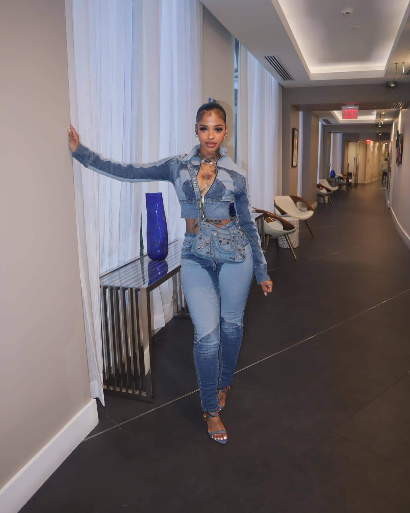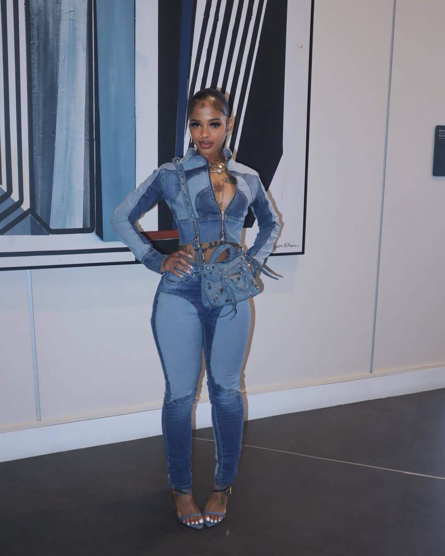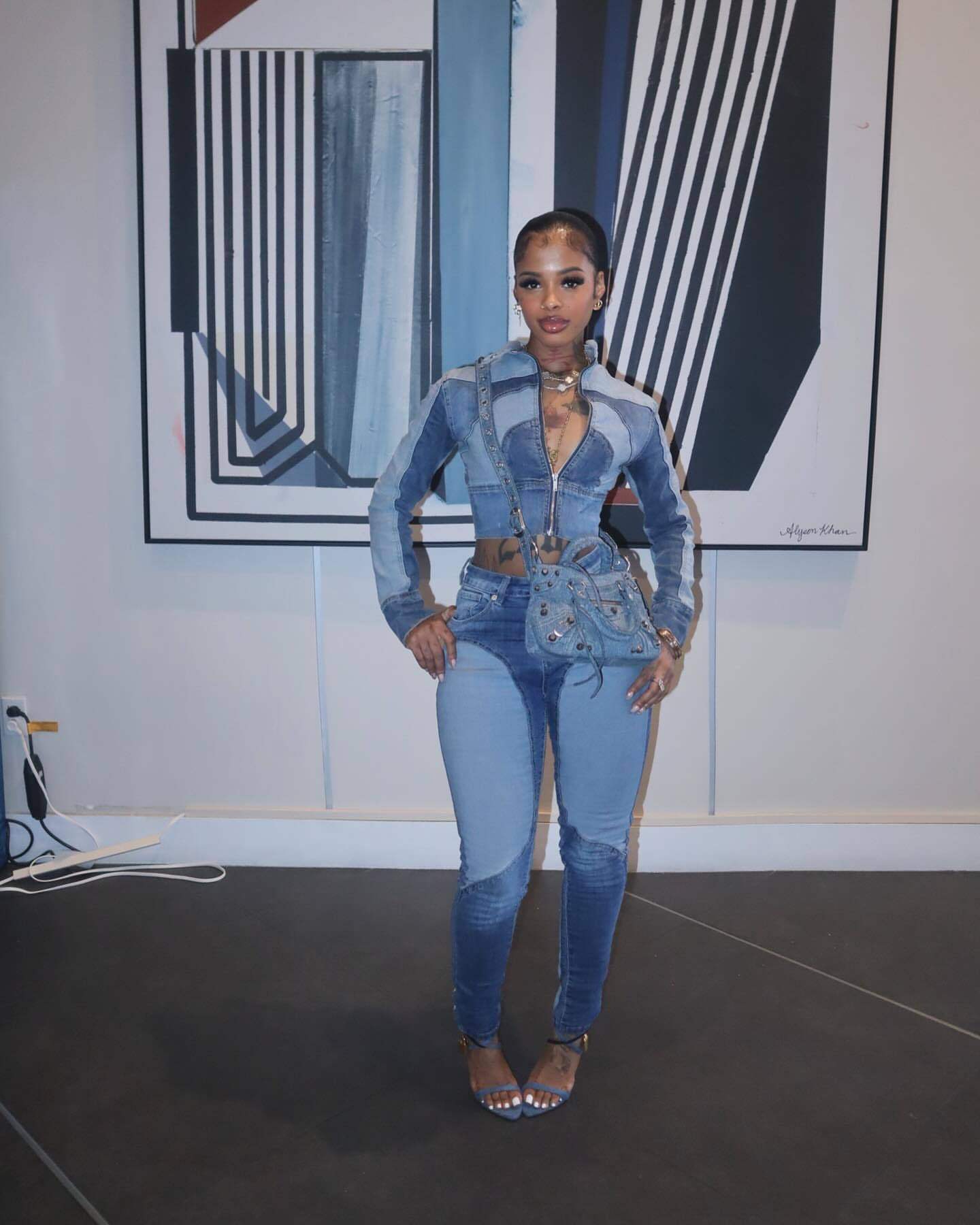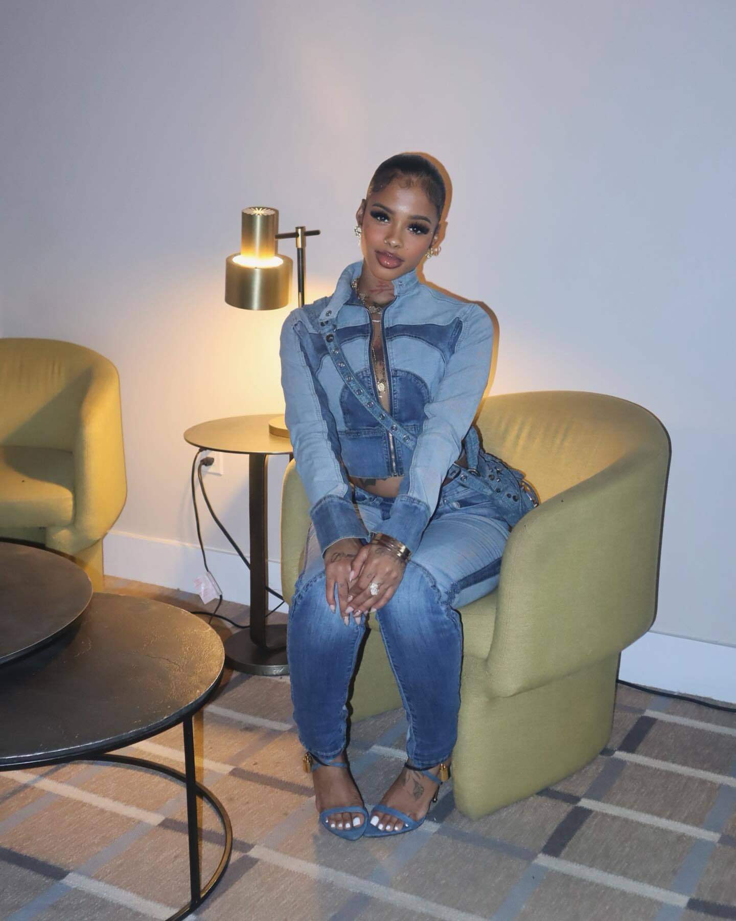 Ny8196 Amazon European and American Fashion Sexy High-Elastic Stitching Contrasting Washed Denim Casual Suit Two-Piece Set