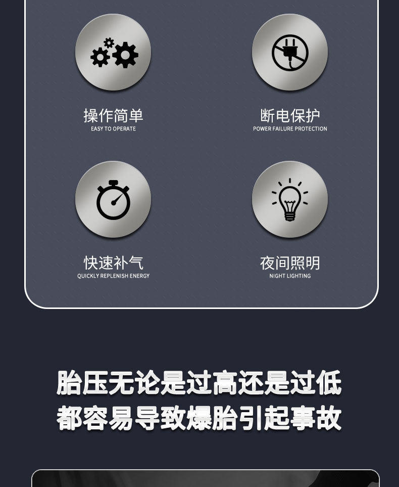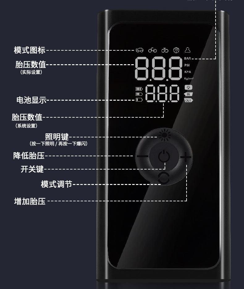 | Additional features | Lighting,Tire pressure gauge,Warning light,Usb charging |