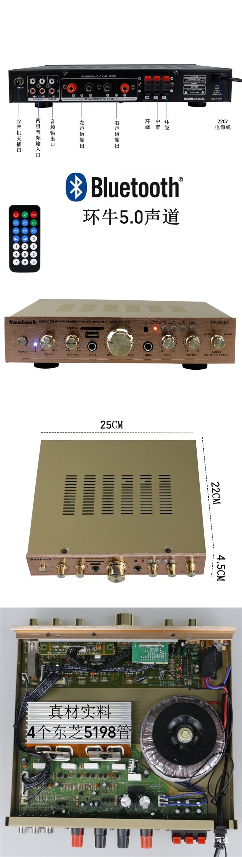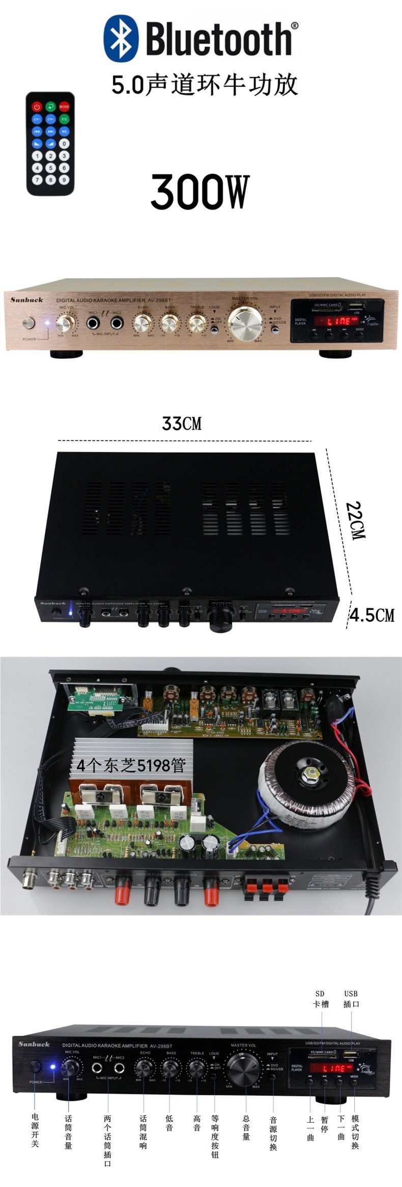 5-Channel Amplifier, Home Amplifier, Karaoke Amplifier, Digital High-Power Amplifier with Card Remote Control Bluetooth Amplifier