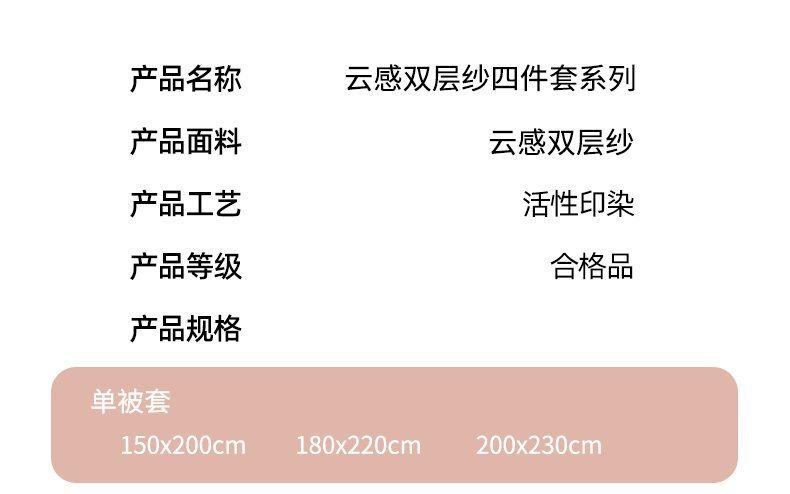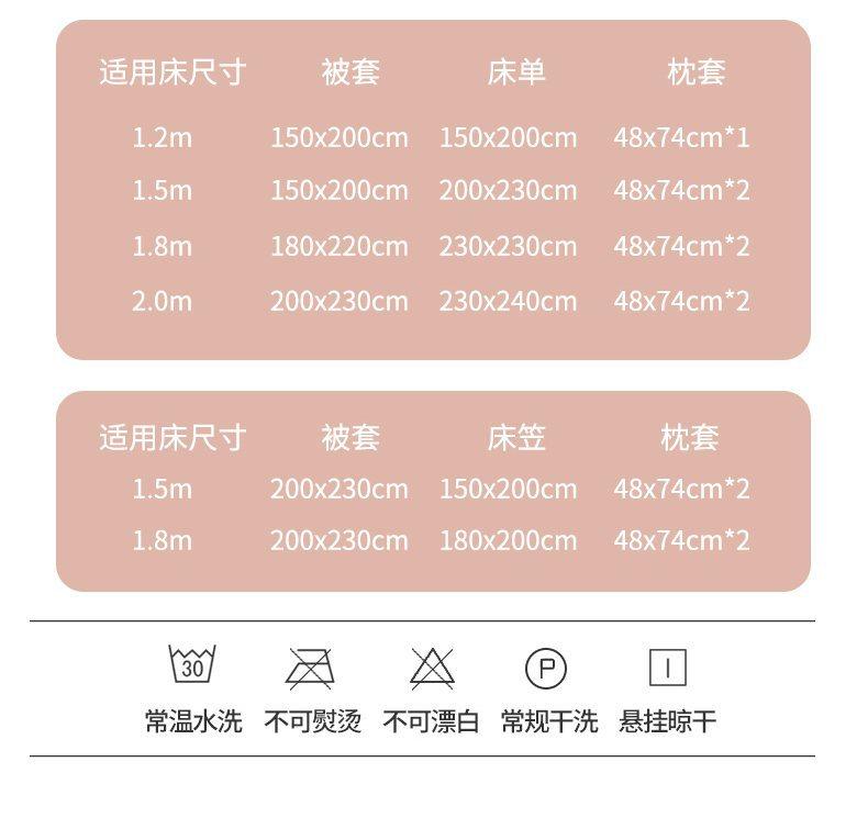 | Dimensions | 1.2m bed sheet three-piece set [suitable for 150*200cm quilt core],1.5m bed sheet four-piece set [suitable for 150*200cm quilt core],1.8m bed sheet four-piece set [suitable for 180*220cm quilt core],2.0m bed sheet four-piece set [suitable for 200*230cm quilt core],1.5m [four-piece fitted sheet set] suitable for 200*230cm quilt core,1.8m [four-piece fitted sheet set] suitable for 200*230cm quilt core,Single quilt cover-150*200cm [suitable for 150*200cm quilt core],Single quilt cover-180*220cm [suitable for 180*220cm quilt core],Single quilt cover-200*230cm [suitable for 200*230cm quilt core],A pair of pillowcases [48*74cm] |
