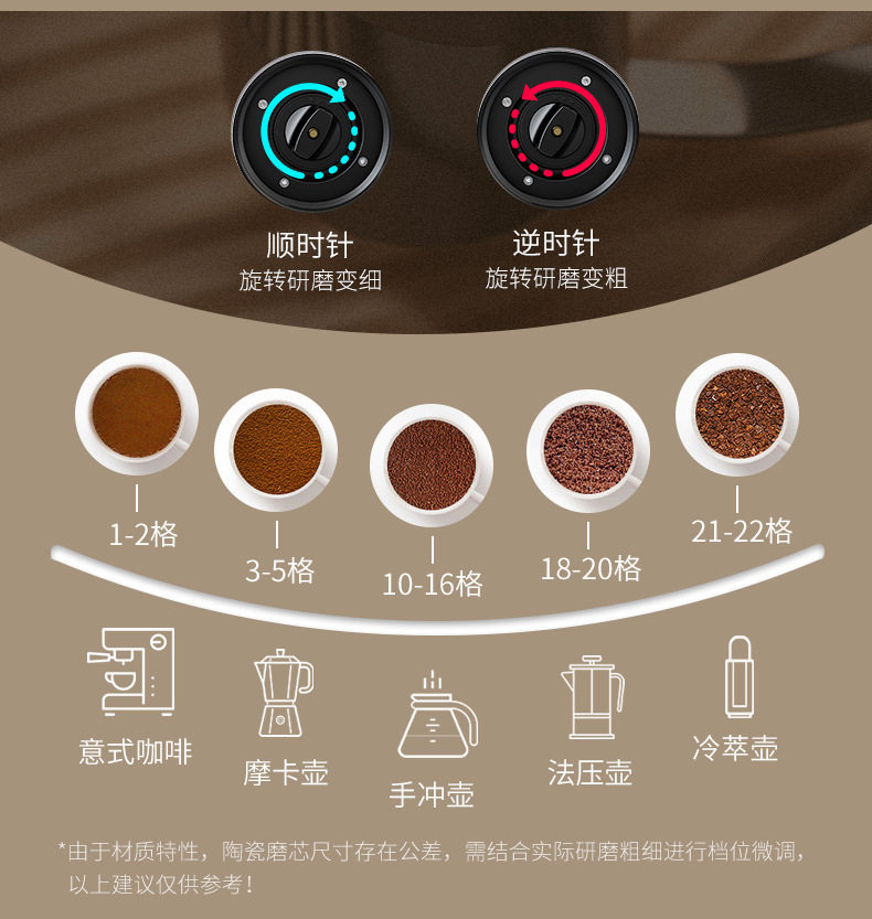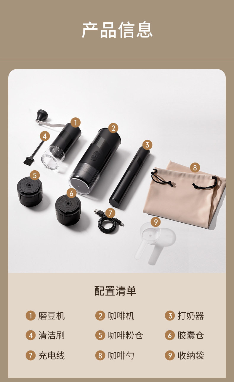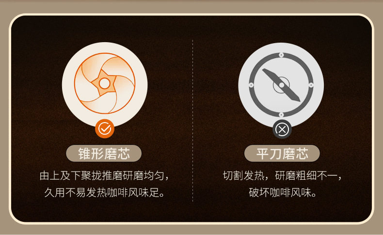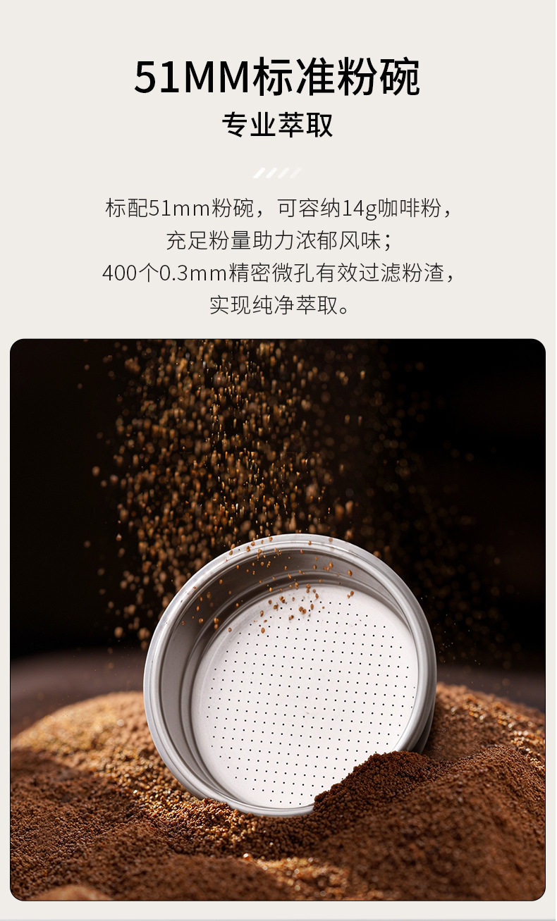 | Feature 1 | Standard 51mm bottomless powder bowl, made of 304 stainless steel, can hold 18g of coffee powder |