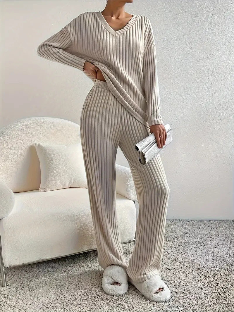 2025 Autumn and Winter Suit Cross-Border New Home Fashion Casual Straight Pants Elegant Loose V Neck Pit Strip Two-Piece Set