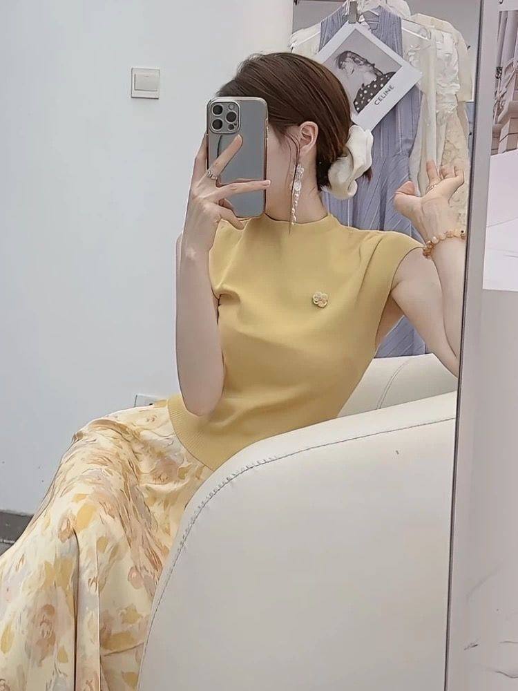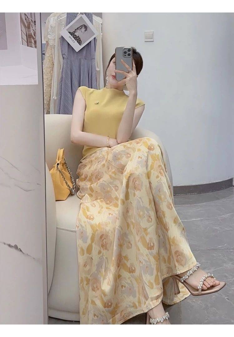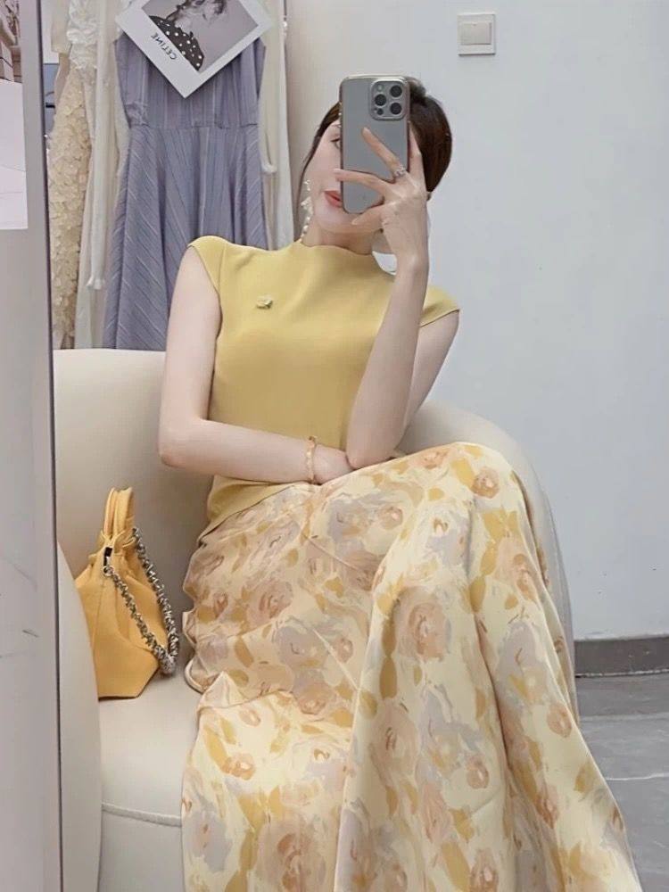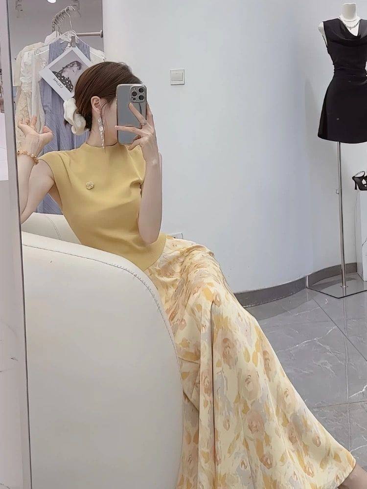 Summer Suit for Women 2025 New Style for Important Occasions, Beautiful Yellow Sleeveless Waist Top, Slim Skirt Two-Piece Set