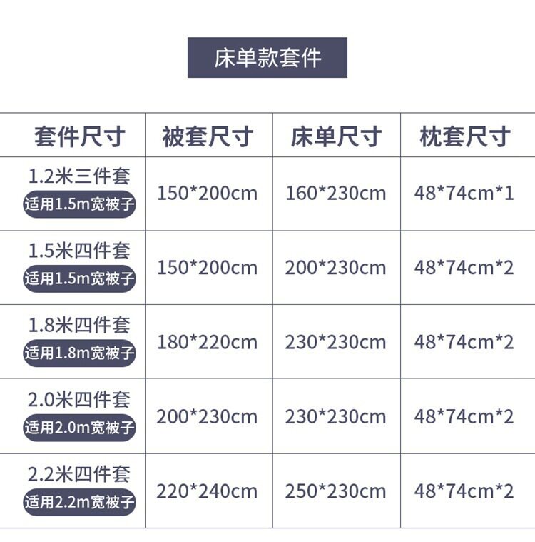 | Dimensions | 0.9m bed [three-piece sheet set] suitable for 150x200 quilt,1.2m bed [three-piece sheet set] suitable for 150x200 quilt,1.5m bed [sheet set of four] suitable for 150x220 quilt,1.8m bed [sheet set of four] suitable for 180x220 quilt,2.0m bed [sheet set of four] suitable for 200x230 quilt |