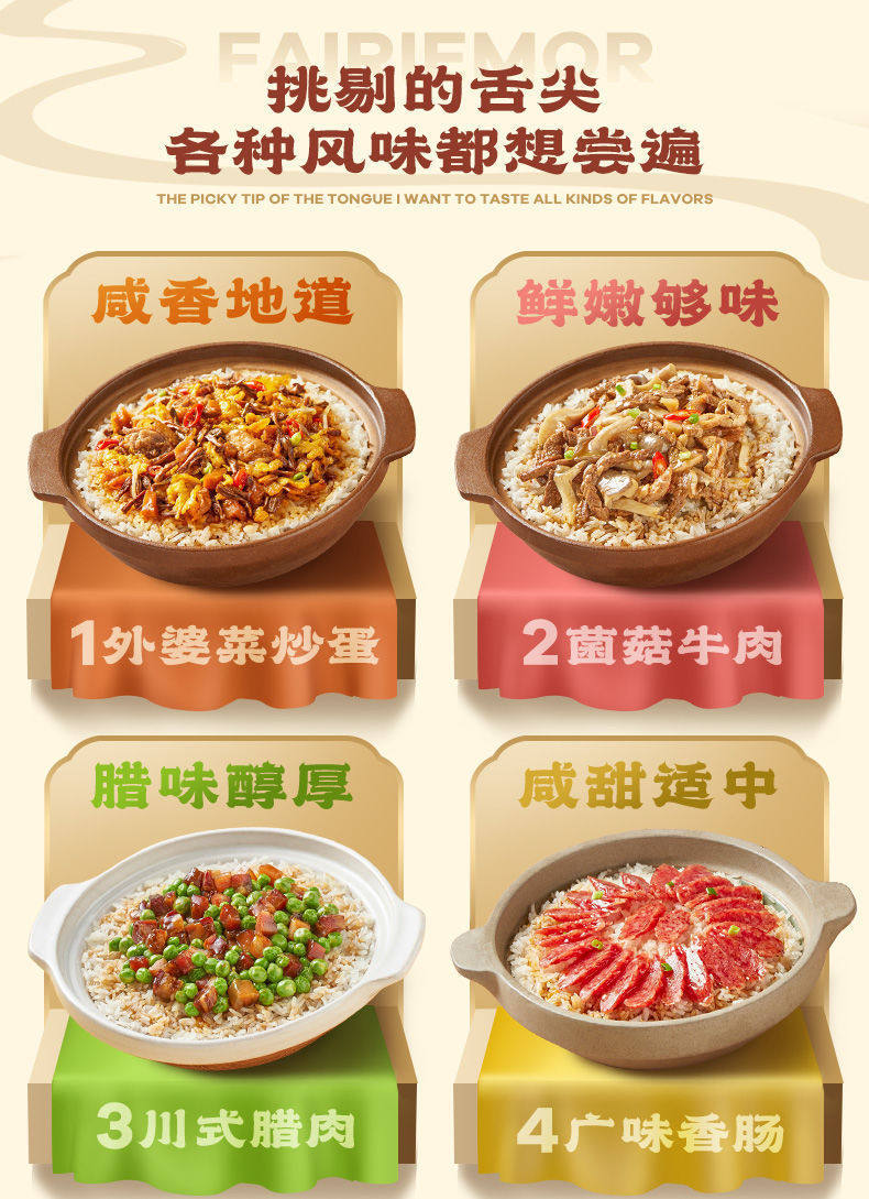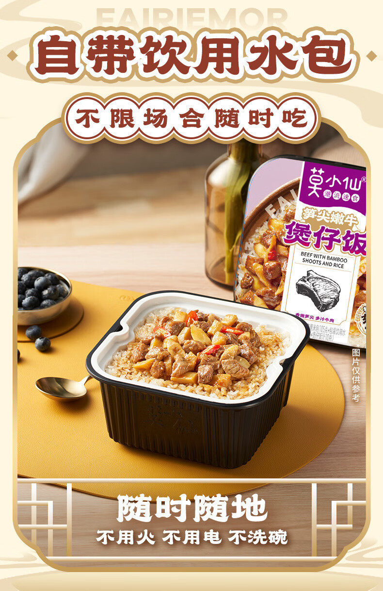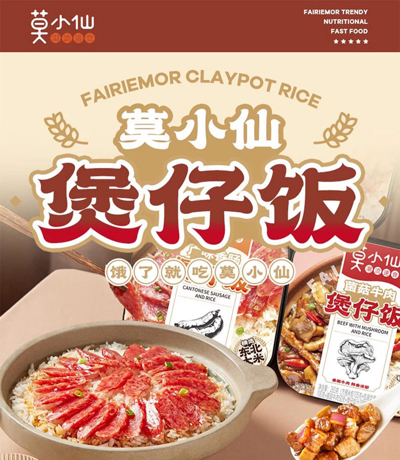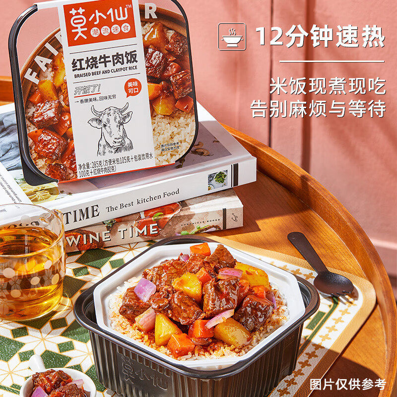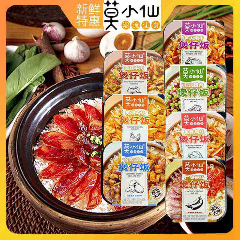 | Packaging specifications | Mo xiaoxian [braised beef] self-heating rice 285g (single box),Mo xiaoxian [grandma vegetable scrambled eggs] claypot rice 275g (single box),Mo xiaoxian [curry beef] self-heating rice 285g (single box),Mo xiaoxian [meat with pickled vegetables] self-heating rice 305g (single box),Mo xiaoxian [fish-flavored shredded pork] claypot rice 265g (single box),Mo xiaoxian [cantonese sausage] claypot rice 245g (single box),Mo xiaoxian [mushroom beef] claypot rice 265g (single box),Mo xiaoxian [taiwan braised pork] claypot rice 275g (single box),Mo xiaoxian [twice-cooked pork] claypot rice 275g (single box),Mo xiaoxian [sichuan style bacon] claypot rice 275g (single box),Mo xiaoxian [braised chicken nuggets] claypot rice 275g (single box),Mo xiaoxian [tender beef with bamboo shoots] claypot rice 275g (single box),Mo xiaoxian hot pot [maoxuewang] self-heating hot pot 340g (single box),Mo xiaoxian hot pot [malatang] self-heating hot pot 260g (single box),Mo xiaoxian hot pot [old chengdu hot pot] self-heating hot pot 300g (single box),Mo xiaoxian [spicy vegetarian] self-heating hot pot 240g (single box) |