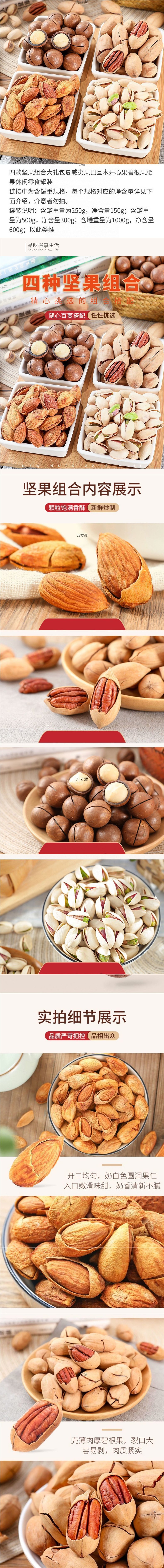 | Packaging specifications | Almond wood [250g*1 can],Almond wood [250g*2 cans],Macadamia nuts [250g*2 cans],Almonds + macadamia nuts [250g*1 can each],Pecans + macadamia nuts [250g*1 can each],Pecans + almonds [250g*1 can each],Pistachio + macadamia nut [250g*1 can each],Pistachio + almond [250g*1 can each],Pecans [250g*2 cans],Pistachio + pecan [250g*1 can each],Xia+bi+ba [250g*1 can each],Pistachios [250g*2 cans],Kai+ba+xia [250g*1 can each],Kai+bi+ba [250g*1 can each],Kai+bi+xia [250g*1 can each],One can each of kai+bi+xia+ba [classic four nuts],[four kinds of 0.5kg each] kai+bi+summer+ba |