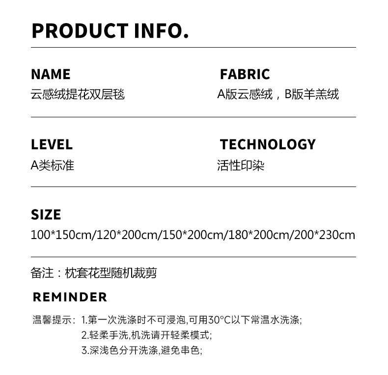 | Dimensions | Office blanket: 100x150cm [double-sided fleece-lined/can be spread or covered],Single blanket: 120x200cm [double-sided fleece-lined/can be spread or covered],Single blanket: 150x200cm [double-sided fleece-lined/can be spread or covered],Large single blanket: 180x200cm [double-sided fleece-lined/can be spread or covered],Double blanket: 200x230cm [double-sided fleece-lined/can be spread or covered],A pair of pillowcases |