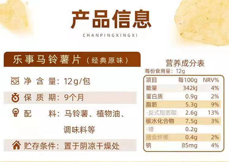 | Packaging specifications | §1 bag of original flavor 12g ⚑ ⚑,§1 bag of lime flavor 12g ⚑ ⚑,§1 bag of cucumber flavor 12g ⚑ ⚑,§1 bag of random flavors 12g ⚑ ⚑,§1 bag of red braised flavor 12g ⚑ ⚑,§1 bag bbq flavor 12g ⚑ ⚑,§1 bag of tomato flavor 12g ⚑ ⚑ |