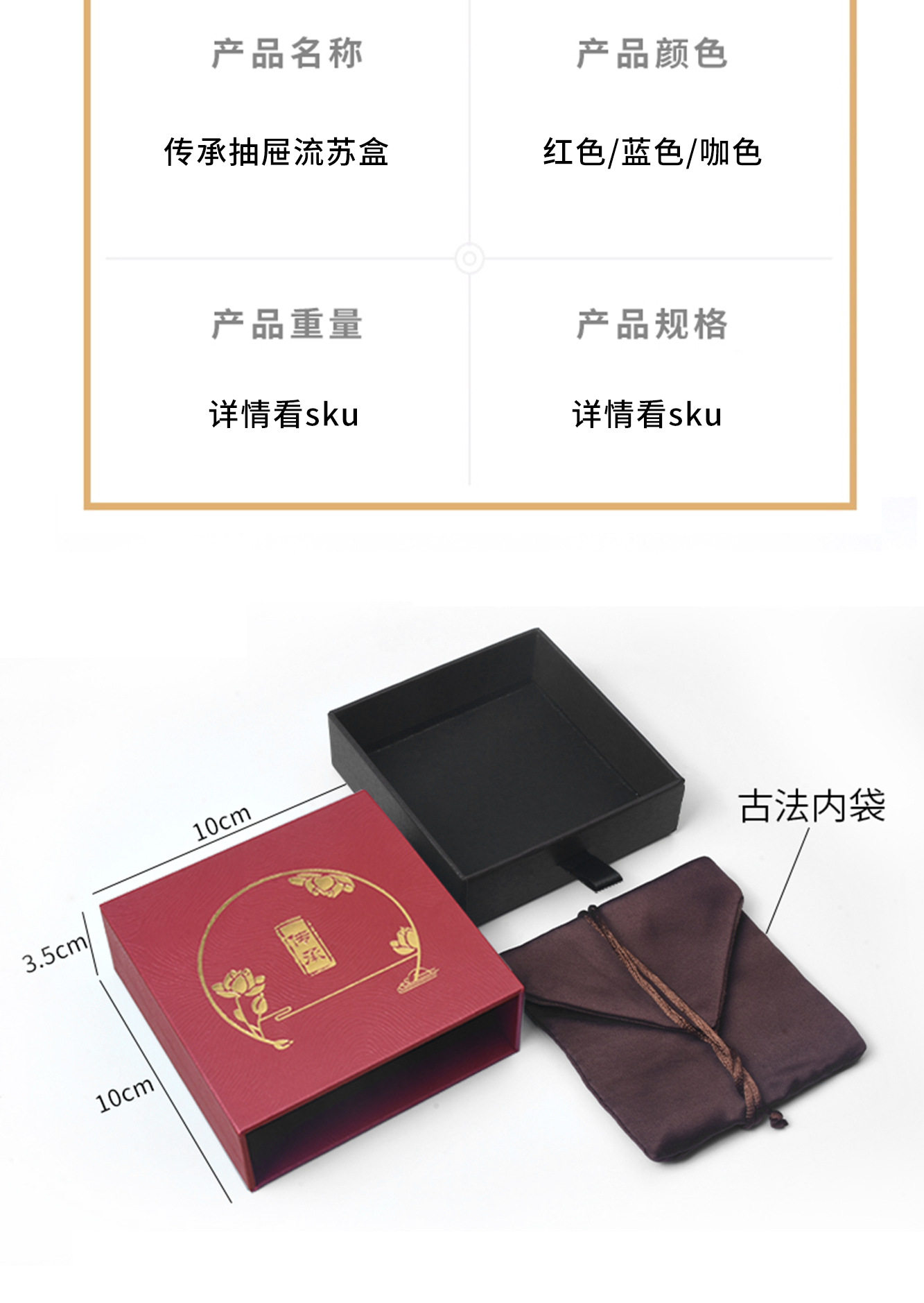 | Specifications and models | Red - heritage ribbon style (internal buckle); heritage drawer box,Red - heritage ribbon style (flannel bag); heritage drawer box,Brown color - heritage ribbon style (inner buckle); heritage drawer box,Brown color - heritage ribbon style (flannel bag); heritage drawer box,Blue - heritage ribbon style (internal buckle); heritage drawer box,Blue - heritage ribbon style (flannel bag); heritage drawer box,Red - heritage tassel style (internal buckle); heritage drawer box,Red - heritage tassel style (ancient bag); heritage drawer box,Brown color - heritage tassel style (inner buckle); heritage drawer box,Brown color - heritage tassel style (ancient bag); heritage drawer box,Blue - heritage tassel style (internal buckle); heritage drawer box,Blue - heritage tassel style (ancient bag); heritage drawer box,Red - heritage tassel style 11*11.5cm; heritage drawer box,Brown color - heritage tassel style 11*11.5cm; heritage drawer box,Blue - heritage tassel style 11*11.5cm; heritage drawer box,Red - heritage ribbon edition (foam base); heritage drawer box,Brown color - heritage ribbon style (sponge bottom); heritage drawer box,Blue - heritage ribbon edition (foam base); heritage drawer box |