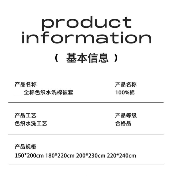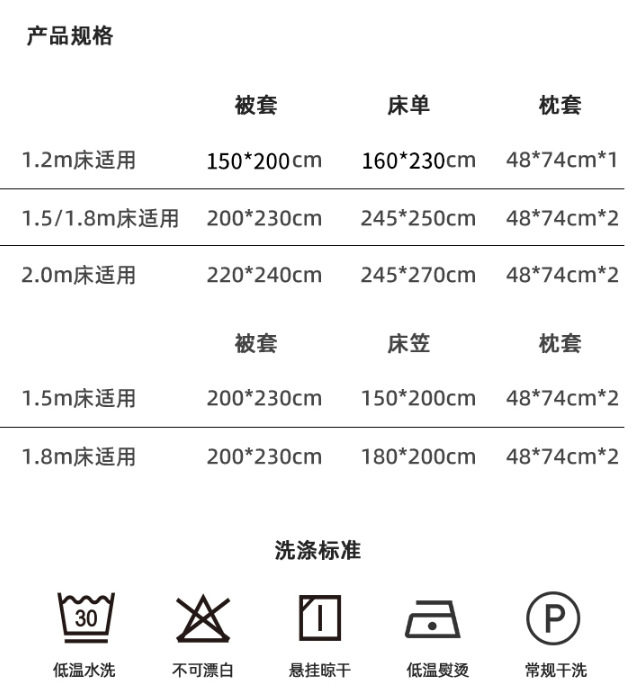 | Dimensions | 150x200cm single quilt cover,180x220cm single quilt cover,200x230cm single quilt cover,220x240cm single quilt cover,1.2m three-piece bed set [sheet 180x230 quilt cover 155x210],1.5m four-piece bed set [sheets 245x250 quilt cover 200x230],1.8m four-piece bed set [sheets 245x250 quilt cover 200x230],2.0m four-piece bed set [sheet 245x270 quilt cover 220x240],1.5m four-piece set of fitted sheets [fitted sheet 150x200 quilt cover 200x230],1.8m four-piece set of fitted sheets [fitted sheet 180x200 quilt cover 200x230] |