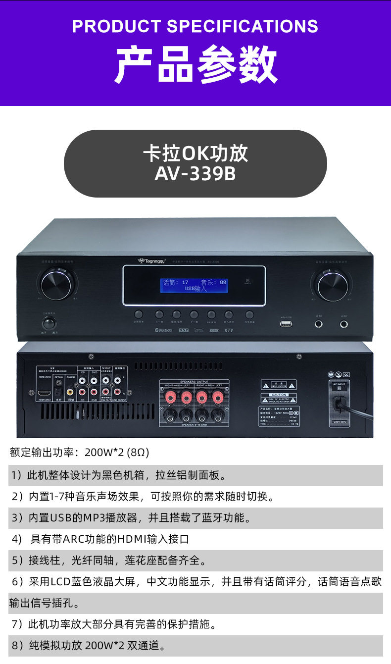 | Rated power | 200W*2 (8Ω) |