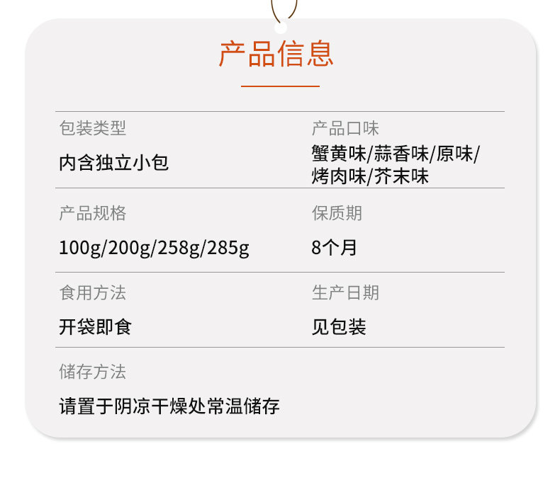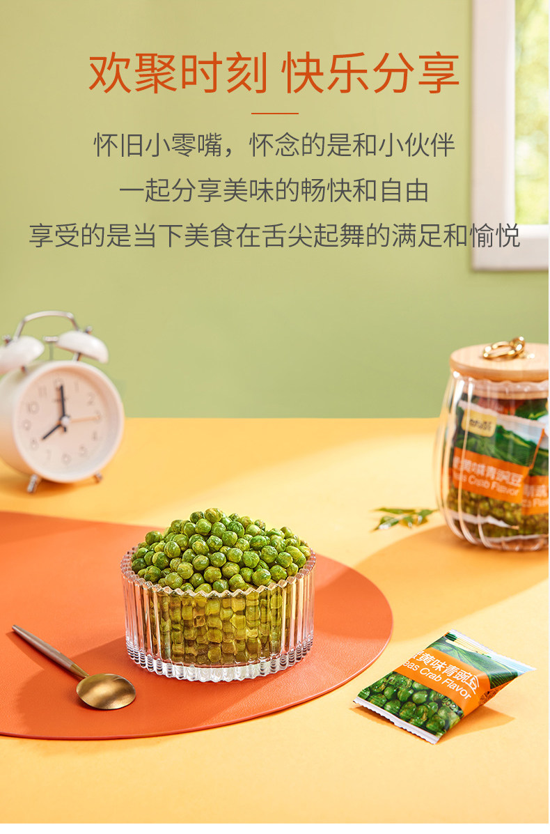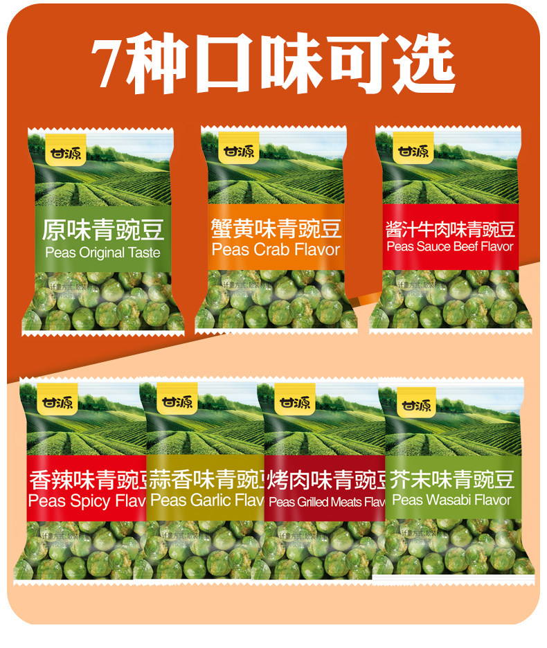 | Packaging specifications | 【 ★ Green peas] original flavor*200g [about 15 packs],【 ★ Green peas] original flavor*500g [about 40 packs],【 ★ Green peas] original flavor*1000g [about 80 packs],【 ★ Green peas] original flavor*1500g [about 120 packs],【 ★ Green peas] garlic flavor*200g [about 15 packs],【 ★ Green peas] garlic flavor*500g [about 40 packs],【 ★ Green peas] garlic flavor*1000g [about 80 packs],【 ★ Green peas] garlic flavor*1500g [about 120 packs],【 ★ Green peas] mustard flavor*200g [about 15 packs],【 ★ Green peas] mustard flavor*500g [about 40 packs],【 ★ Green peas] mustard flavor*1000g [about 80 packs],【 ★ Green peas] mustard flavor*1500g [about 120 packs],【 ★ Green peas] spicy flavor*200g [about 15 packs],【 ★ Green peas] spicy flavor*500g [about 40 packs],【 ★ Green peas] spicy flavor*1000g [about 80 packs],【 ★ Green peas] spicy flavor*1500g [about 120 packs],【 ★ Green peas] crab roe flavor*200g [about 15 packs],【 ★ Green peas] crab roe flavor*500g [about 40 packs],【 ★ Green peas] crab roe flavor*1000g [about 80 packs],【 ★ Green peas] crab roe flavor*1500g [about 120 packs],【 ★ Green peas] bbq flavor*200g [about 15 packs],【 ★ Green peas] barbecue flavor*500g [about 40 packs],【 ★ Green peas] bbq flavor*1000g [about 80 packs],【 ★ Green peas] barbecue flavor*1500g [about 120 packs],【 ★ Green peas] beef flavor*200g [about 15 packs],【 ★ Green peas] beef flavor*500g [about 40 packs],【 ★ Green peas] beef flavor*1000g [about 80 packs],【 ★ Green pea] beef flavor*1500g [about 120 packs],【 ★ Green peas] mixed *200g [about 15 packs],【 ★ Green peas] mixed *500g [about 40 packs],【 ★ Green peas] mixed *1000g [about 80 packs],【 ★ Green peas] mixed*1500g [about 120 packs] |