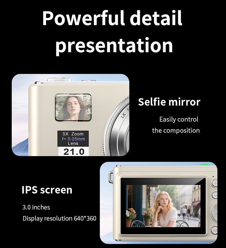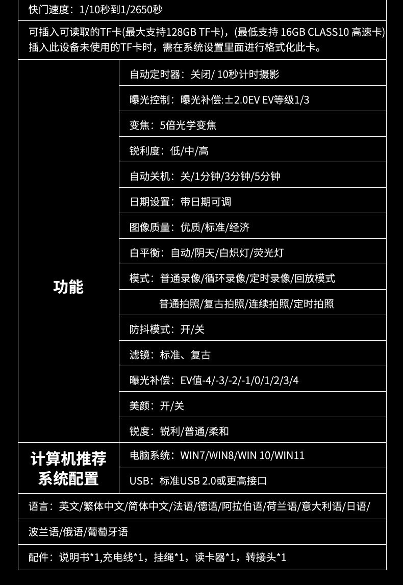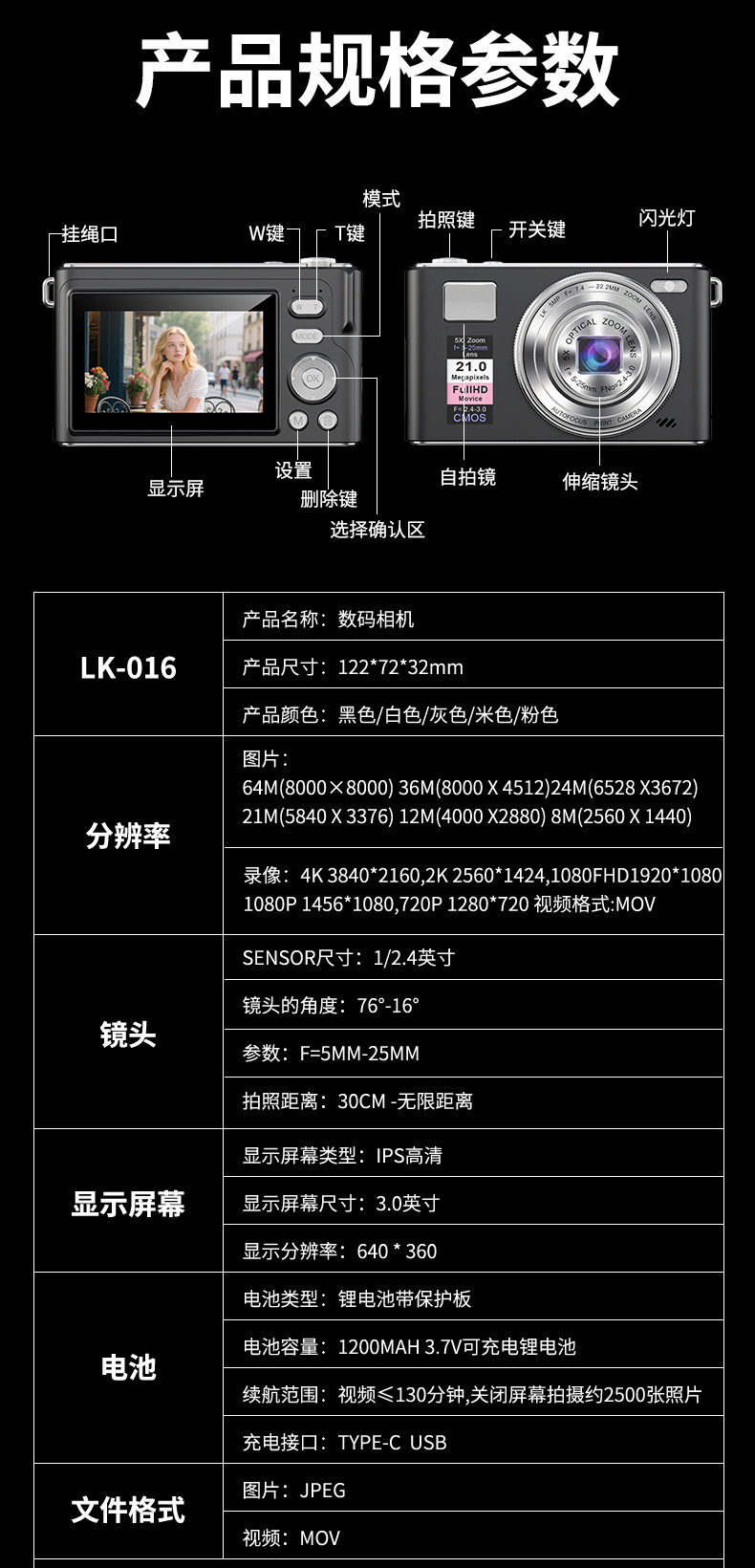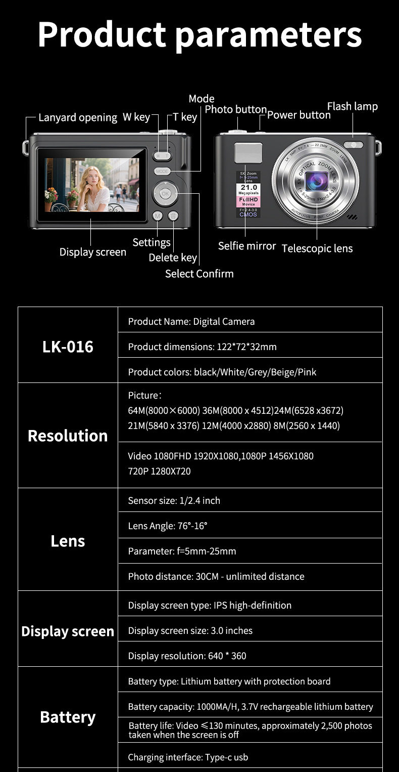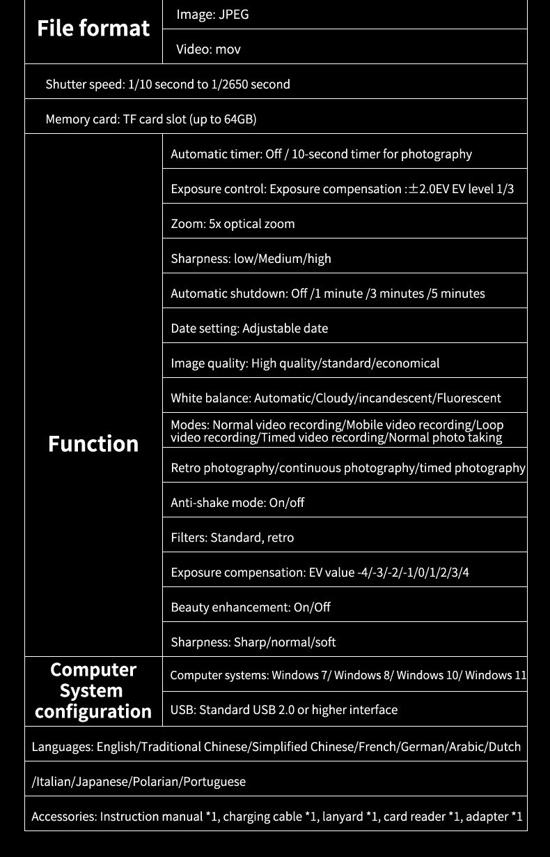 | Body color | Deep black camera + charging cable + lanyard + card reader + adapter,Elegant white camera + charging cable + lanyard + card reader + adapter,Gun gray camera + charging cable + lanyard + card reader + adapter,Champagne color camera + charging cable + lanyard + card reader + adapter,Sakura pink camera + charging cable + lanyard + card reader + adapter,Deep black camera + 32g memory card + charging cable + lanyard + card reader + adapter,Elegant white camera + 32g memory card + charging cable + lanyard + card reader + adapter,Gun gray camera + 32g memory card + charging cable + lanyard + card reader + adapter,Champagne color camera + 32g memory card + charging cable + lanyard + card reader + adapter,Sakura pink camera + 32g memory card + charging cable + lanyard + card reader + adapter,Deep black camera + 64g memory card + charging cable + lanyard + card reader + adapter,Elegant white camera + 64g memory card + charging cable + lanyard + card reader + adapter,Gun gray camera + 64g memory card + charging cable + lanyard + card reader + adapter,Champagne color camera + 64g memory card + charging cable + lanyard + card reader + adapter,Sakura pink camera + 64g memory card + charging cable + lanyard + card reader + adapter |