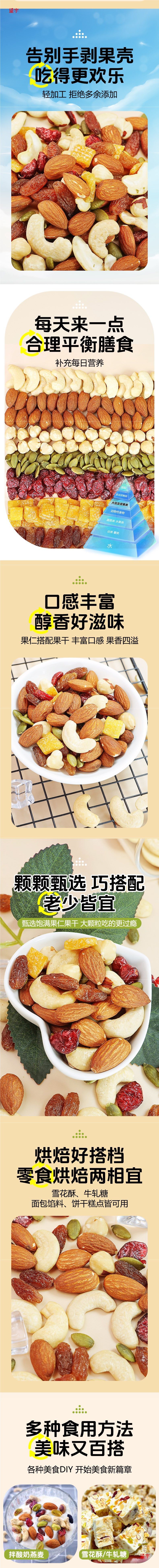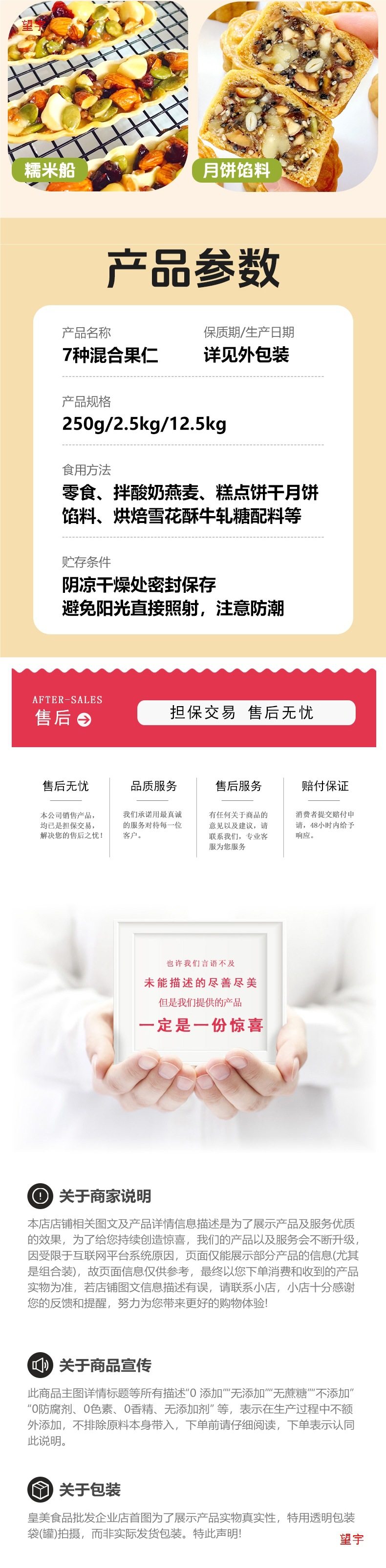 | Packaging specifications | Mixed dried fruits (nut cereal package) 250g*1 bag,7 kinds of mixed dried nuts 250g*1 bag,7 kinds of mixed dried nuts 250g*2 bags,7 kinds of mixed dried nuts 250g*4 bags,7 kinds of mixed dried nuts 2.5kg*1 bag,7 kinds of mixed dried nuts 2.5kg [10 aluminum foil bags included],7 kinds of mixed dried nuts 12.5kg [full box batch],5 kinds of mixed pure nuts 250g*1 bag [pure nuts],5 kinds of mixed pure nuts 250g*2 bags [pure nuts],5 kinds of pure nuts 2.5kg*1 bag [full box shipment],5 kinds of pure nuts 2.5kg [10 aluminum foil bags included],Mixed dried fruits (nut cereal package) 250g*2 bags,Mixed dried fruits (nut cereal package) 2.5kg*1 bag,Mixed dried fruits (nut cereal package) 2.5kg*4 bags |