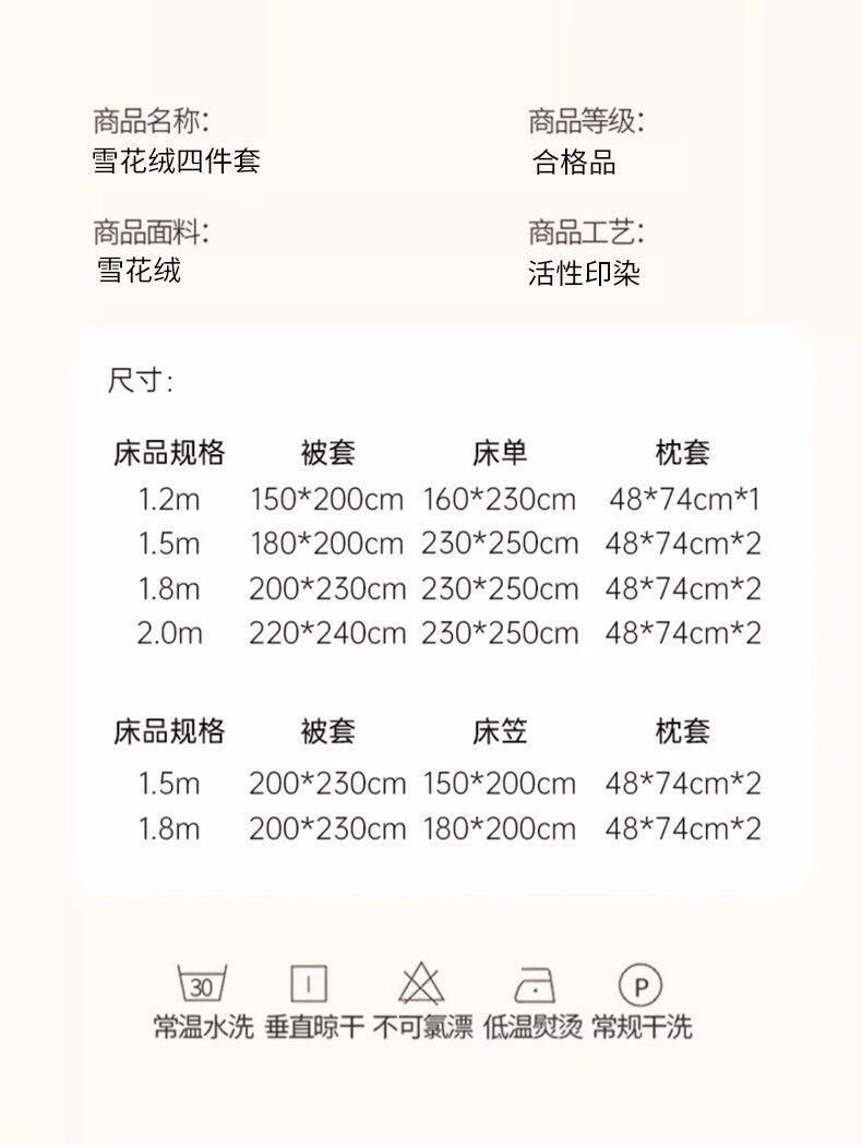 | Size specifications | Single - single quilt cover [suitable for 150x200 quilt],Double-single quilt cover [suitable for 180x220 quilt],Double-single quilt cover [suitable for 200x230 quilt],Large size - single quilt cover [suitable for 220x240 quilt],Three-piece single quilt cover set: 150x200 quilt cover + a pair of pillowcases,Double three-piece quilt cover: 180x220 quilt cover + a pair of pillowcases,Three-piece double quilt cover set: 200x230 quilt cover + pair of pillowcases,Double three-piece quilt cover set: 220x240 quilt cover + a pair of pillowcases,0.9m bed [three-piece bed sheet set] suitable for 150x200 quilt,1.2m bed [three-piece bed sheet set] suitable for 150x200 quilt,1.5m bed [sheet set of four] suitable for 200x230 quilt,1.8m bed [sheet set of four] suitable for 200x230 quilt,2.0m bed [sheet set of four] suitable for 220x240 quilt,Four-piece set 1.5m fitted sheet - suitable for 200x230 quilt,Four-piece set 1.8m fitted sheet - suitable for 200x230 quilt |
