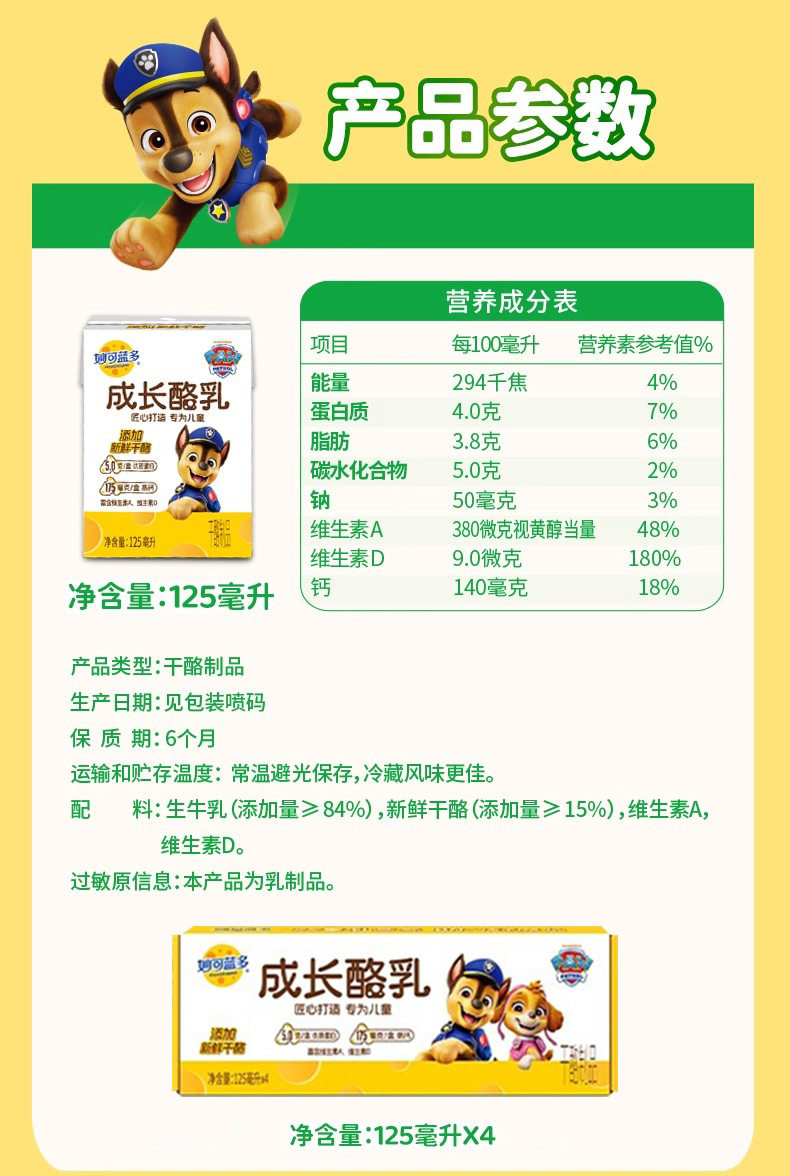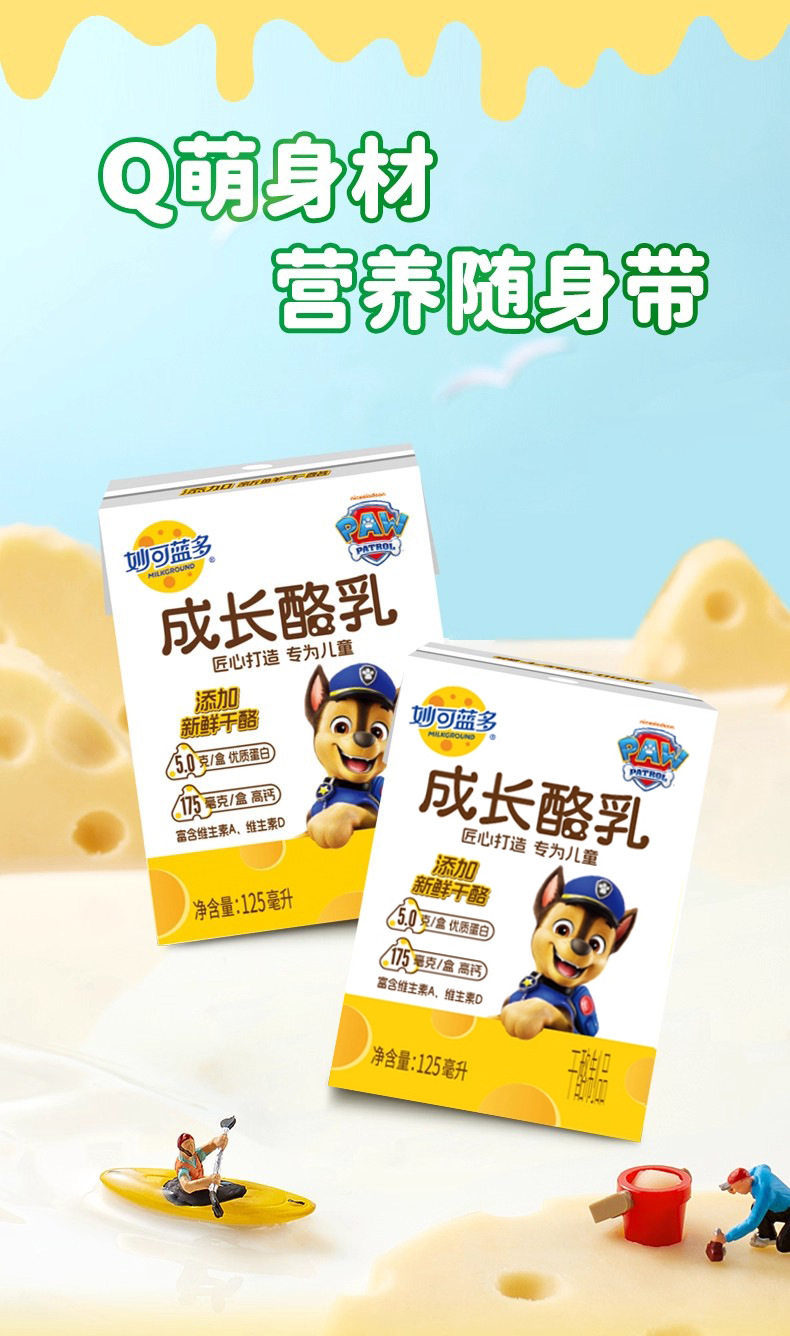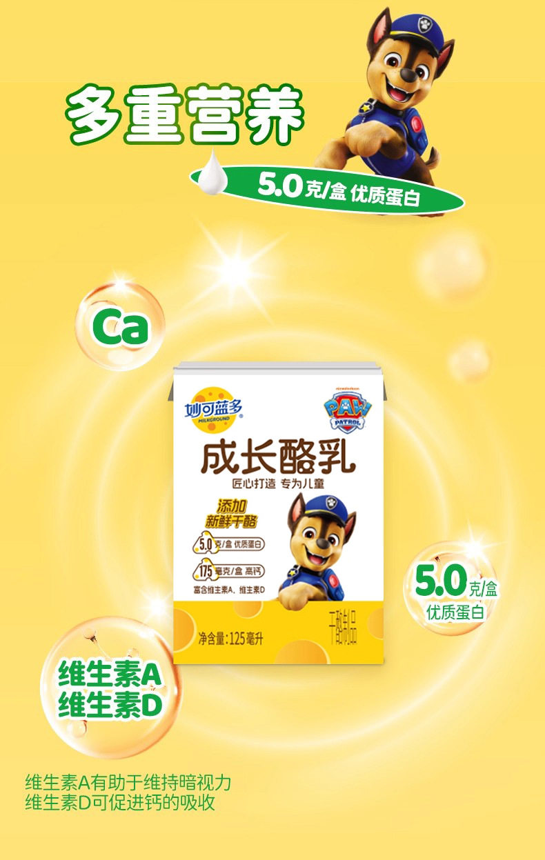 | Packaging specifications | [4 bottles/1 box] miaokelanduo growth buttermilk 125ml,[12 bottles/3 boxes] miaokelanduo growth buttermilk 125ml,[24 bottles/6 boxes] miaokelanduo growth buttermilk 125ml |