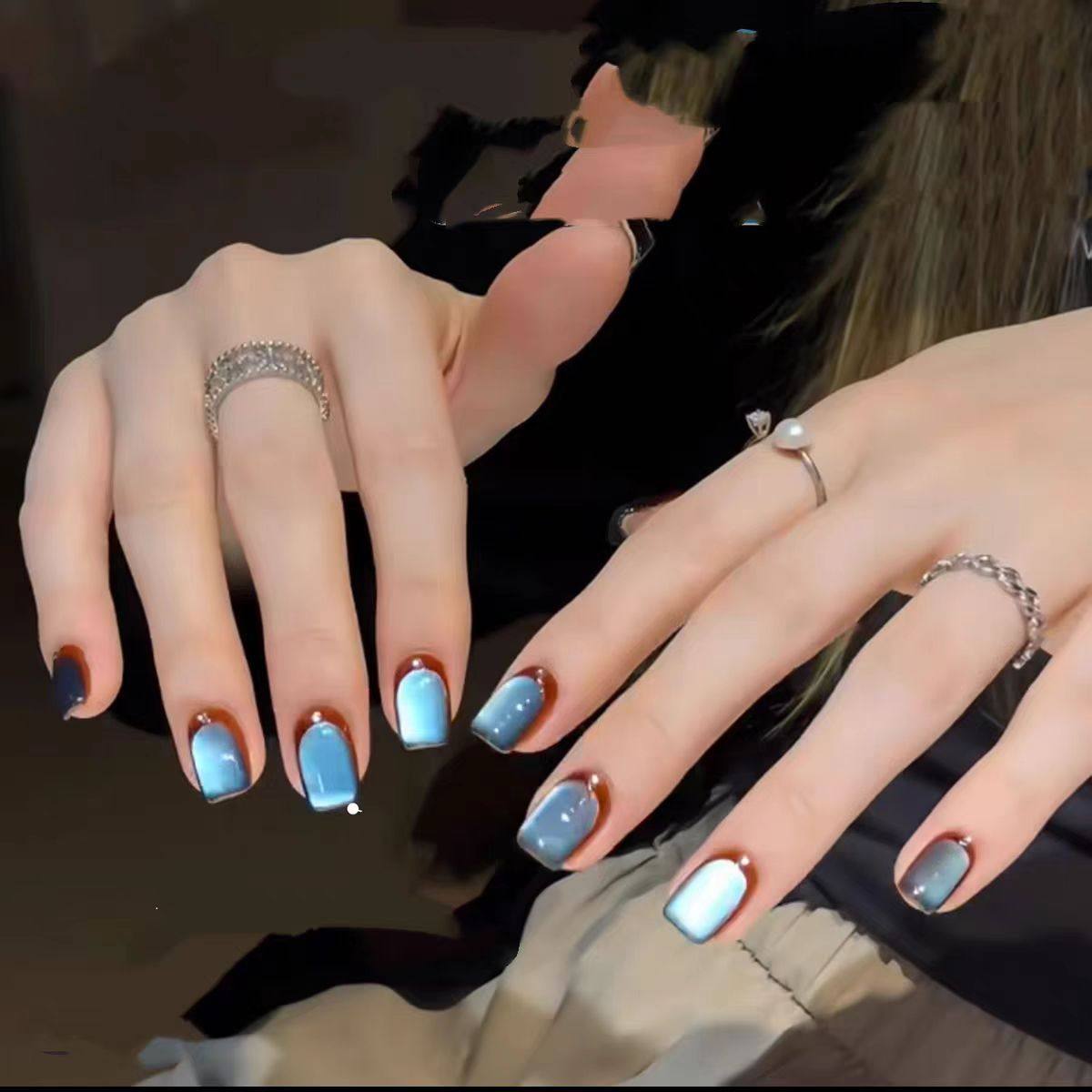 Handmade Nails Brown Blue Half French Secret Blue Sea Glass Beads Cat Eye Nails New Flash Amber Manicure