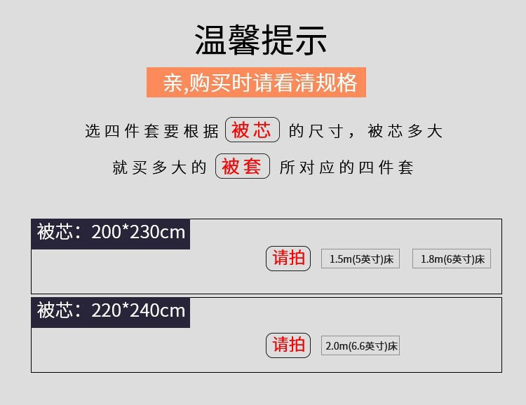 | Size specifications | 1.5m bed sheet (suitable for quilt core 200*230),1.8m bed sheet (suitable for quilt core 200*230),2.0m bed sheet (suitable for quilt core 220*240),Customized non-returnable 1.5m fitted sheet (suitable for quilt core 200*230 and mattress thickness within 20cm),Customized non-returnable 1.8m fitted sheet (suitable for quilt core 200*230 and mattress thickness within 20cm),Customized non-returnable 1.8m fitted sheet (suitable for quilt core 220*240 mattress thickness within 27cm) |