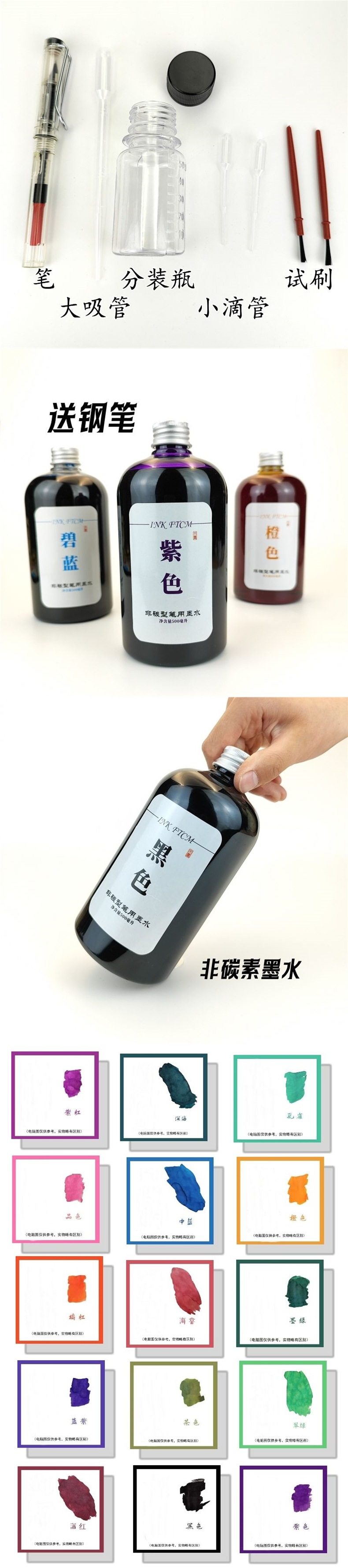 Student Ink Fountain Pen Color Ink Non-Carbon Ink 500ml Large Bottle Practice Calligraphy Dye Card Tracing Graffiti Brush