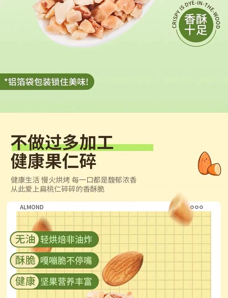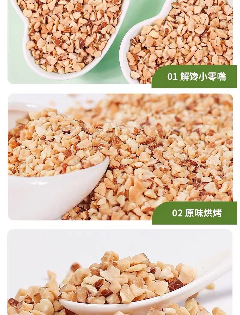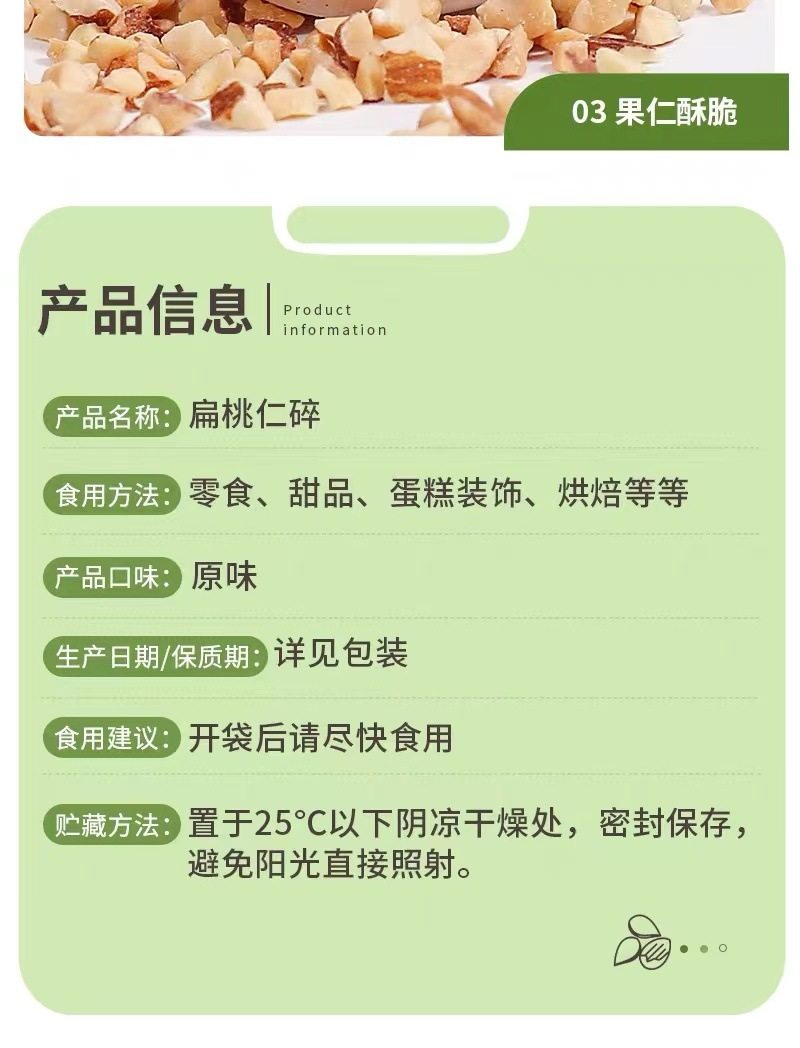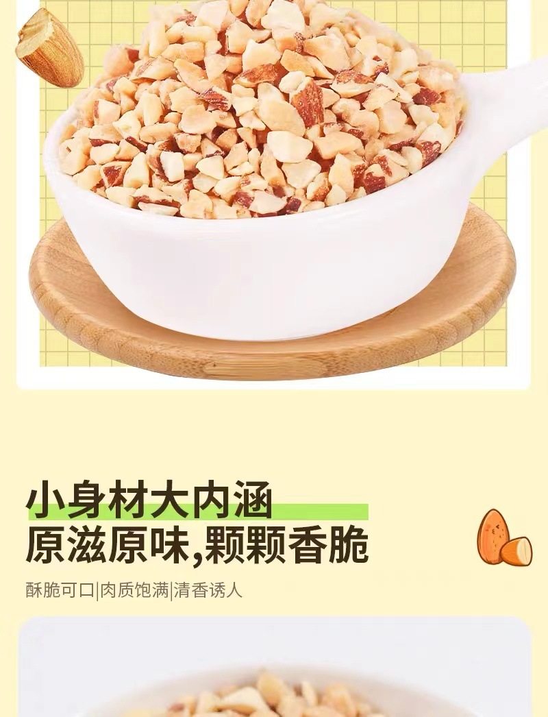 | Packaging specifications | Almond crushed kernels 250g*1 bag,Almond broken kernels 250g*2 bags,Almond broken kernels 250g*4 bags |