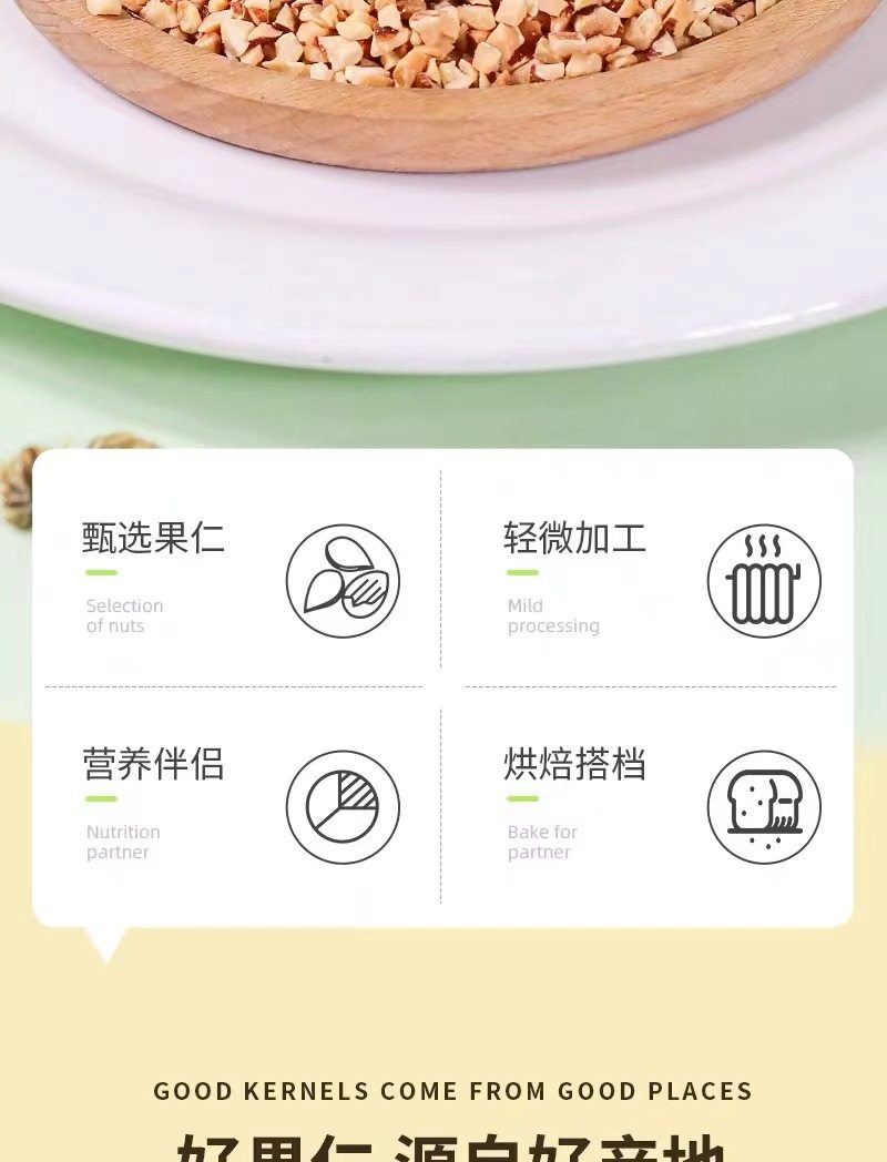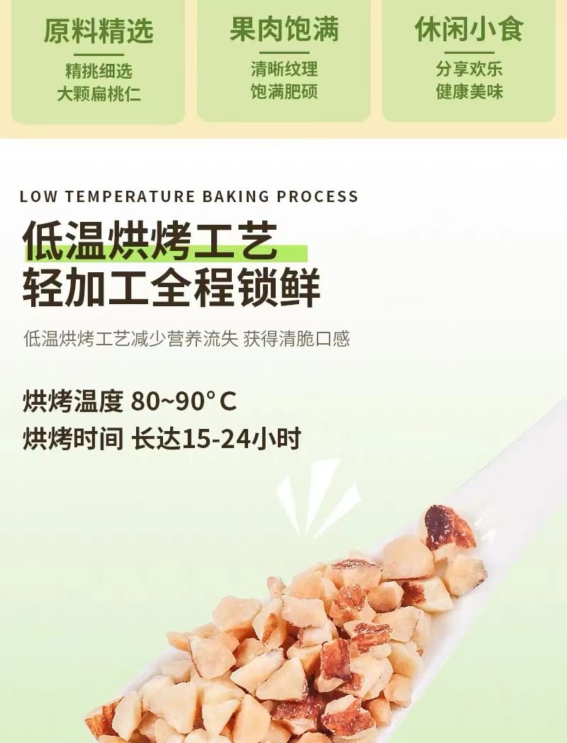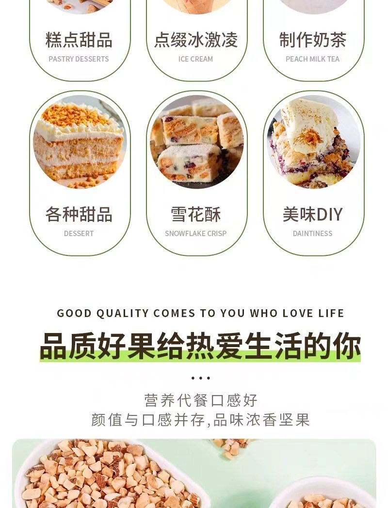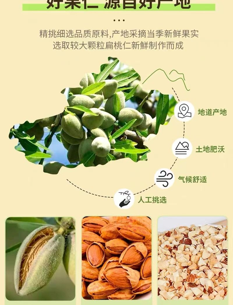 | Packaging specifications | Almond crushed kernels 250g*1 bag,Almond broken kernels 250g*2 bags,Almond broken kernels 250g*4 bags |