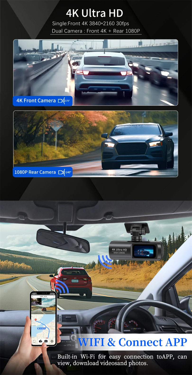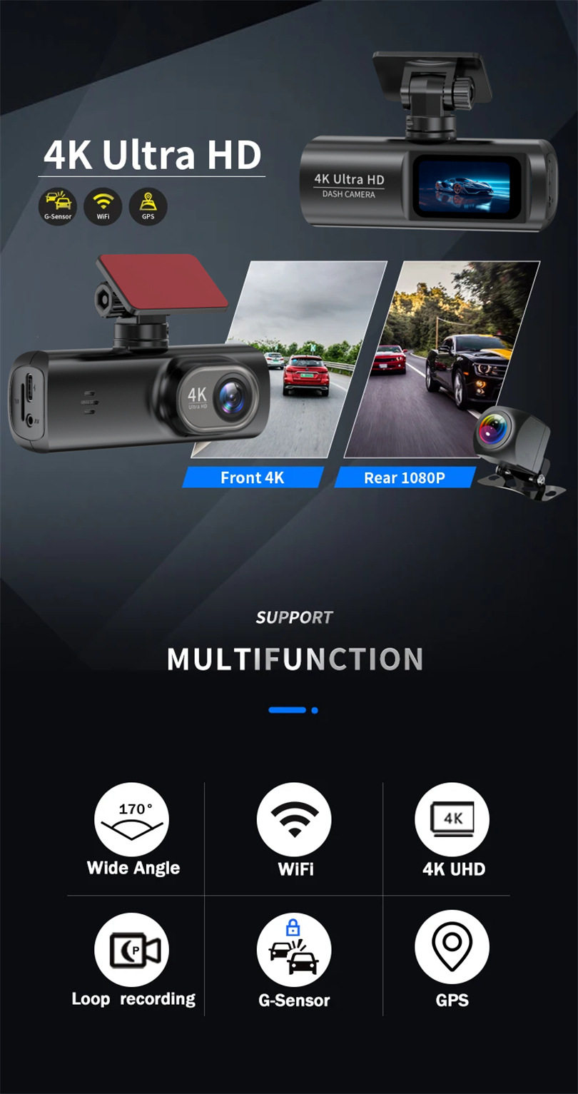 Cross-Border Best-Selling 4K High-Definition Night Vision Driving Recorder, Front and Rear Dual Recording Car Dvr Wifi Interconnection Gps Track