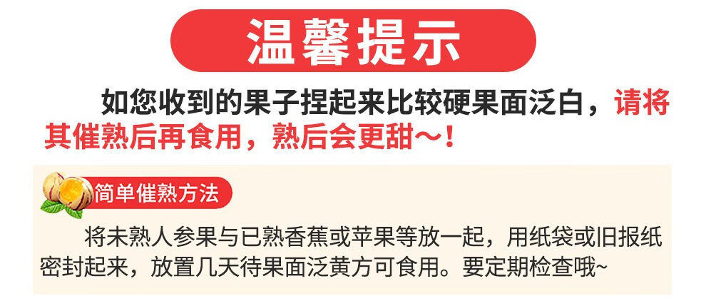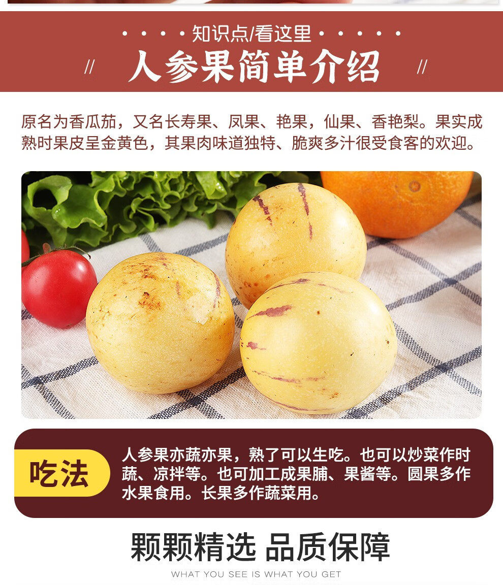 | Packaging specifications | 【ginseng fruit】 0.5kg small fruits,【ginseng fruit】 1.5kg small fruits,【ginseng fruit】 1.5kg medium fruits (about 16-25 pieces),【ginseng fruit】 1.5kg large fruits (about 12-16 pieces),【ginseng fruit】 2.5kg small fruits,【ginseng fruit】 2.5kg medium fruits (about 28-45 pieces),【ginseng fruit】 2.5kg large fruits (about 21--28 pieces) |