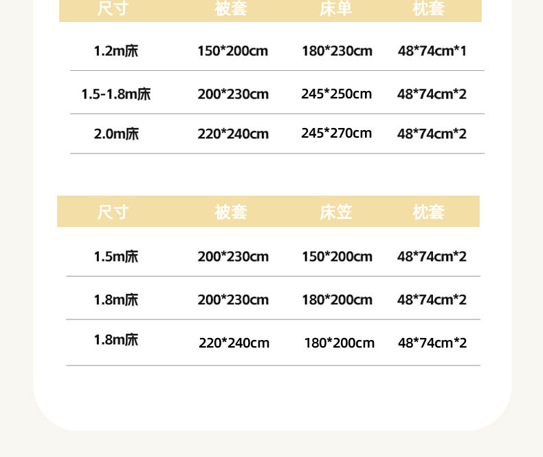| Size specifications | 1.2m bed sheet three-piece set,1.5m bed sheet four-piece set,1.8m bed sheet four-piece set,2.0m bed sheet four-piece set,1.5m fitted sheet set of four,1.8m fitted sheet set of four,1.8m fitted sheet quilt cover plus four-piece set,Quilt cover 150*200cm,Quilt cover 200*230cm,Quilt cover 220*240cm |