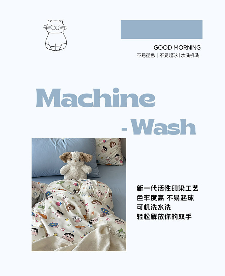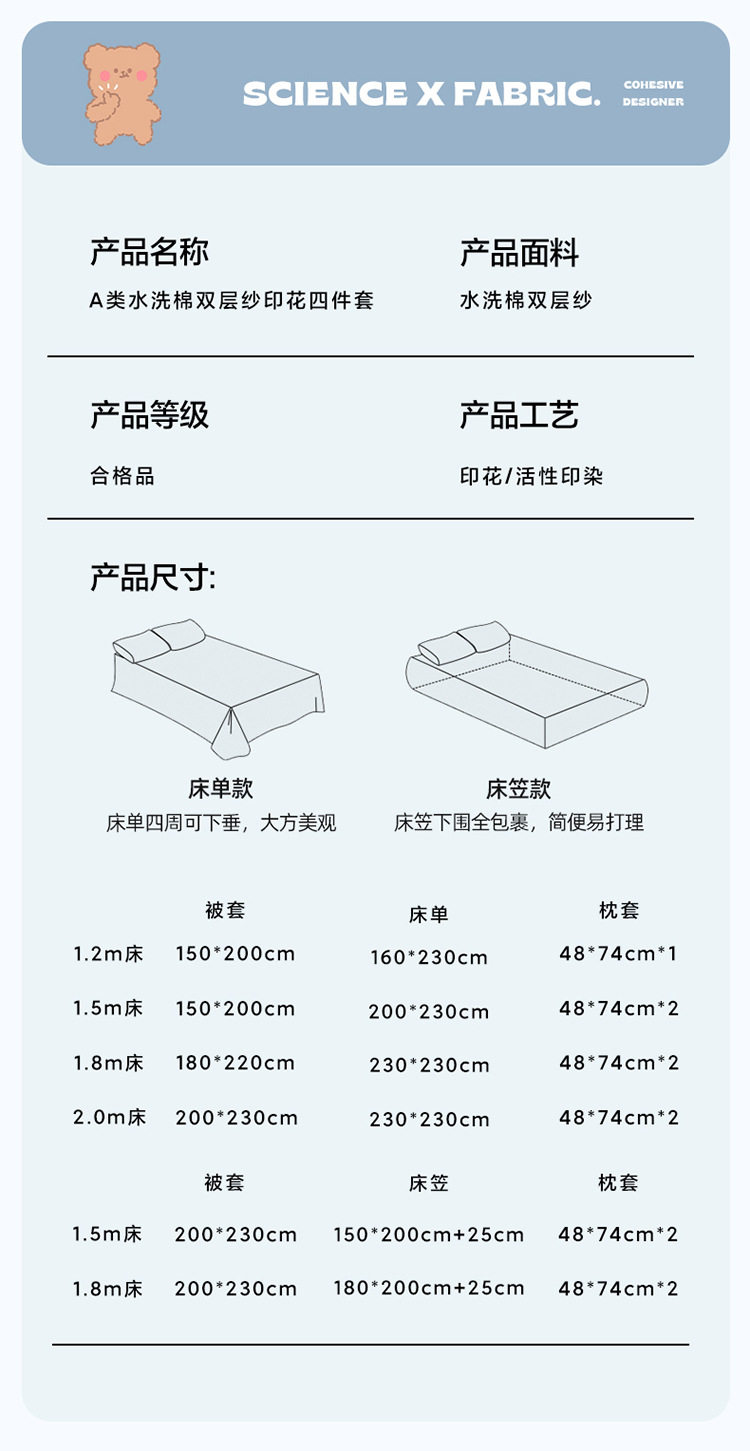 | Size specifications | 0.9m three-piece bed sheet set-quilt cover 150x200,1.2m bed sheet three-piece set-quilt cover 150x200,1.5m bed sheet four-piece set-quilt cover 150x200,1.8m bed sheet four-piece set-quilt cover 180x220,2.0m bed sheet four-piece set-quilt cover 200x230,1.5m fitted sheet set of four-quilt cover 200x230,1.8m fitted sheet set of four-quilt cover 200x230 |