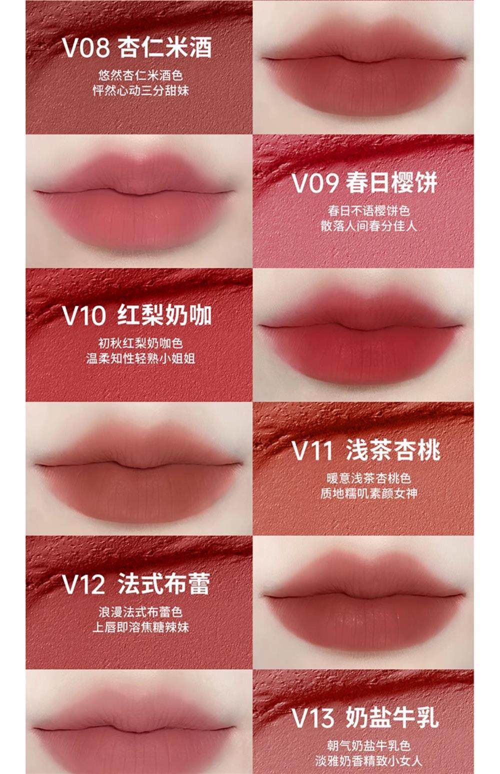 | Color | V01 earl grey milk tea,V02 millennium tomato,V03 hazelnut soufflé,V04 plum red wine,V06 yangmei nectar,V07 white peach sake,V08 almond rice wine,V09s # Spring sakura cake [hot sale],V10 red pear milk coffee,V11 light tea apricot,V12 french brie,V13 milk salt milk,V14 # Crimson glass,V15 smoke powder plum,V–25 # Night banquet crimson,V26 danfeng drunk cherry blossom,V27 # Orange sea shimmer,V31 # Out of focus peach wood,V 32 # Cold tea slowly heats up,V34 # Maple orange,V36 rose muse |