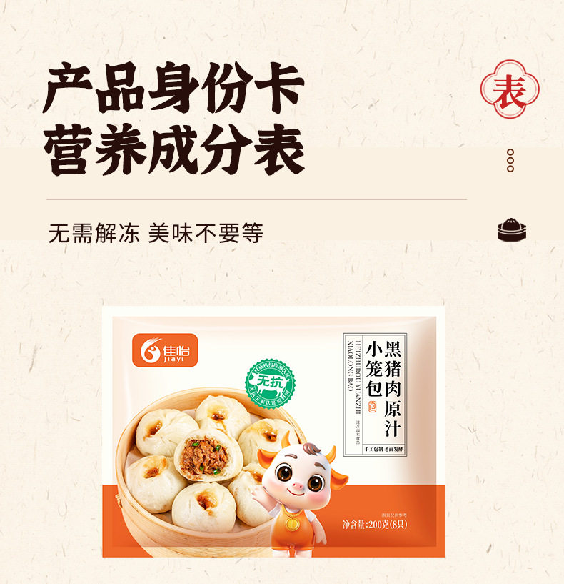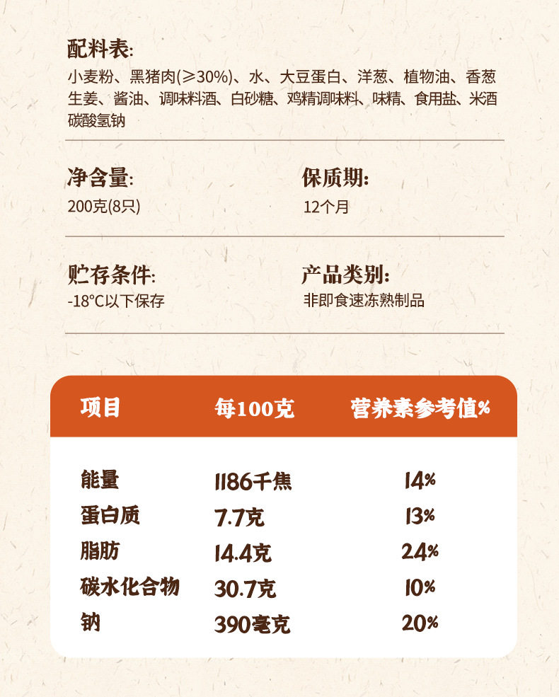 | Packaging specifications | Black pork original soup dumplings 25g*8 pieces*1 bag |